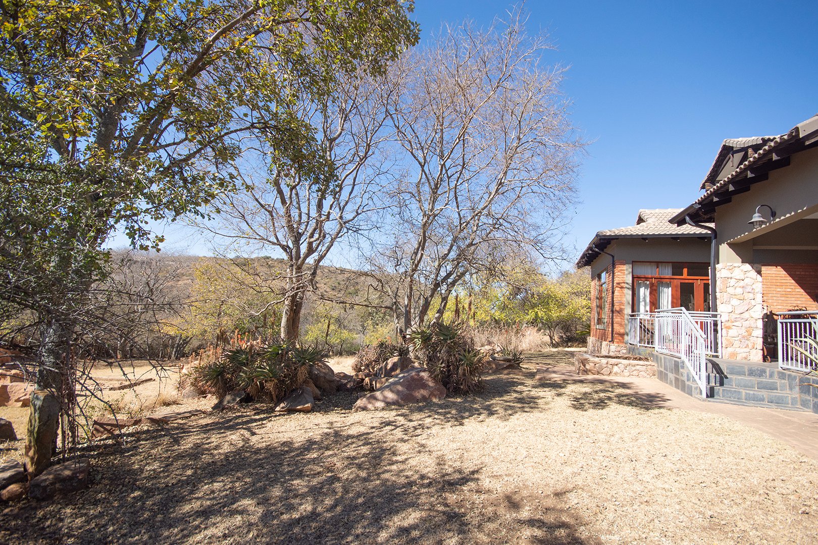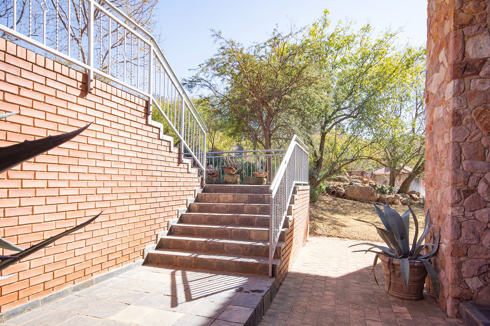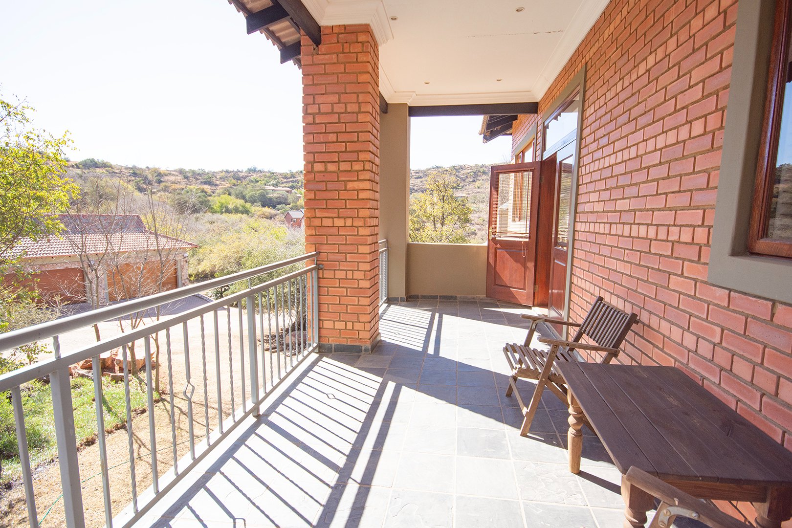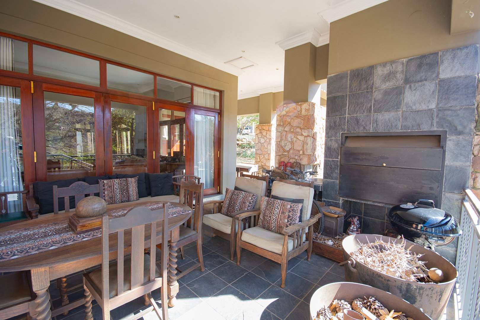 The patio, ideal for entertaining, features a braai area and offers breathtaking views of the surrounding nature. The estate’s abundant wildlife often visits, providing a unique and delightful experience for residents.