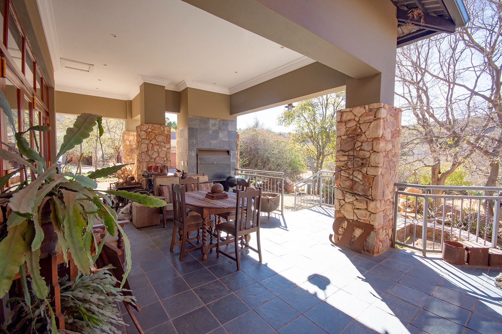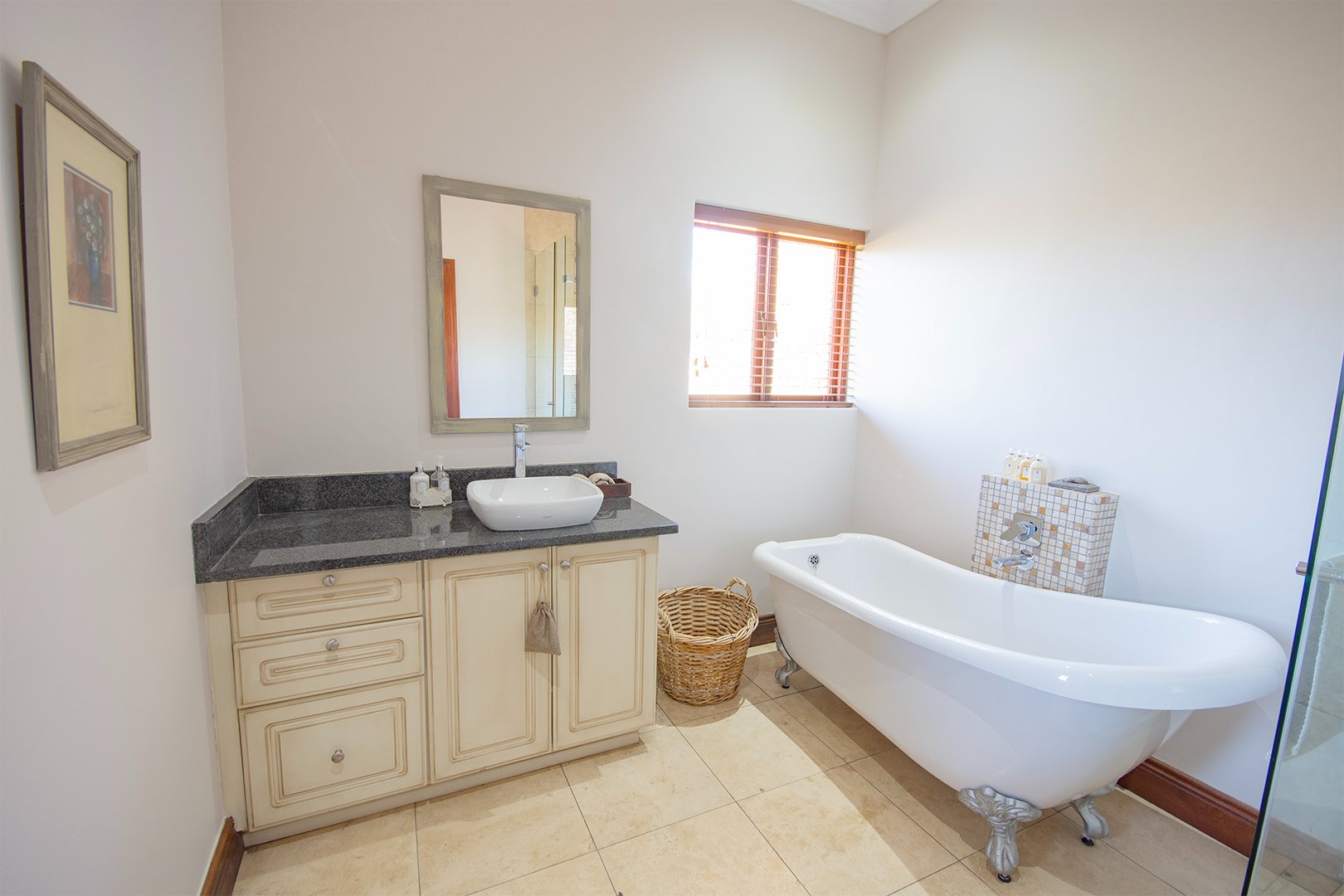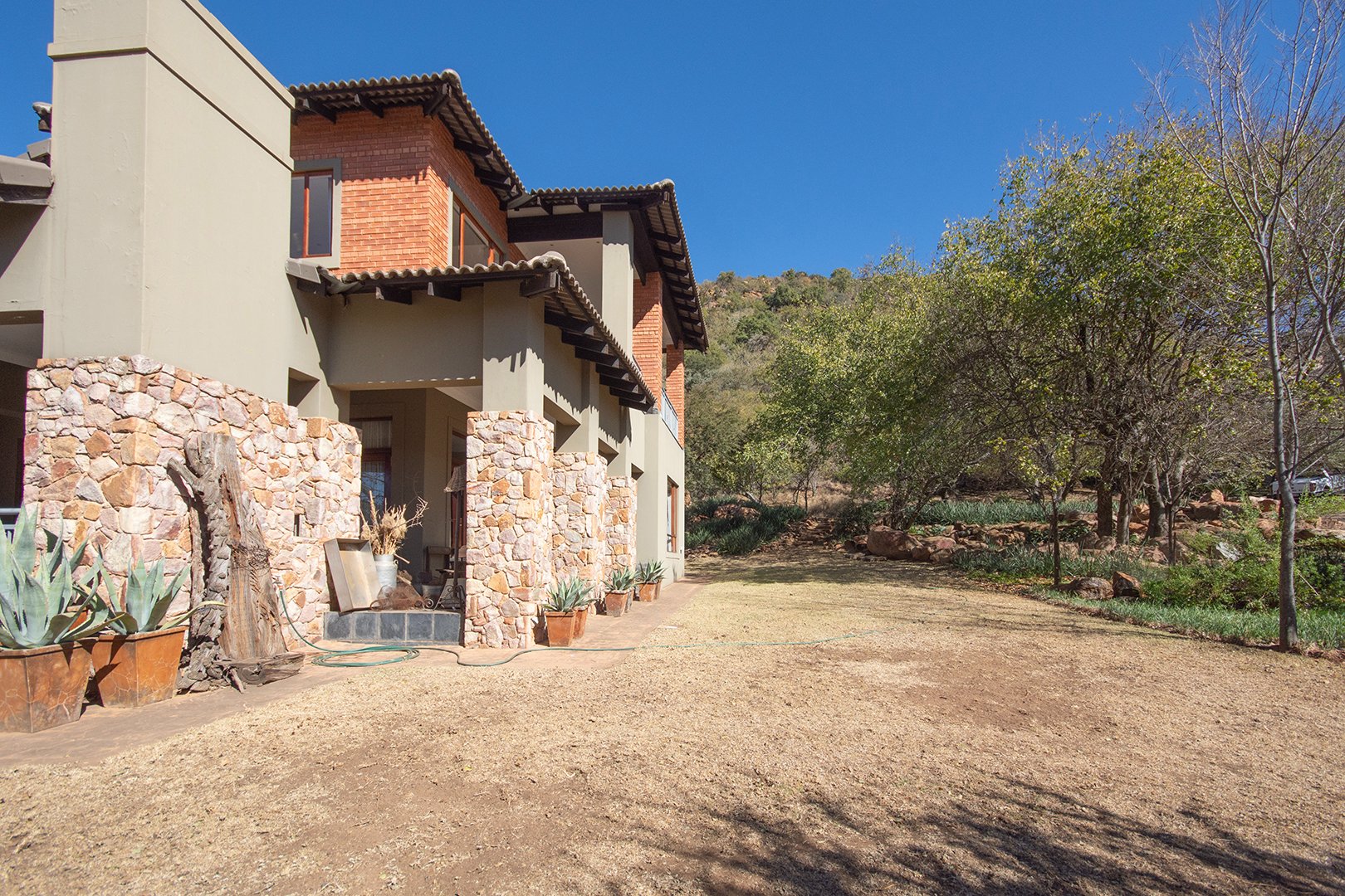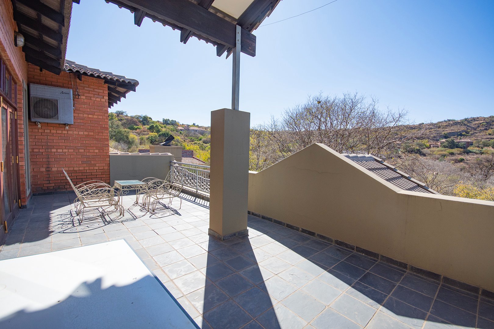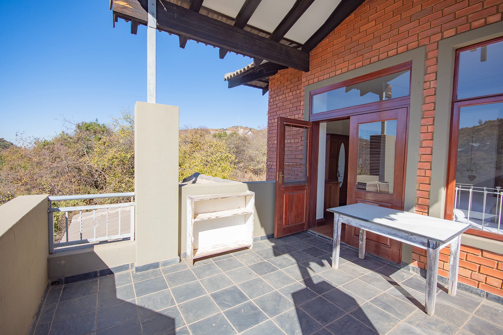 The patio, ideal for entertaining, features a braai area and offers breathtaking views of the surrounding nature. The estate’s abundant wildlife often visits, providing a unique and delightful experience for residents.