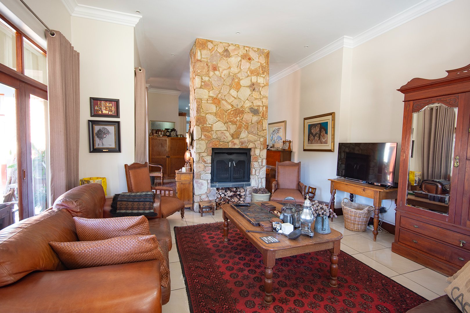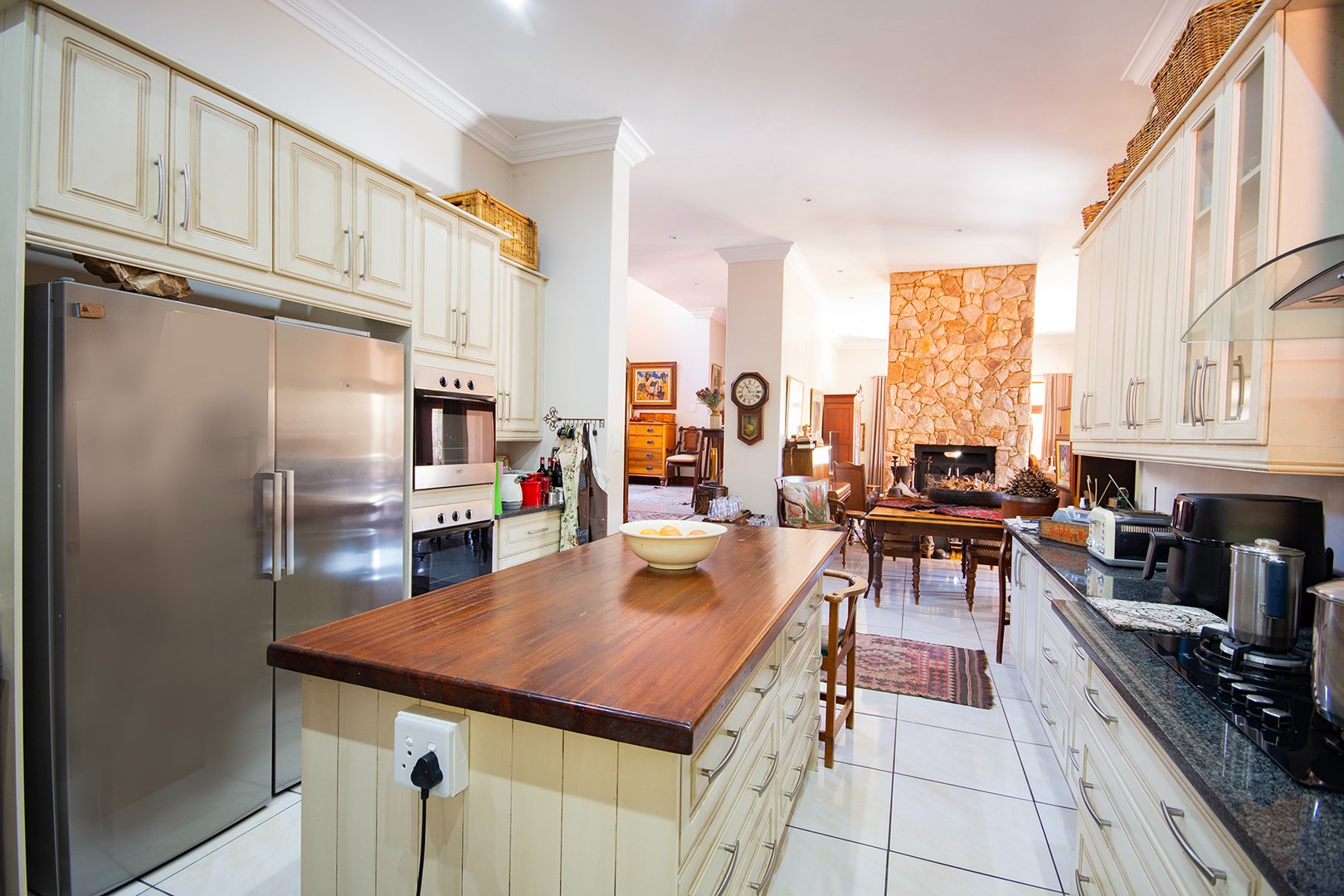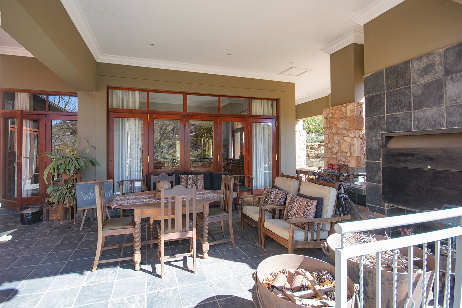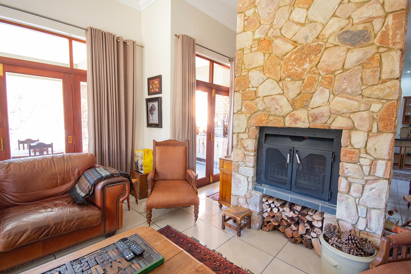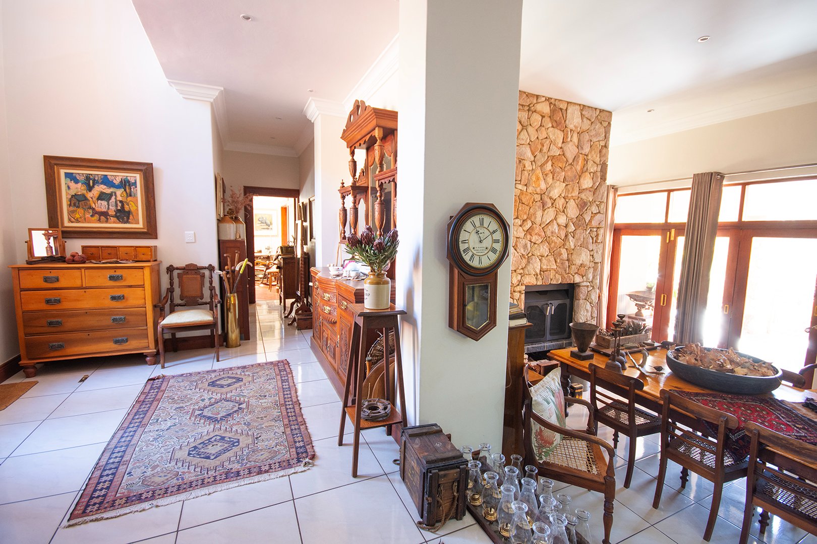 The heart of this home is the large double-volume open entrance hall that leads to an expansive open-plan living area. The sitting/living room, equipped with a dual-sided fireplace, creates a warm and inviting atmosphere, perfect for cozy family gatherings. The seamless integration between the dining room and lounge, leading to the patio through stacker doors, offers an excellent space for entertaining guests.