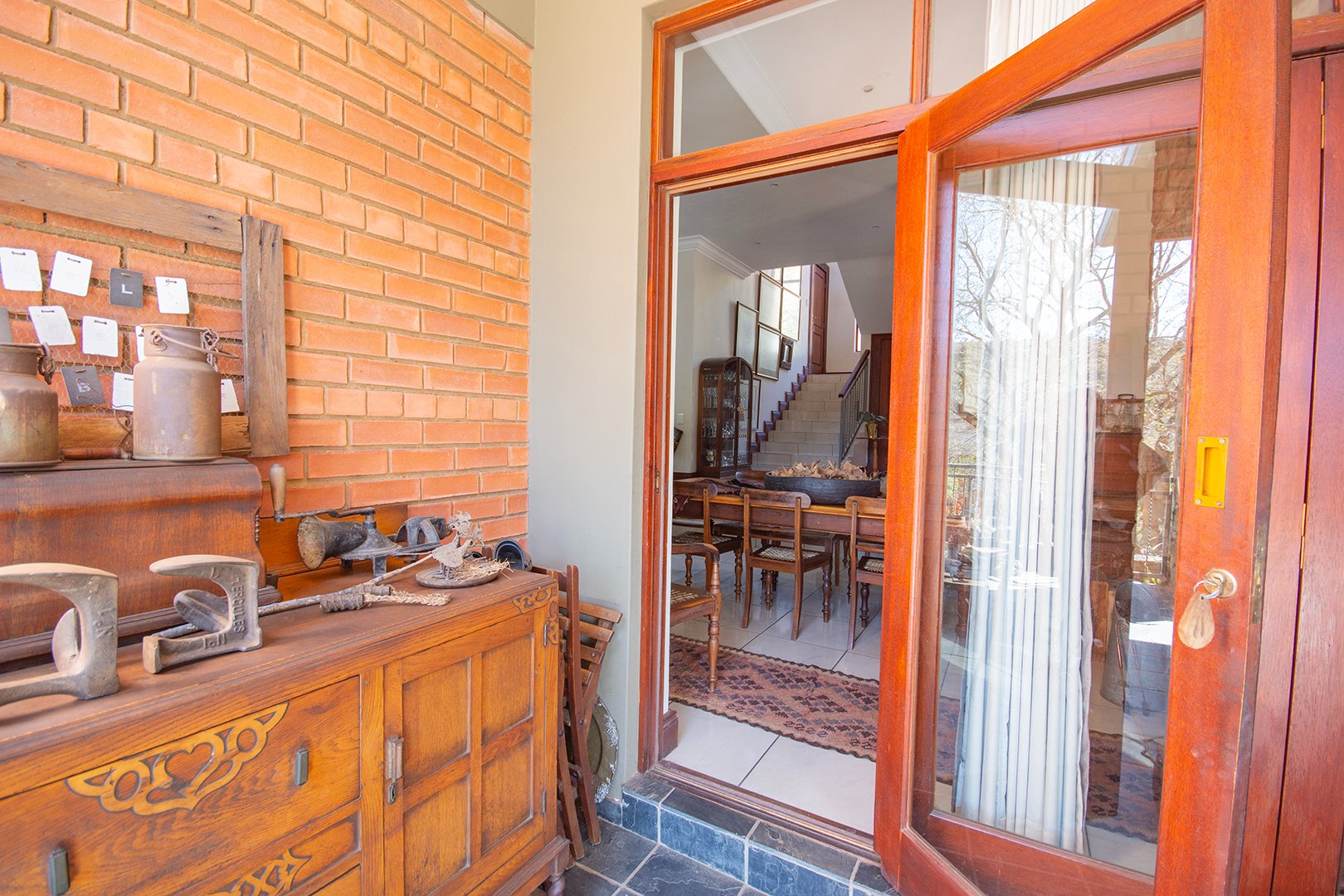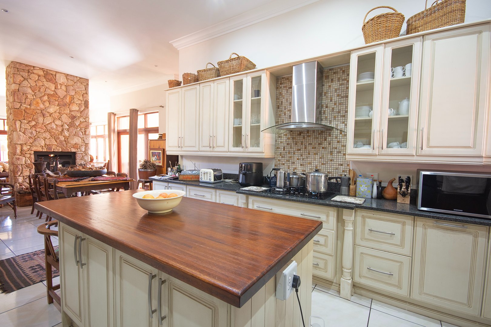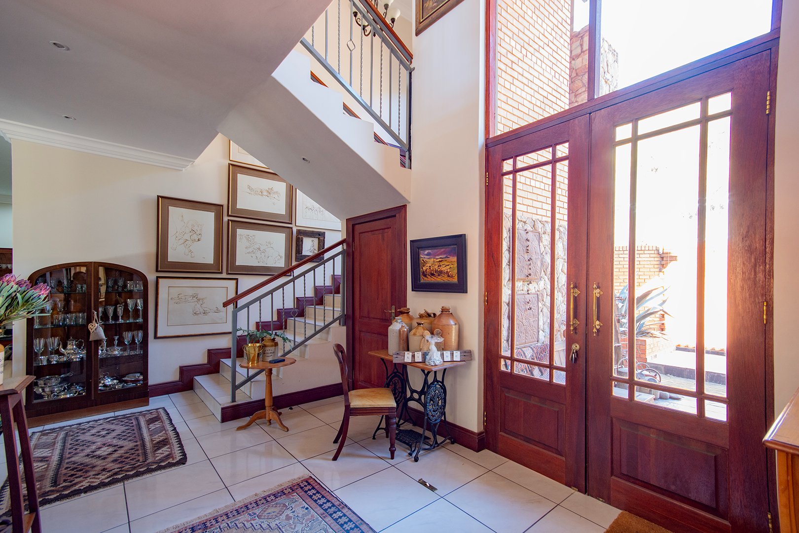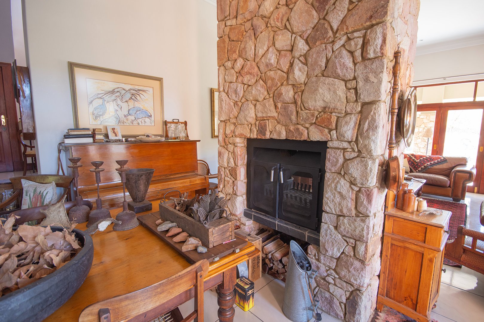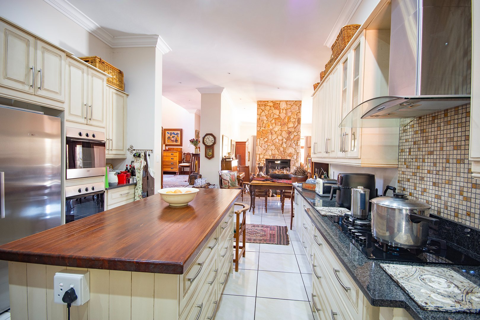 The heart of this home is the large double-volume open entrance hall that leads to an expansive open-plan living area. The sitting/living room, equipped with a dual-sided fireplace, creates a warm and inviting atmosphere, perfect for cozy family gatherings. The seamless integration between the dining room and lounge, leading to the patio through stacker doors, offers an excellent space for entertaining guests.