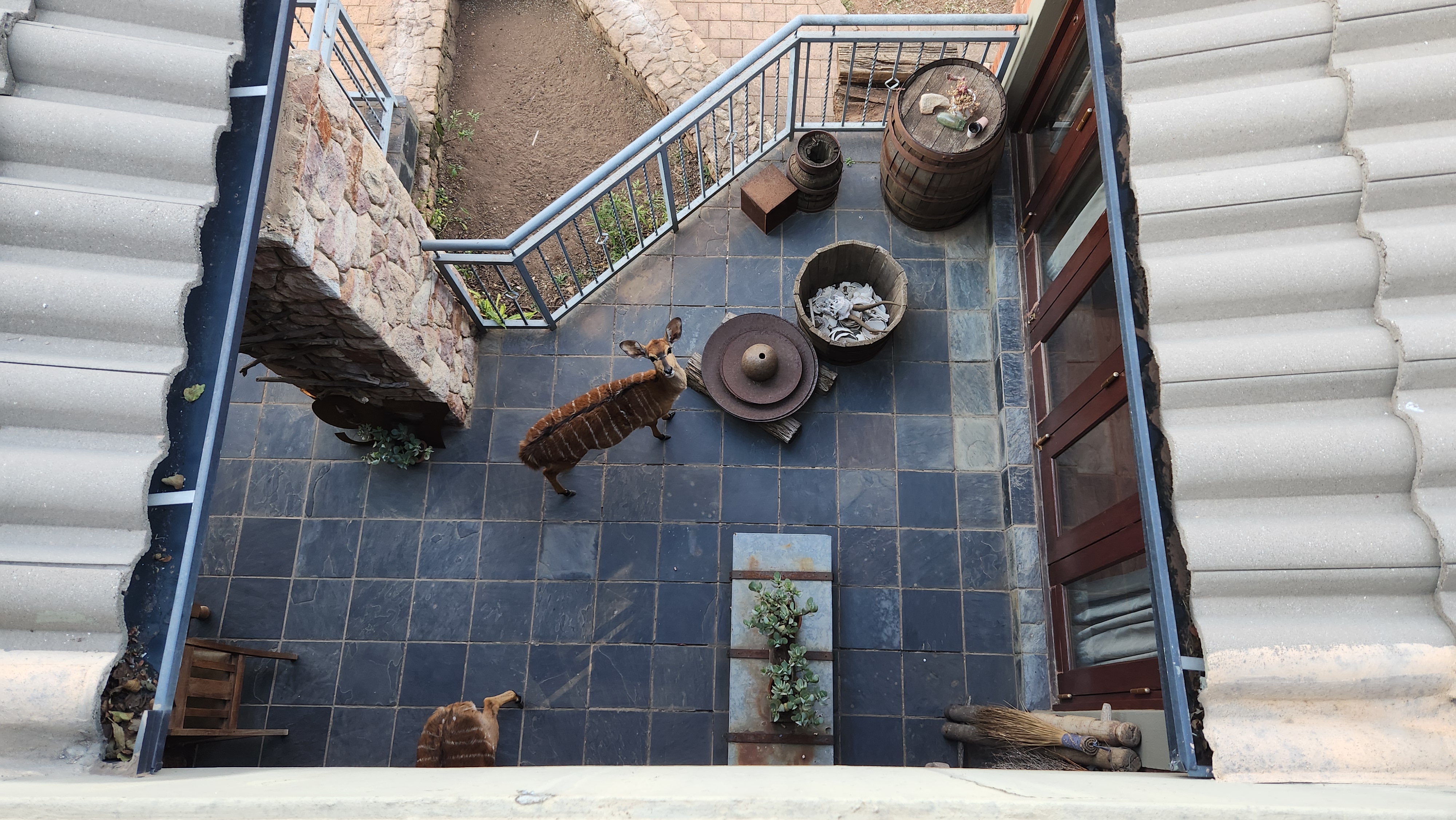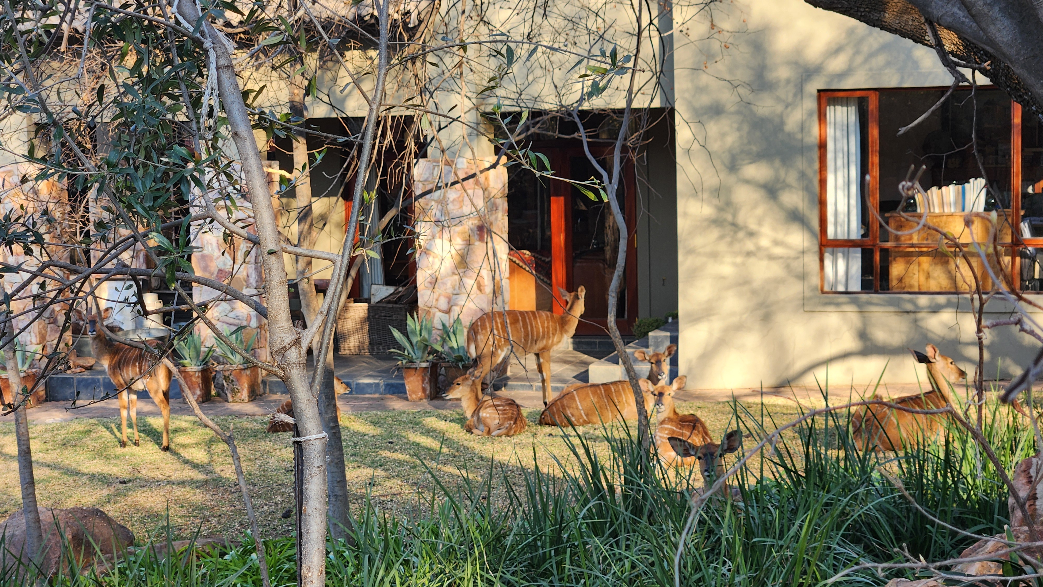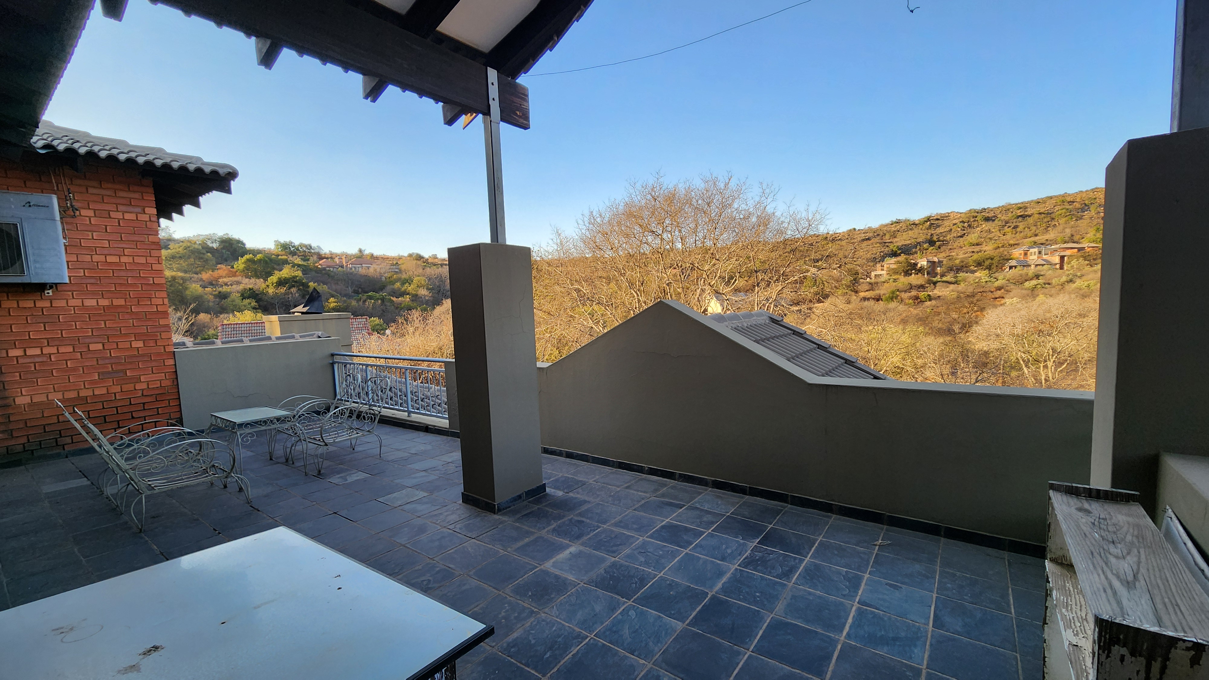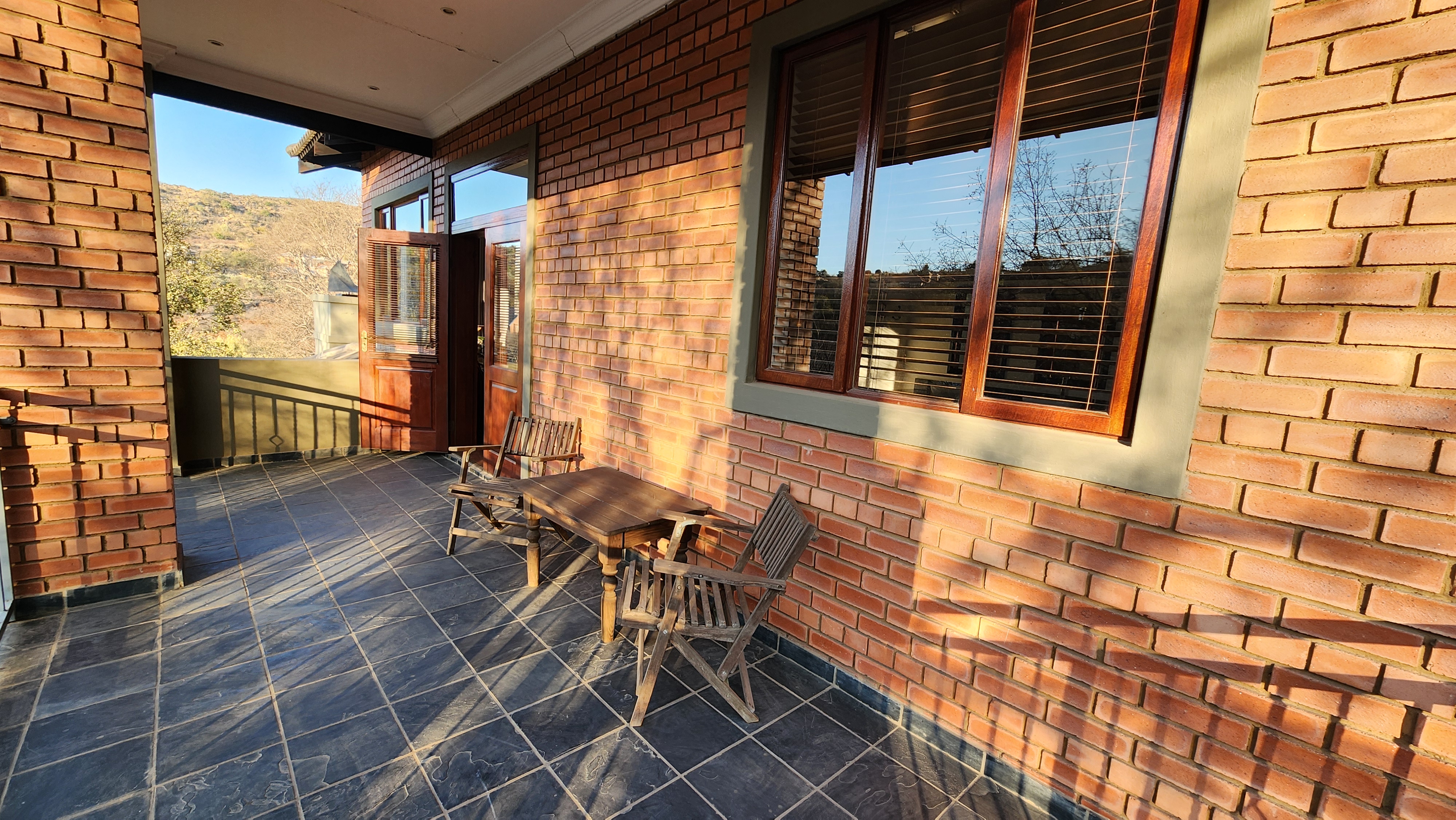 Looking down from the upper level, you catch a striking glimpse of the grand main entrance, framed by the breathtaking panorama of the Suikerbosrand Nature Reserve—your permanent backdrop of wild, protected beauty.