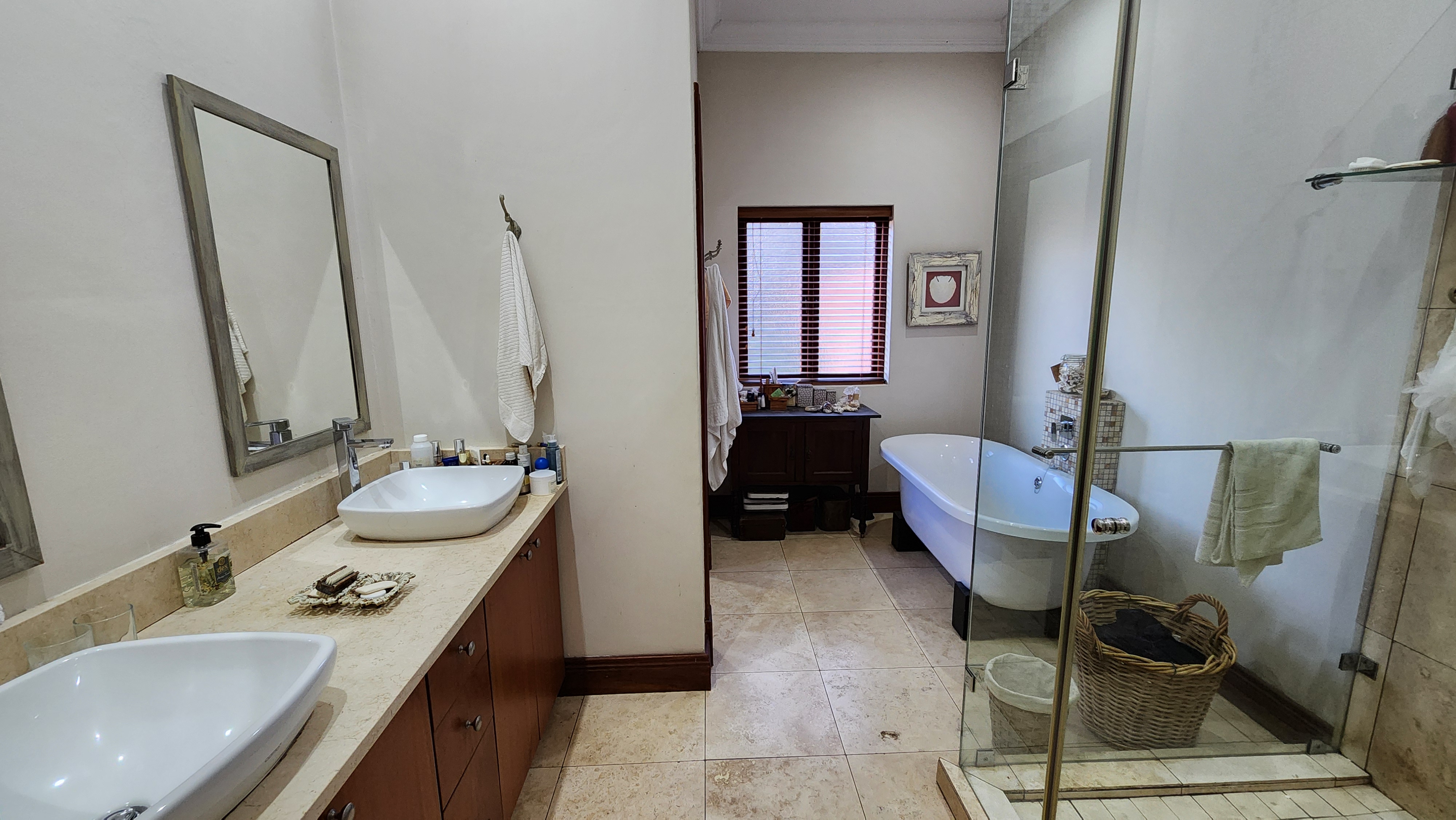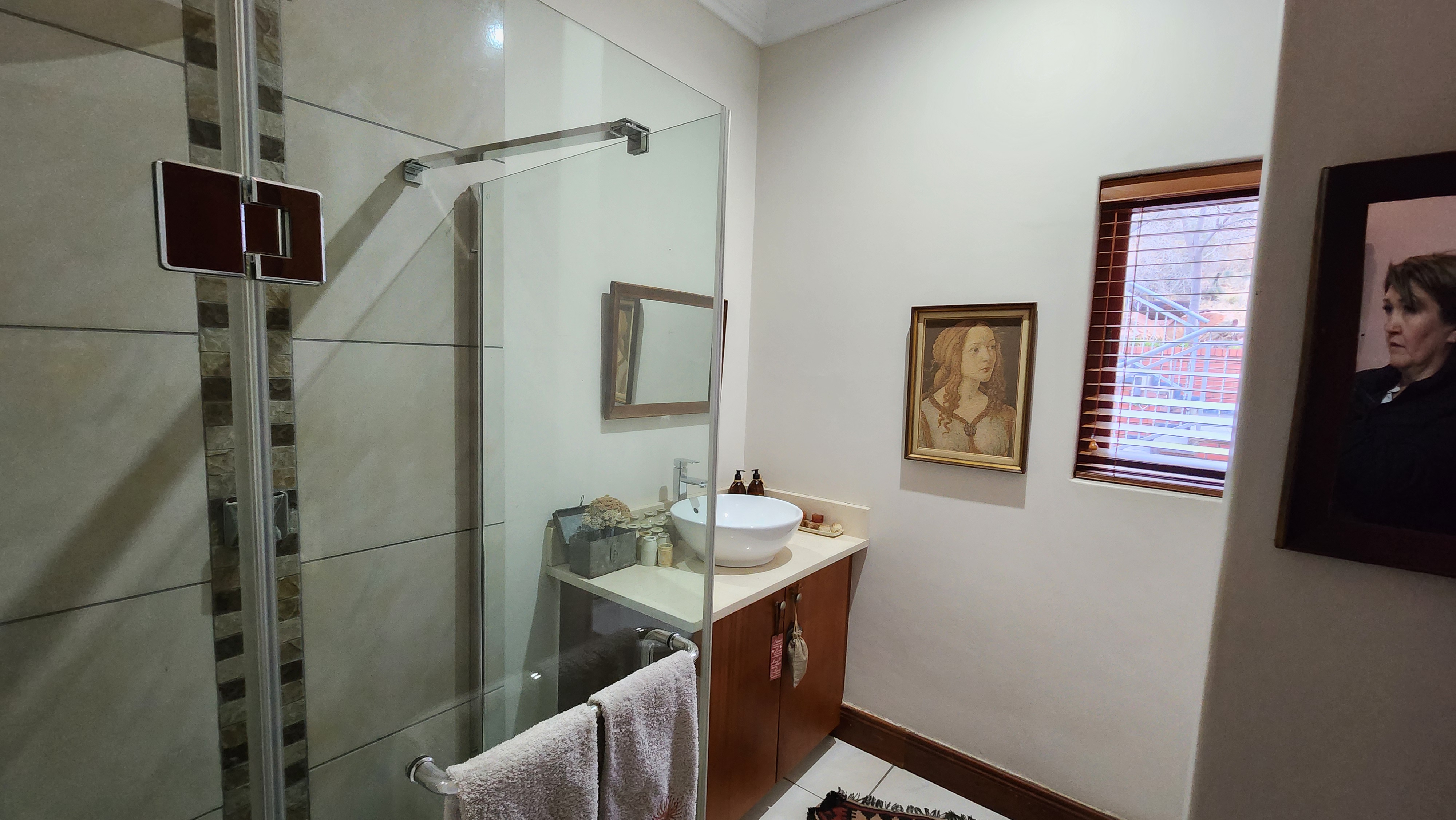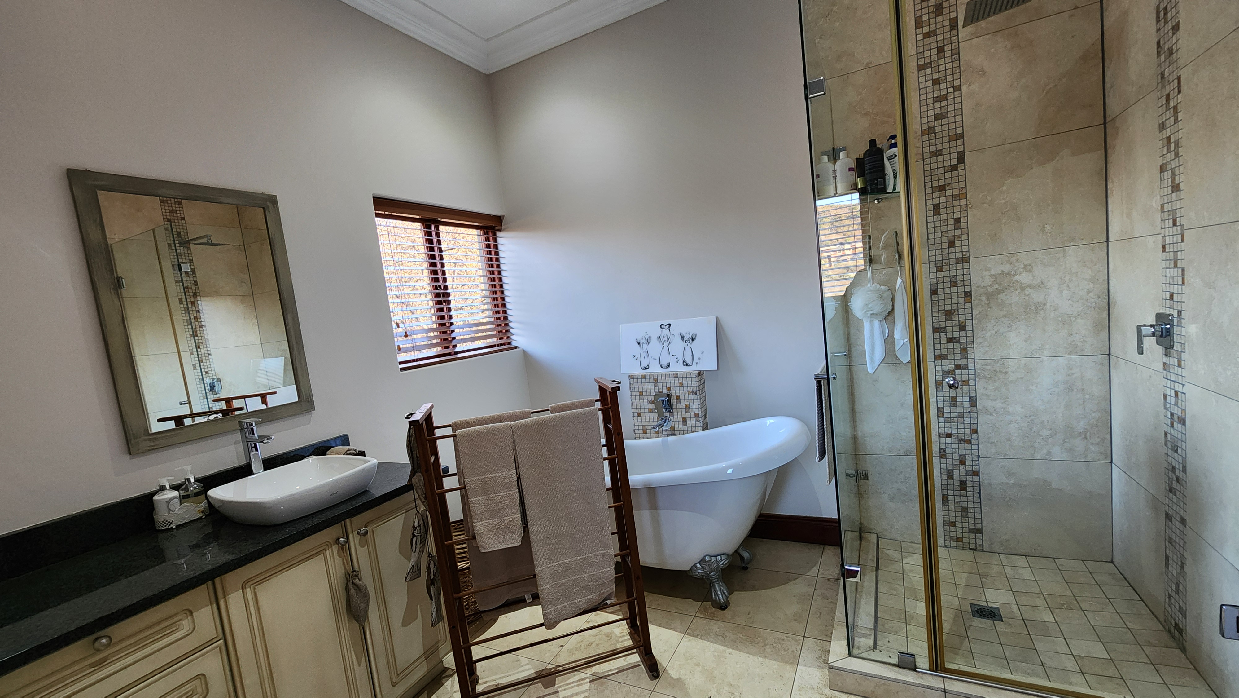 In true homage to nature, the home features granite countertops in both bathrooms and the kitchen, echoing the textures of the surrounding Suikerbosrand hills. Throughout the home, solid wooden window frames and doors offer warmth and authenticity, beautifully offset by the polished porcelain floor tiles that enhance the sense of light, space, and openness.