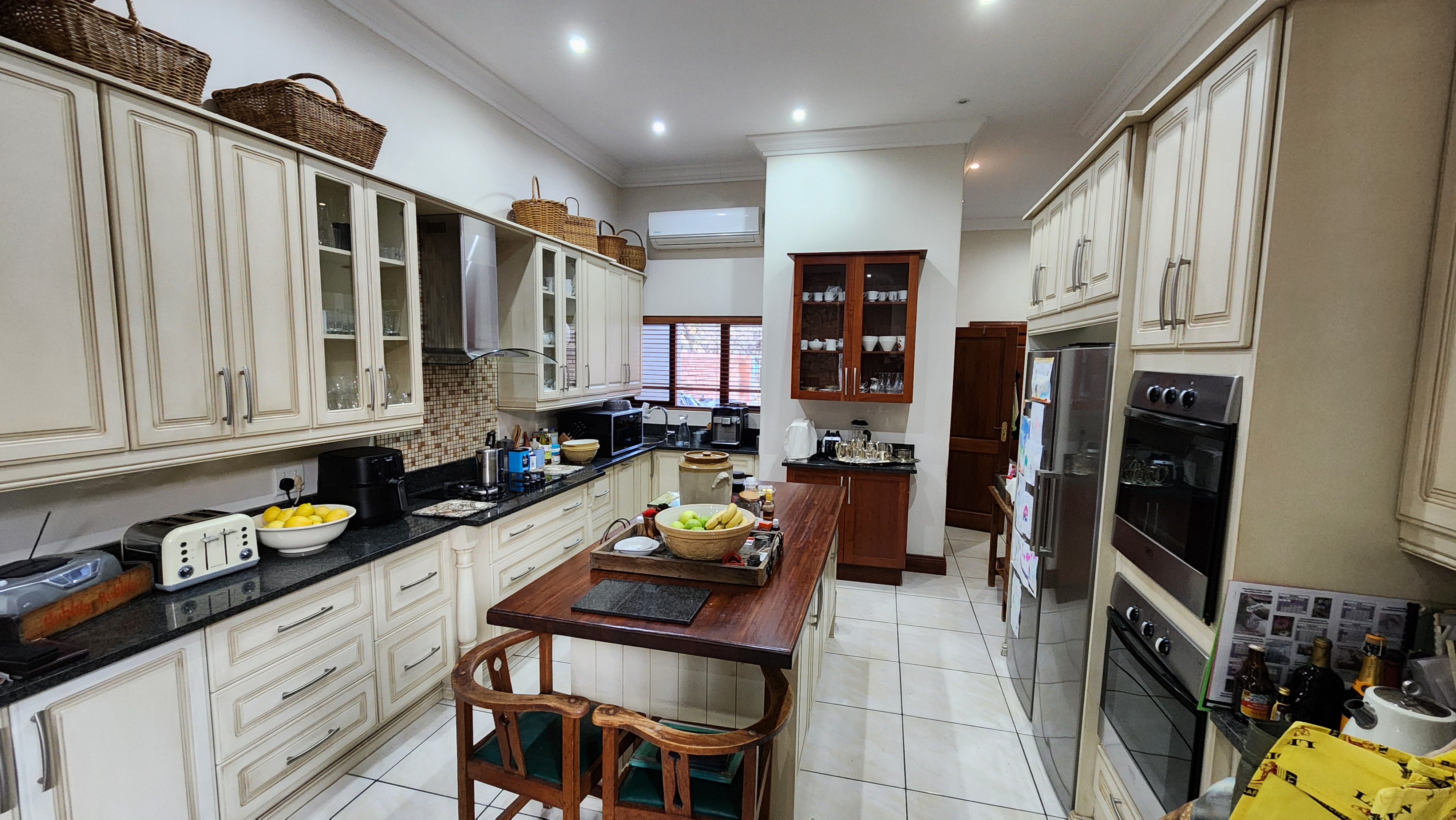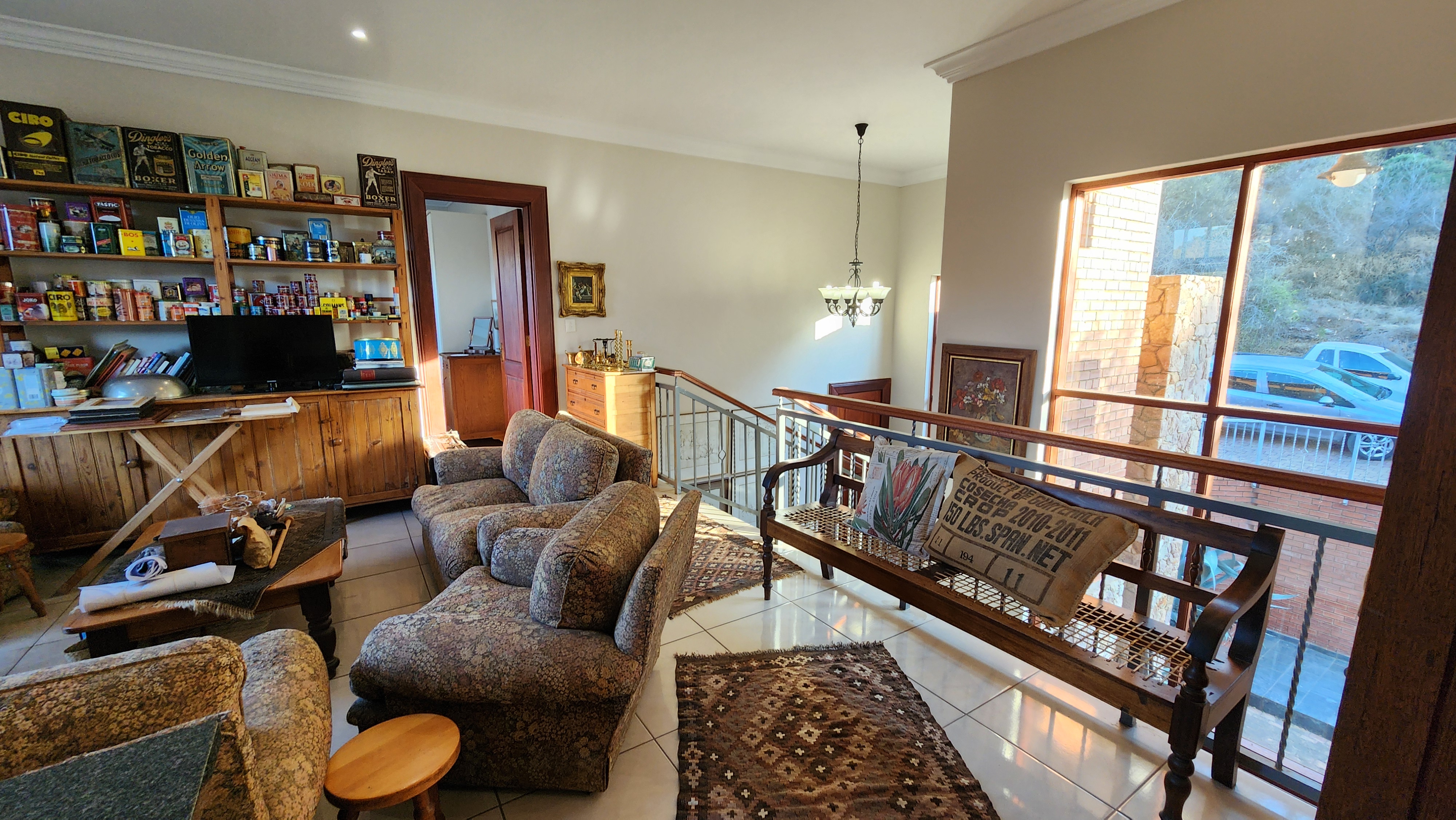 Surrounding this central space, custom wooden concertina doors fold away completely, opening the home to the covered entertainment terrace. Here, you’ll find a built-in braai and panoramic views—seamlessly blending indoor luxury with outdoor living.