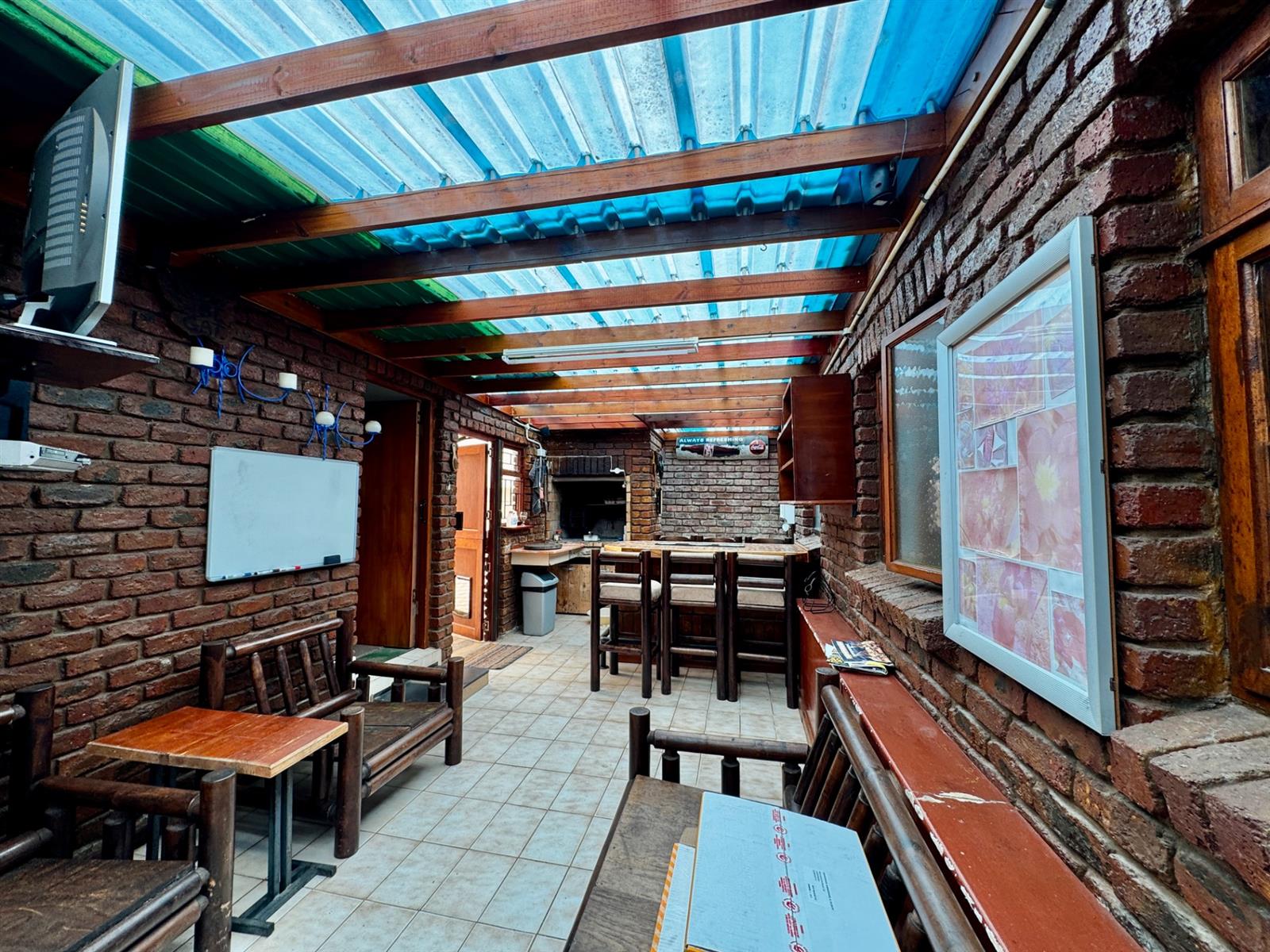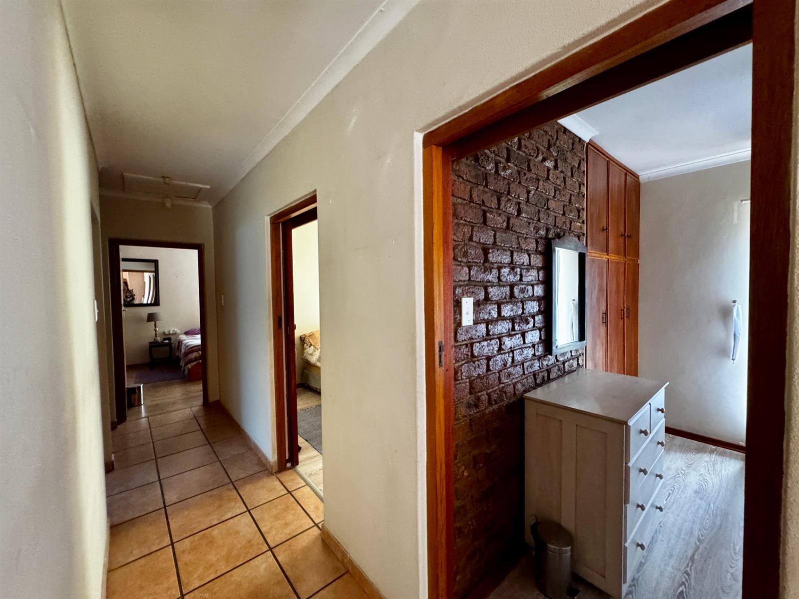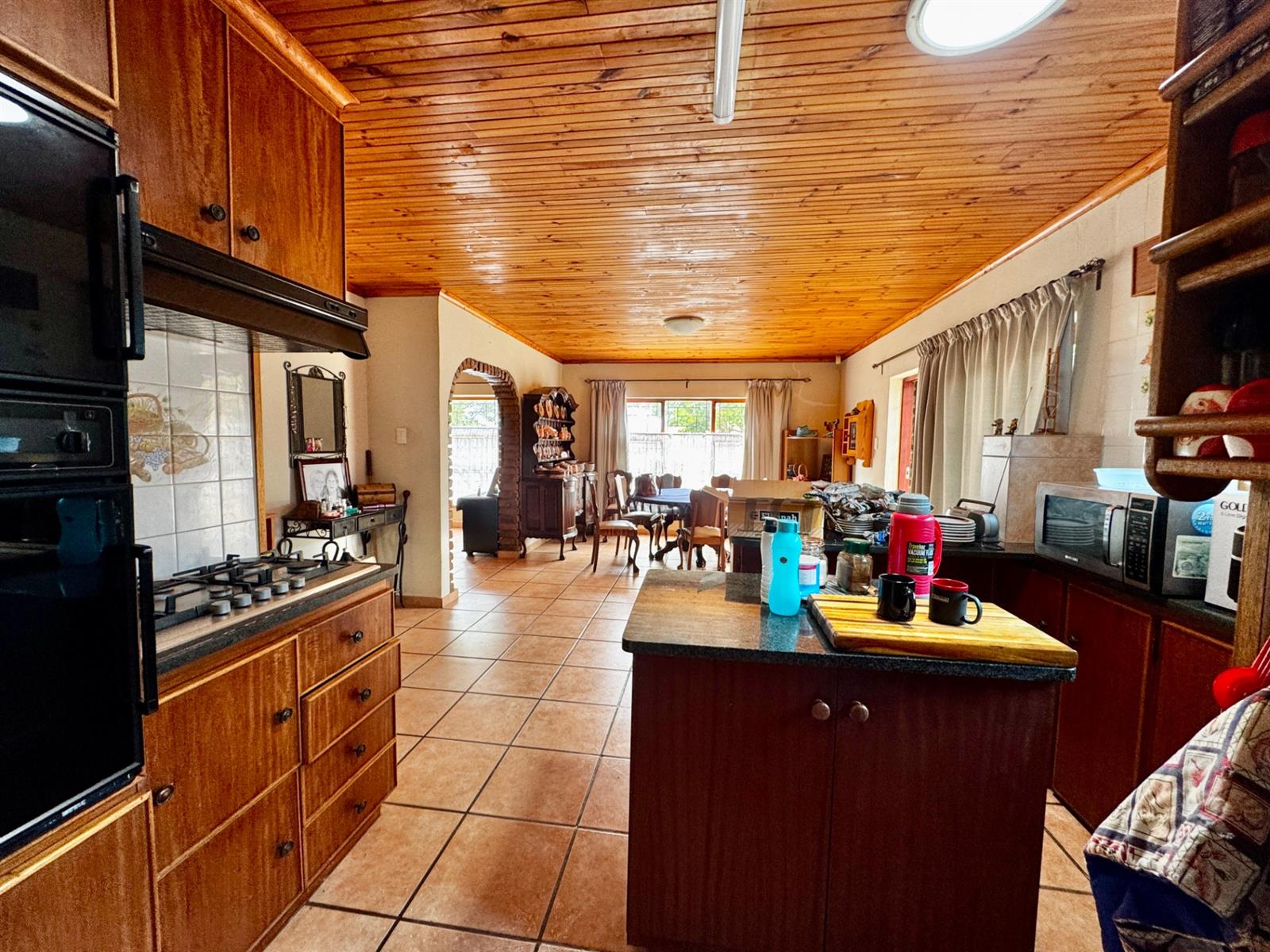 An open-plan kitchen, dining area, and family room create an easy flow for everyday living. The enclosed braai room, fitted with a built-in braai and cupboards, is ideal for entertaining throughout the year.