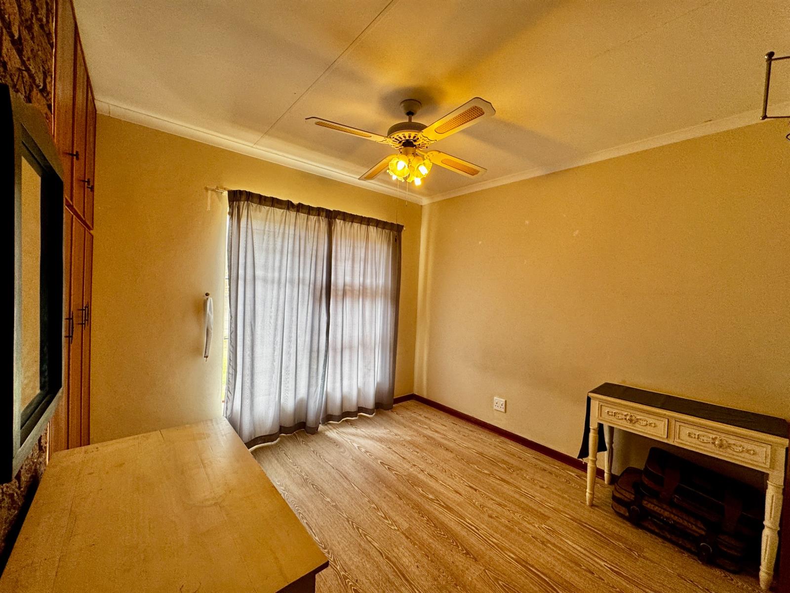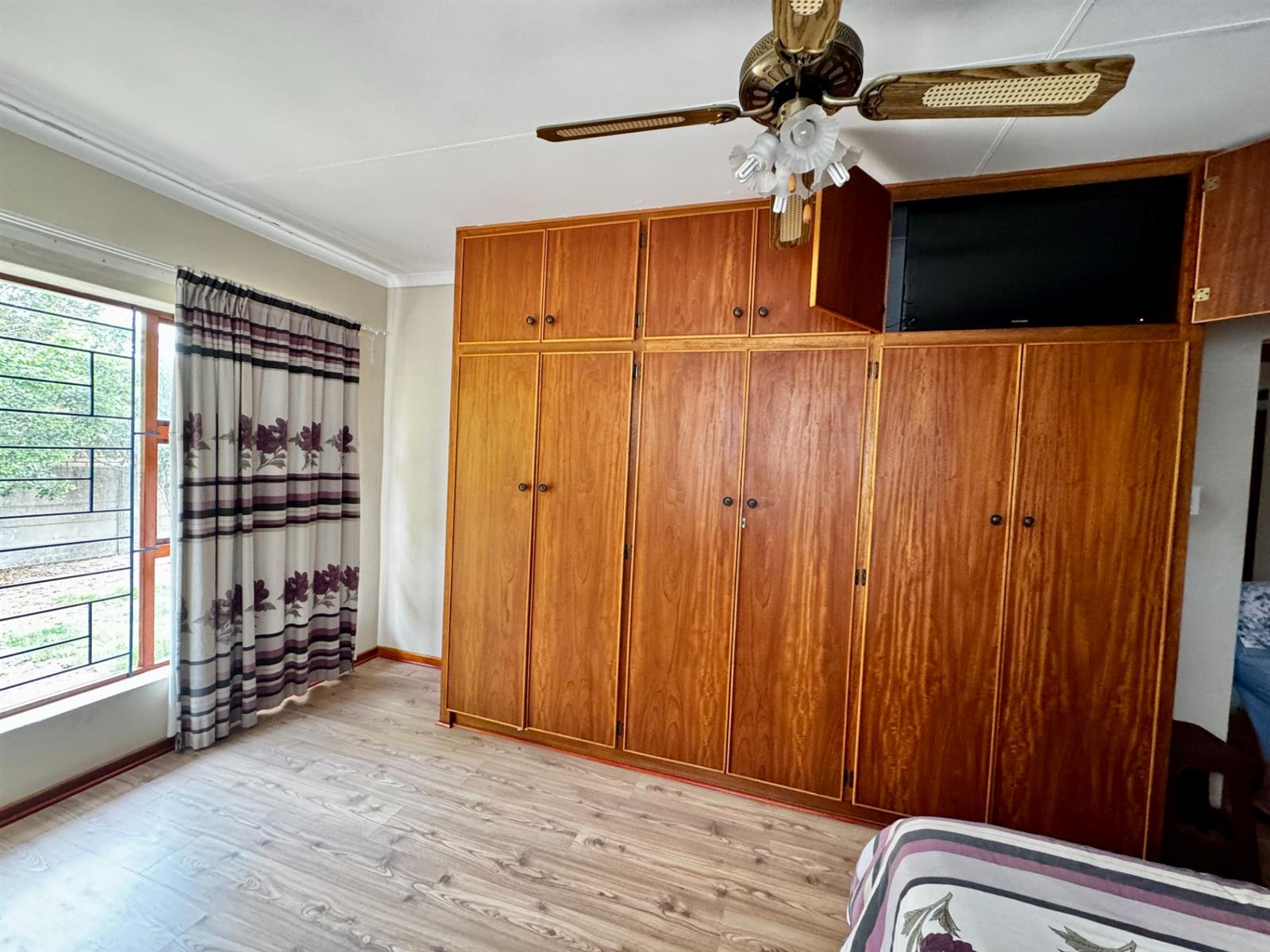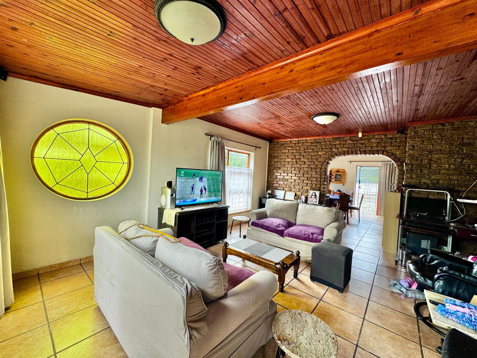 An open-plan kitchen, dining area, and family room create an easy flow for everyday living. The enclosed braai room, fitted with a built-in braai and cupboards, is ideal for entertaining throughout the year.