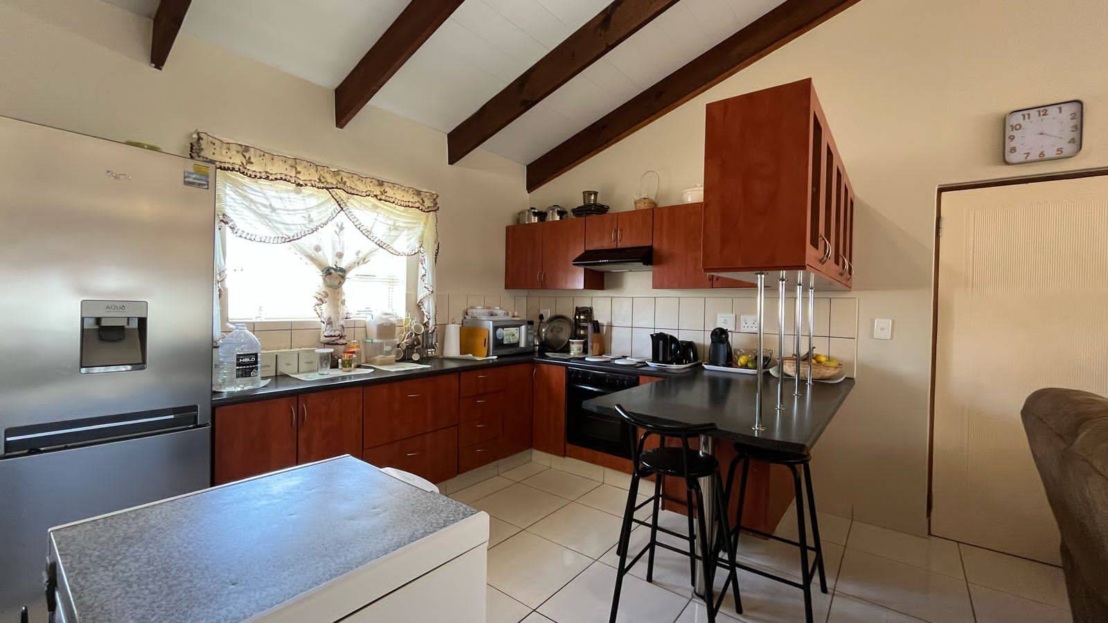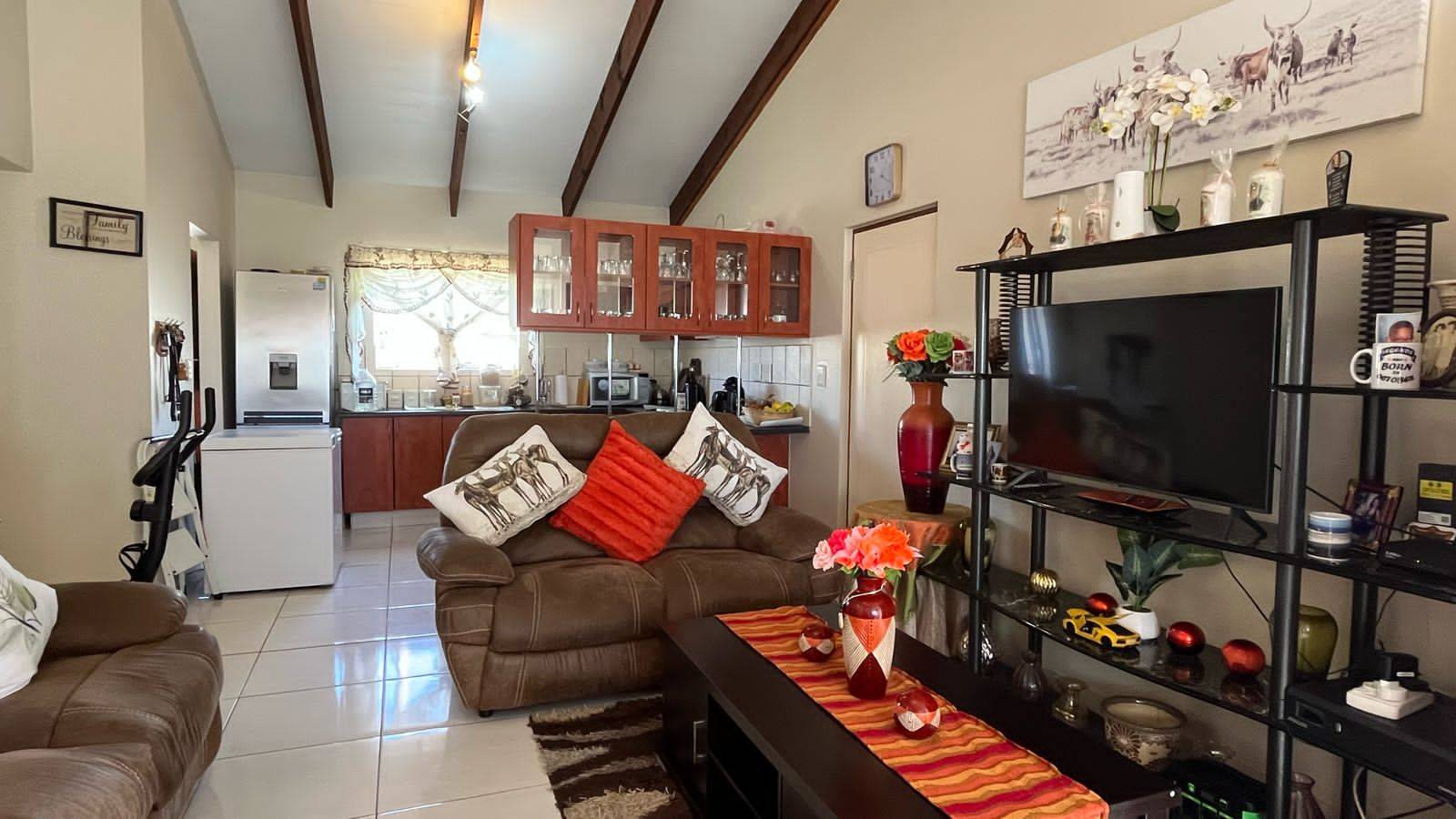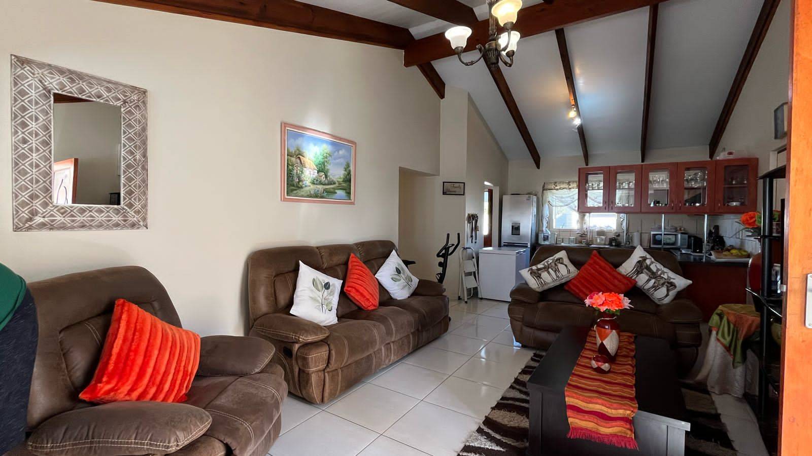 Spacious lounge with open-plan kitchen with built-in stove and lots of cupboards. Separate scullery with space for two appliances. Additional cupboard in the scullery.