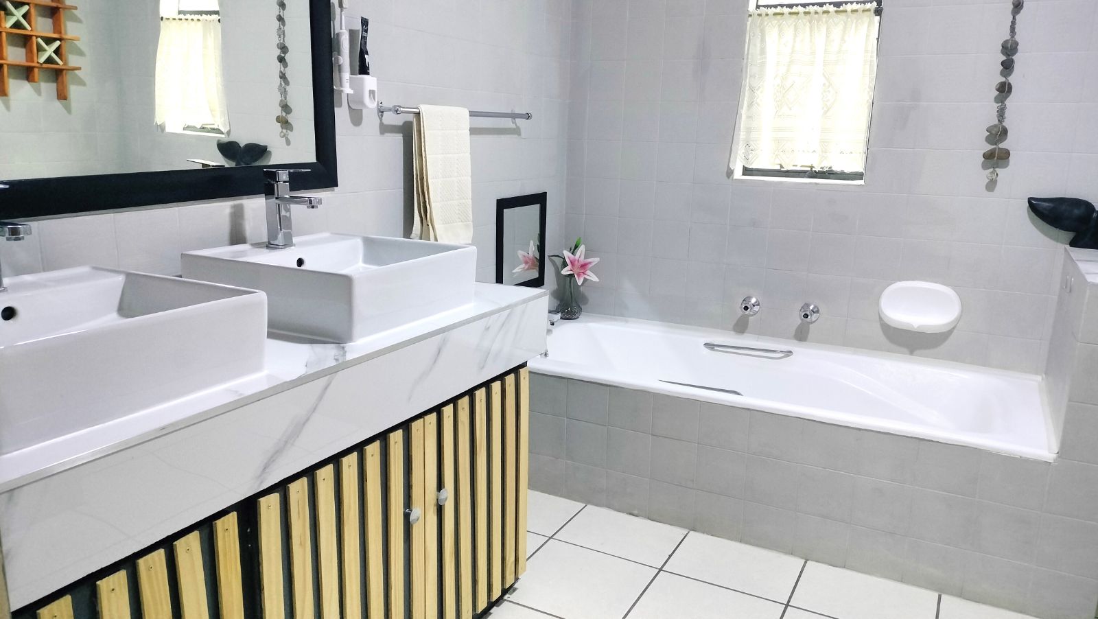 The home offers four well-sized bedrooms, all carpeted and fitted with built-in cupboards. The main bedroom is a peaceful retreat with a full en-suite bathroom boasting a shower, bath, double vanity, and toilet. The remaining bedrooms are serviced by a second full bathroom with a bath, double vanity, and toilet. The fourth bedroom, located just off the lounge, includes an en-suite guest toilet and basin, making it perfect for visitors or extended family.