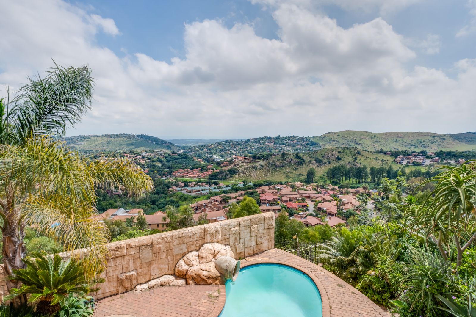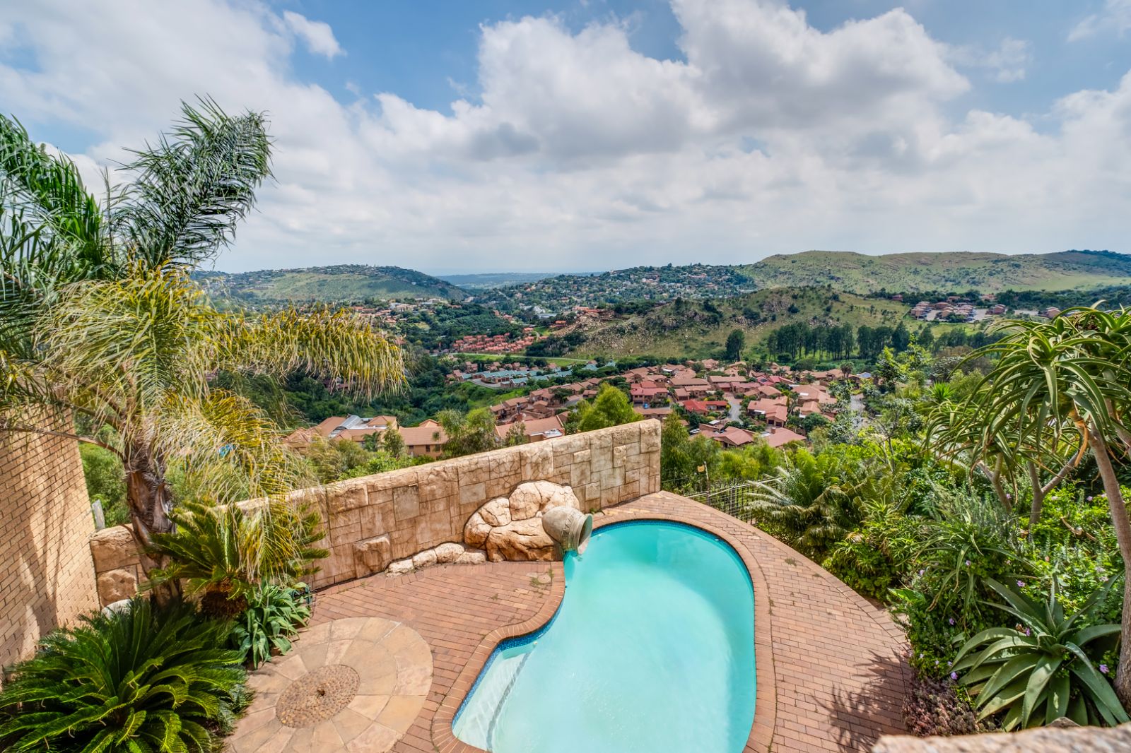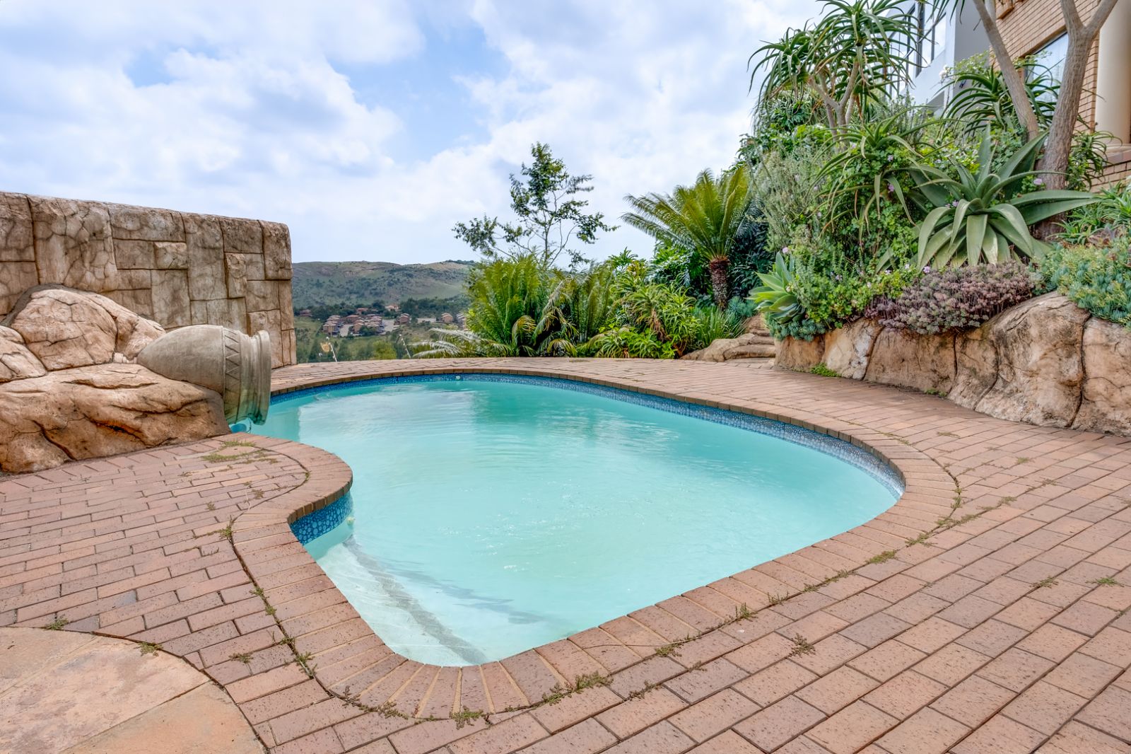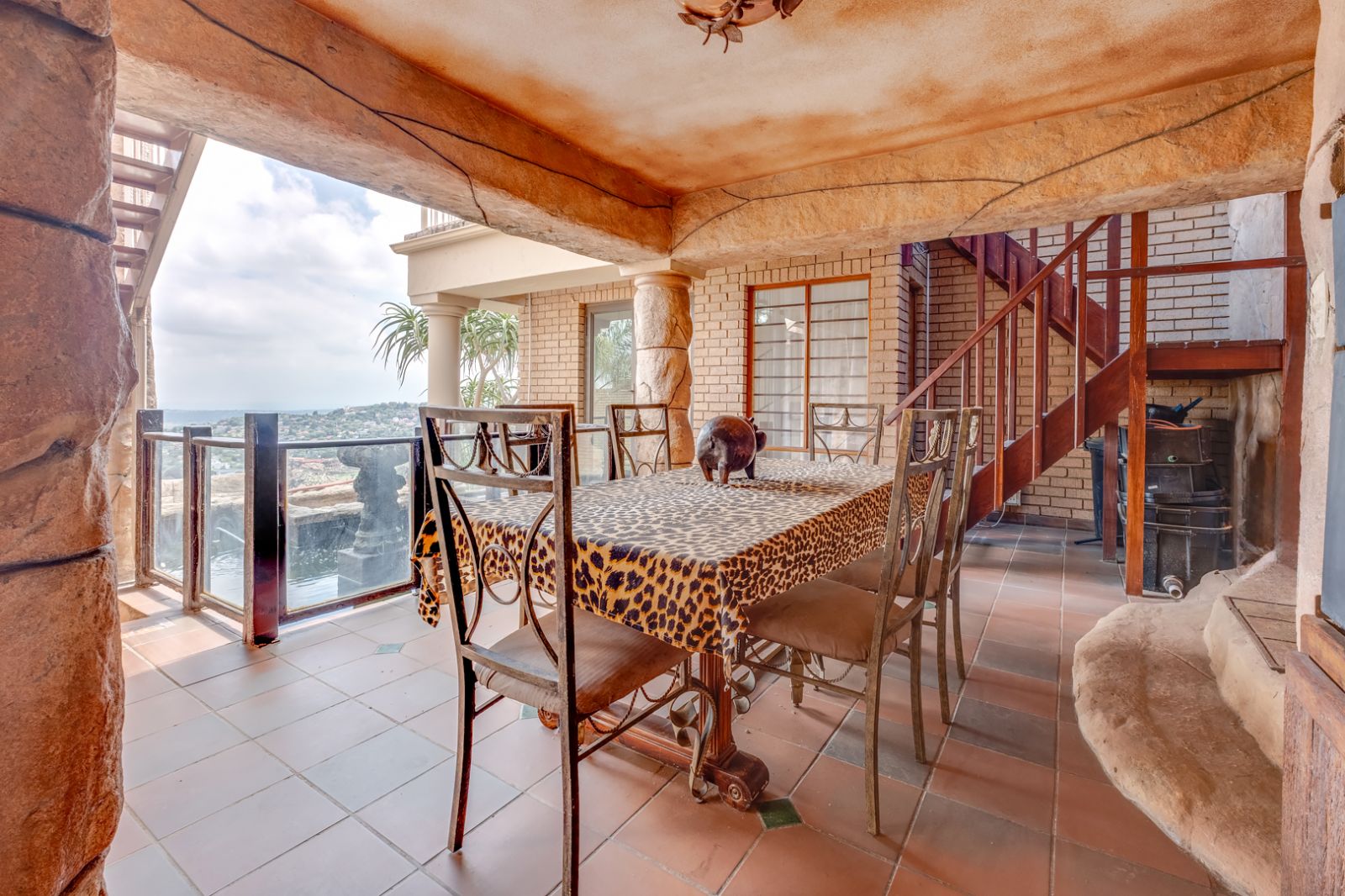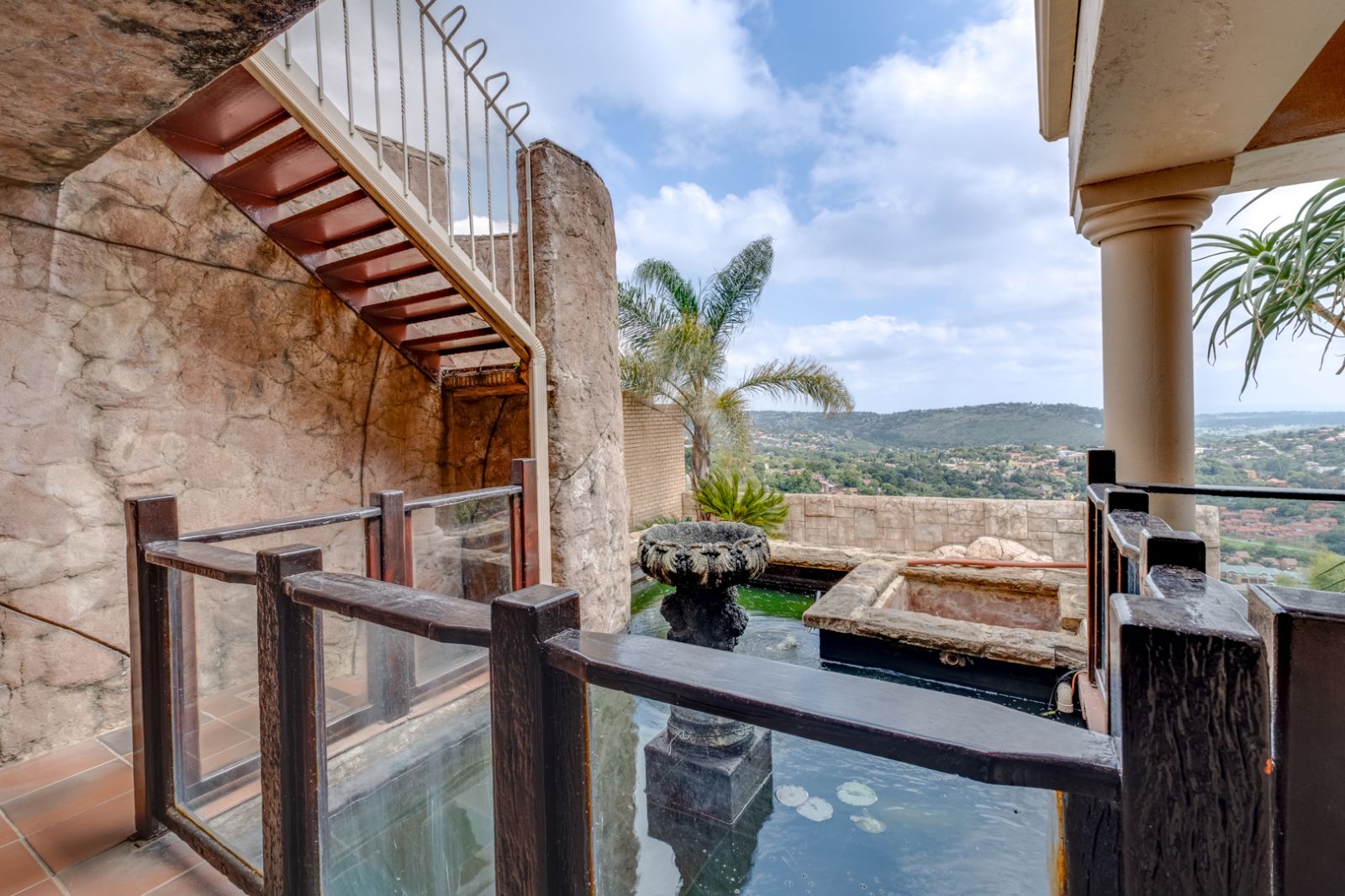 The lower level of the home is an entertainer’s dream. This expansive area is perfect for hosting family and friends and features a well-equipped entertainment space complete with a built-in braai, koi pond, and tranquil water feature.