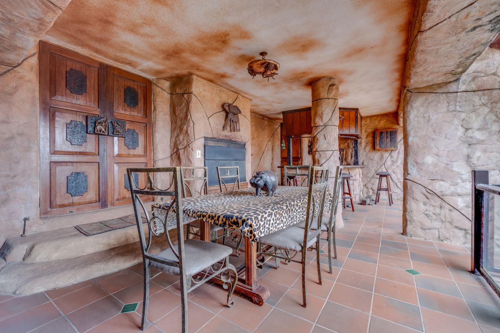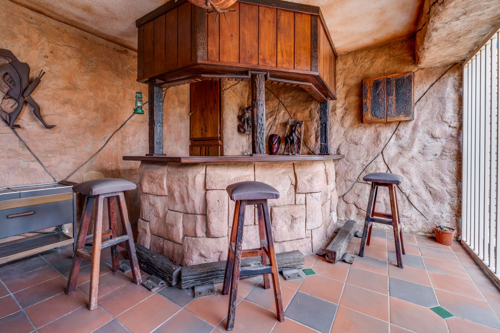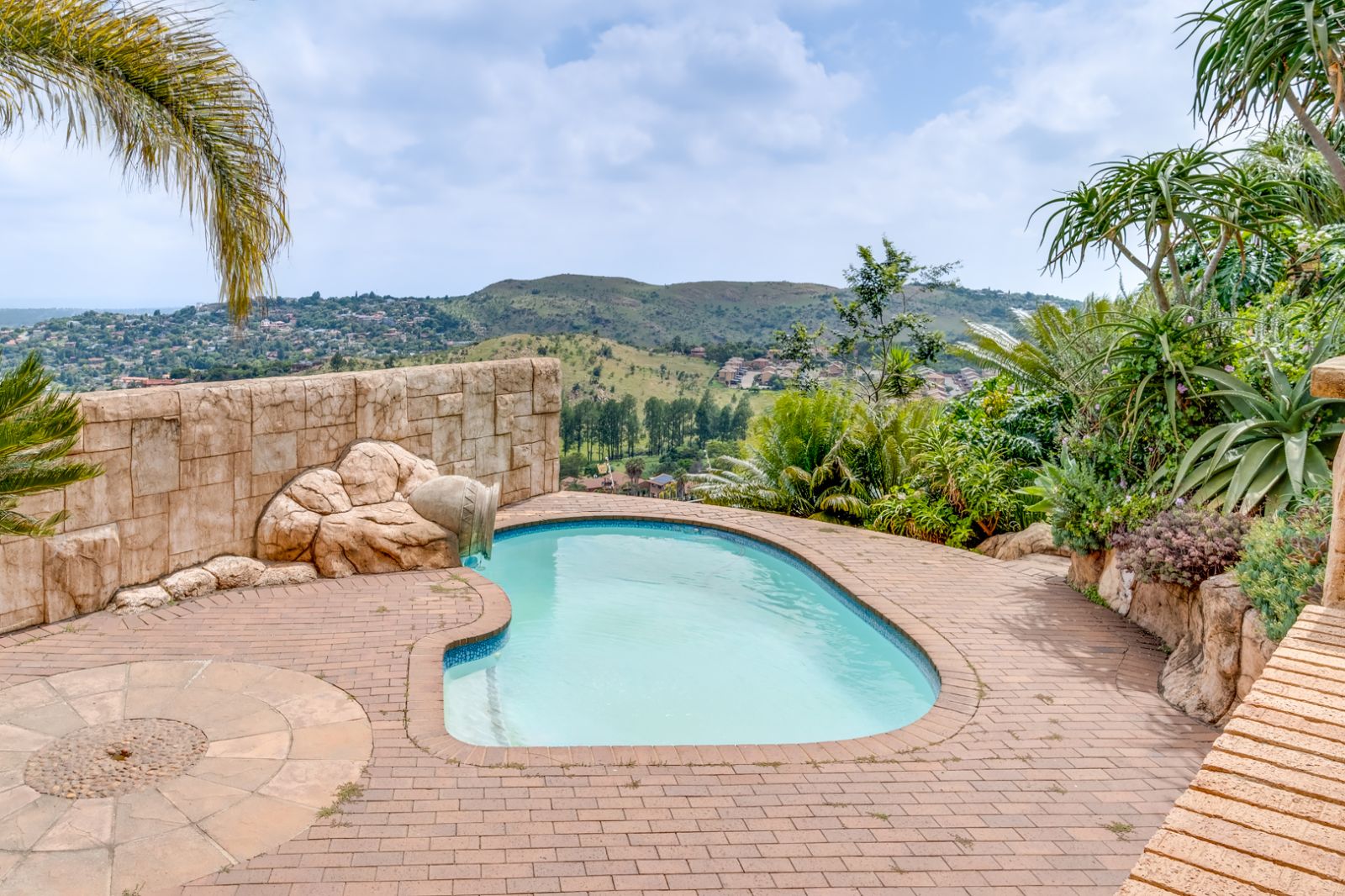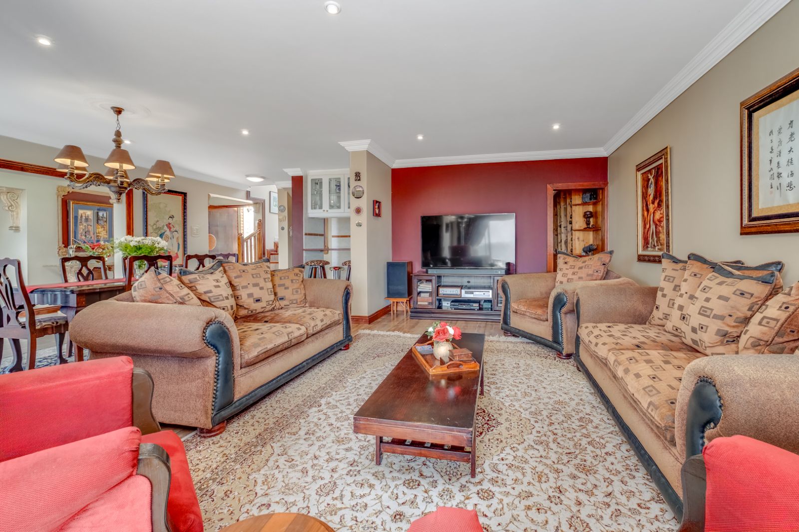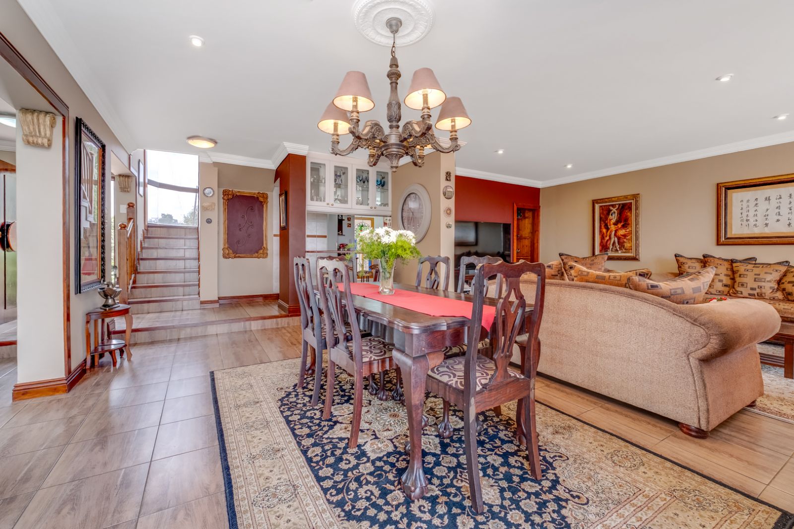 The lower level of the home is an entertainer’s dream. This expansive area is perfect for hosting family and friends and features a well-equipped entertainment space complete with a built-in braai, koi pond, and tranquil water feature.