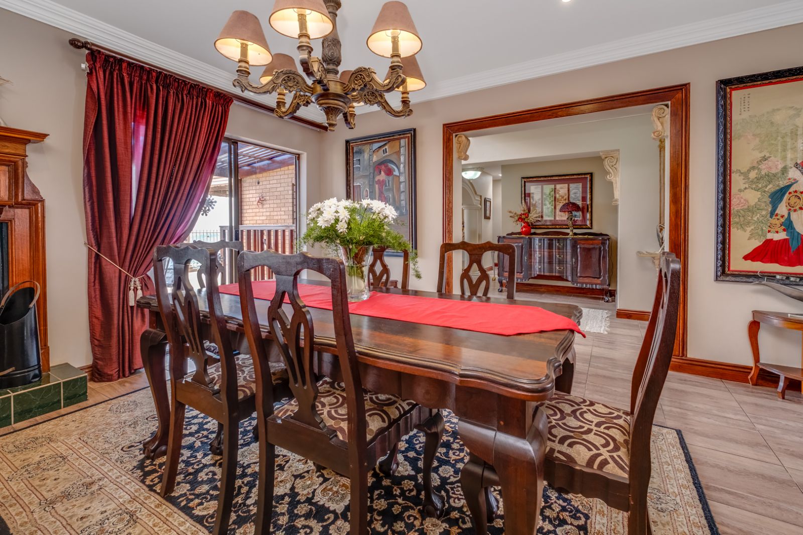 The warm and inviting dining room features an ornate wood-burning fireplace and a beautiful chandelier, creating an intimate atmosphere ideal for family lunches and memorable gatherings. For the wine connoisseur, this level is further enhanced by a built-in wine rack accommodating up to 96 bottles, perfectly positioned to complement entertaining and fine dining.