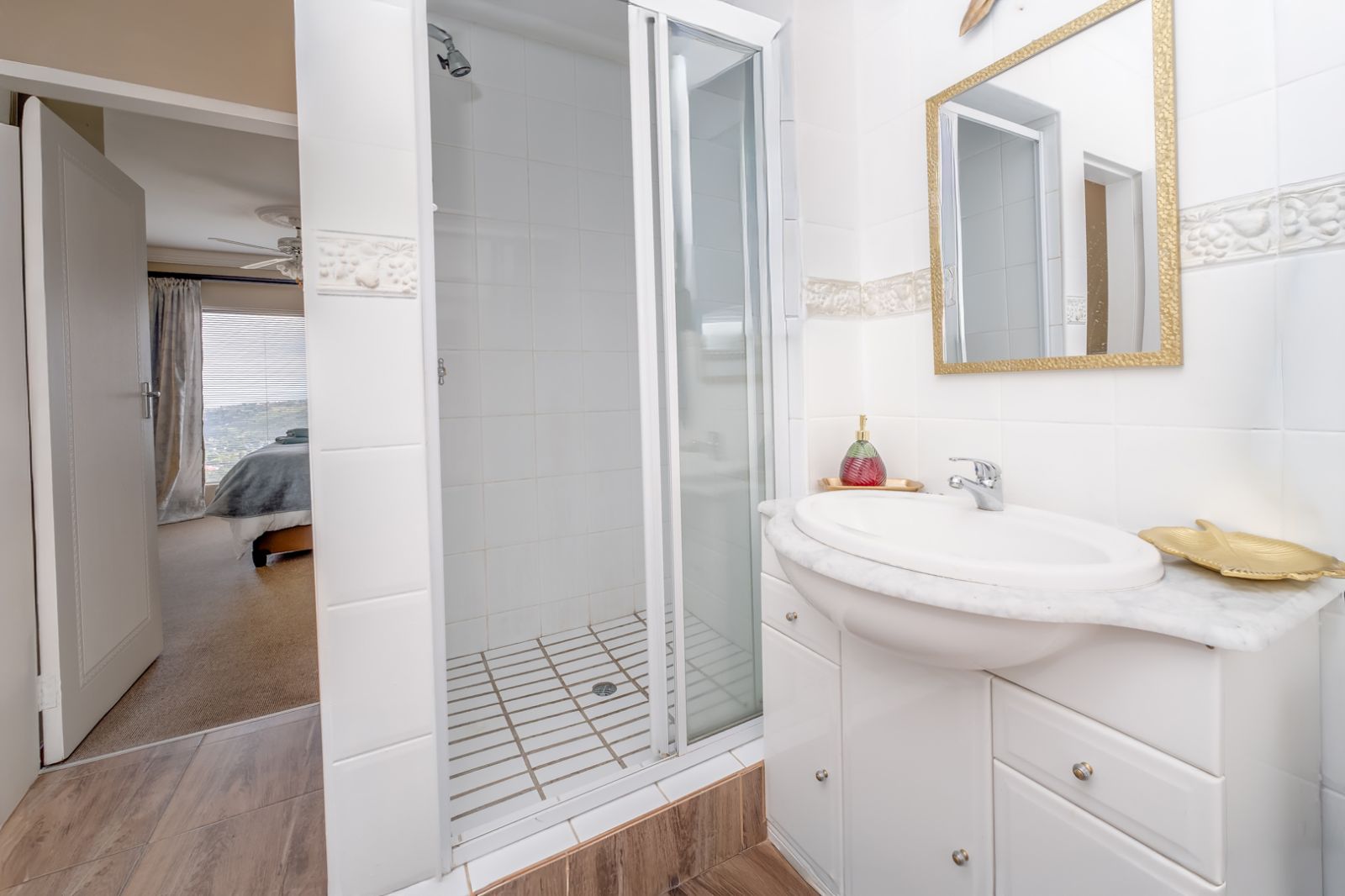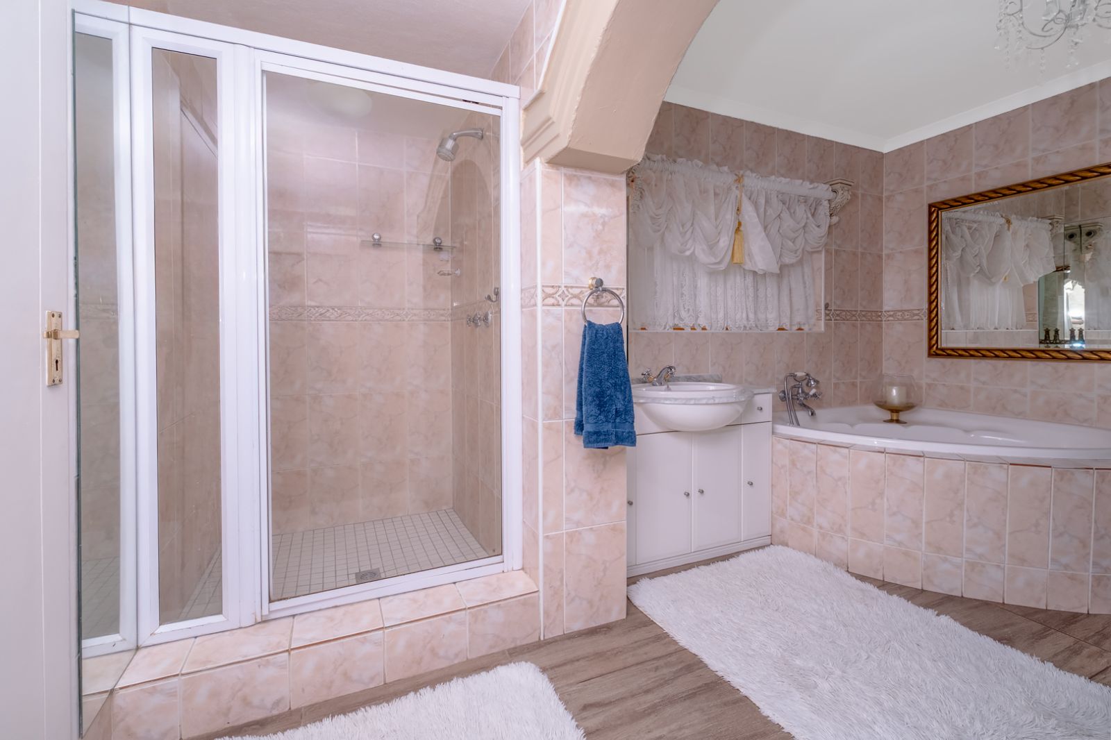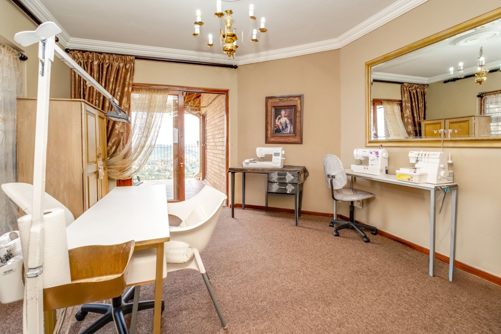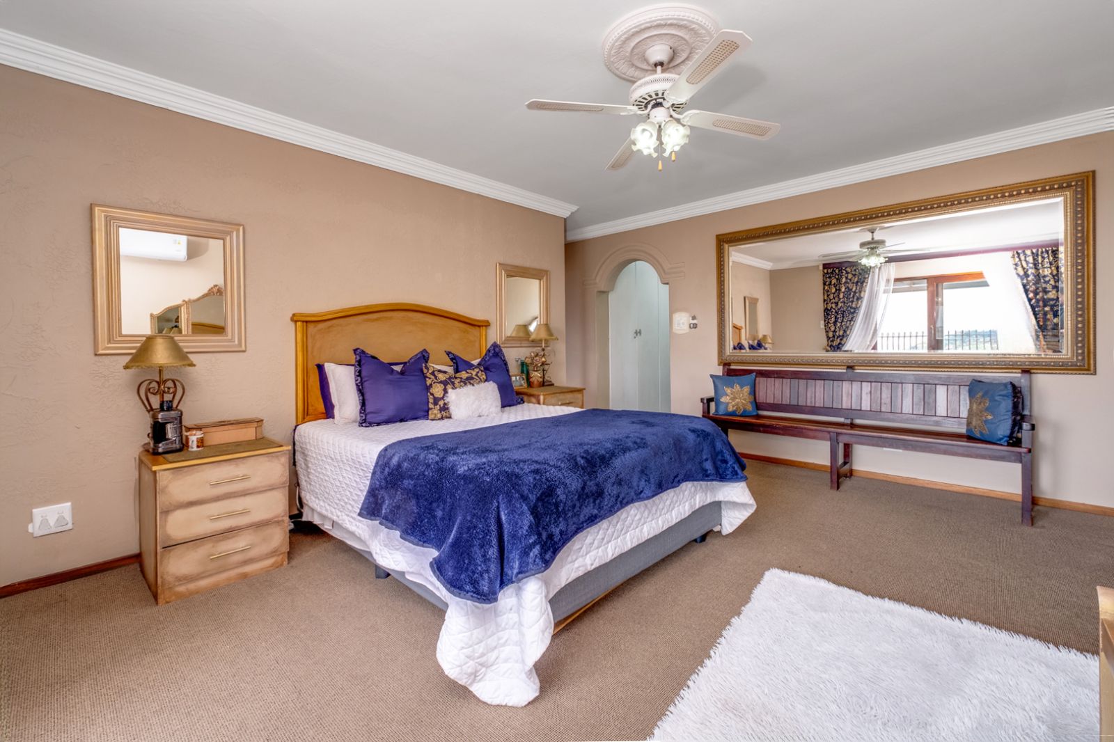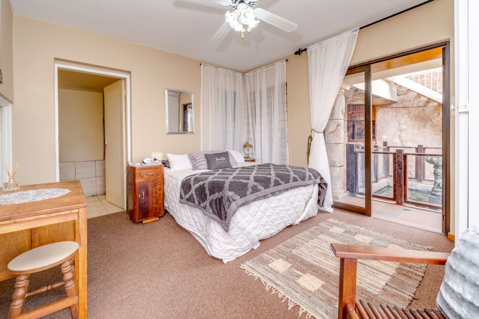 The luxurious main bedroom suite is a true sanctuary, offering ample built-in cupboards, air conditioning, and uninterrupted views of the Magaliesburg mountain range. The en-suite bathroom is elegantly finished and includes a corner jetted tub, shower, water closet, and a vanity with storage, as well as direct access to the outdoors.