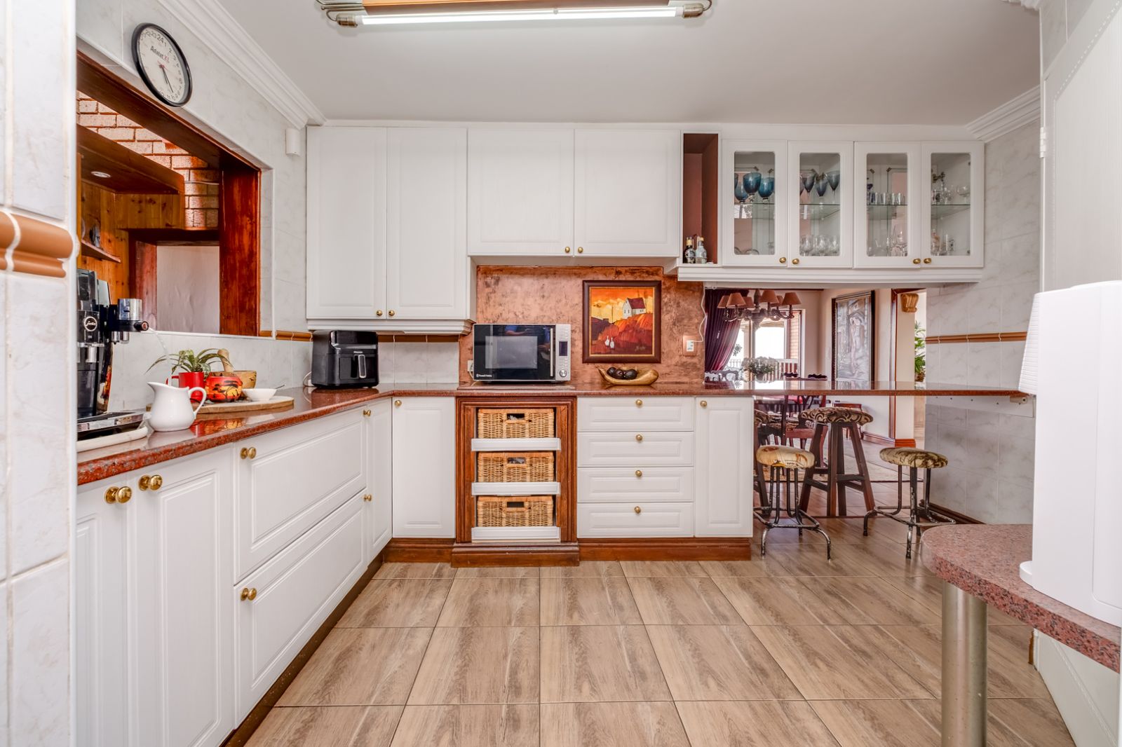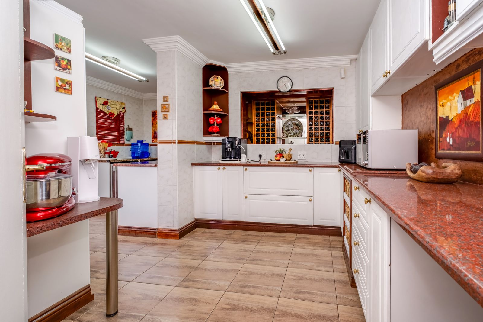 A separate scullery, fitted with a glass skylight, provides space for under-counter appliances and a double-door fridge, keeping the kitchen neat and functional.