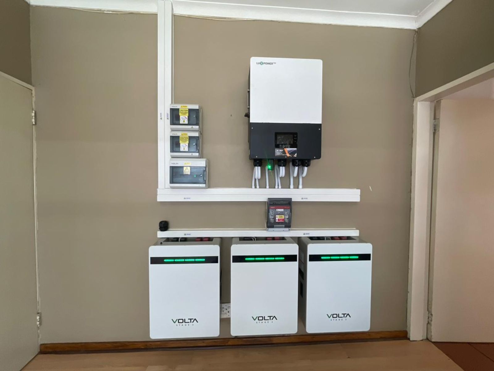 14 550W solar panels, 12KW Luxpower Hybrid Inverter, 3 x 10KW Volta Stage # batteries. There is also a petrol generator, 7,5KW. This home is completely off the grid.