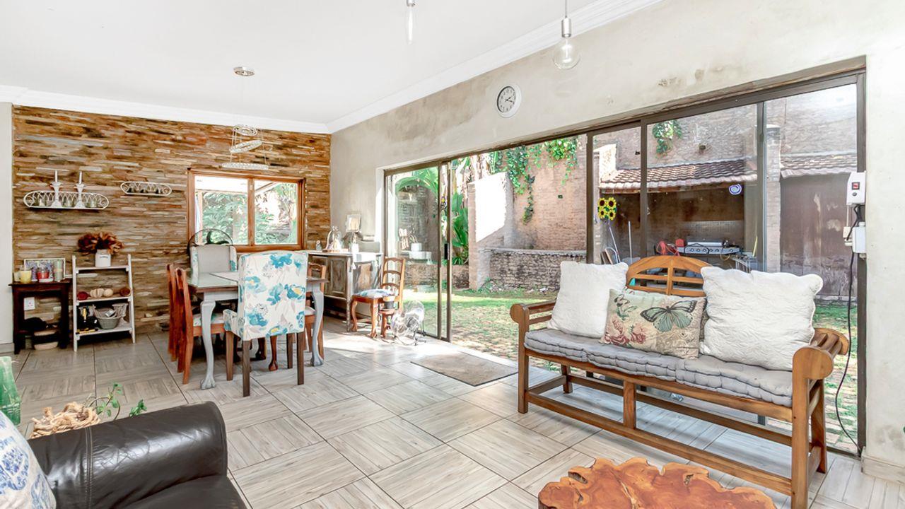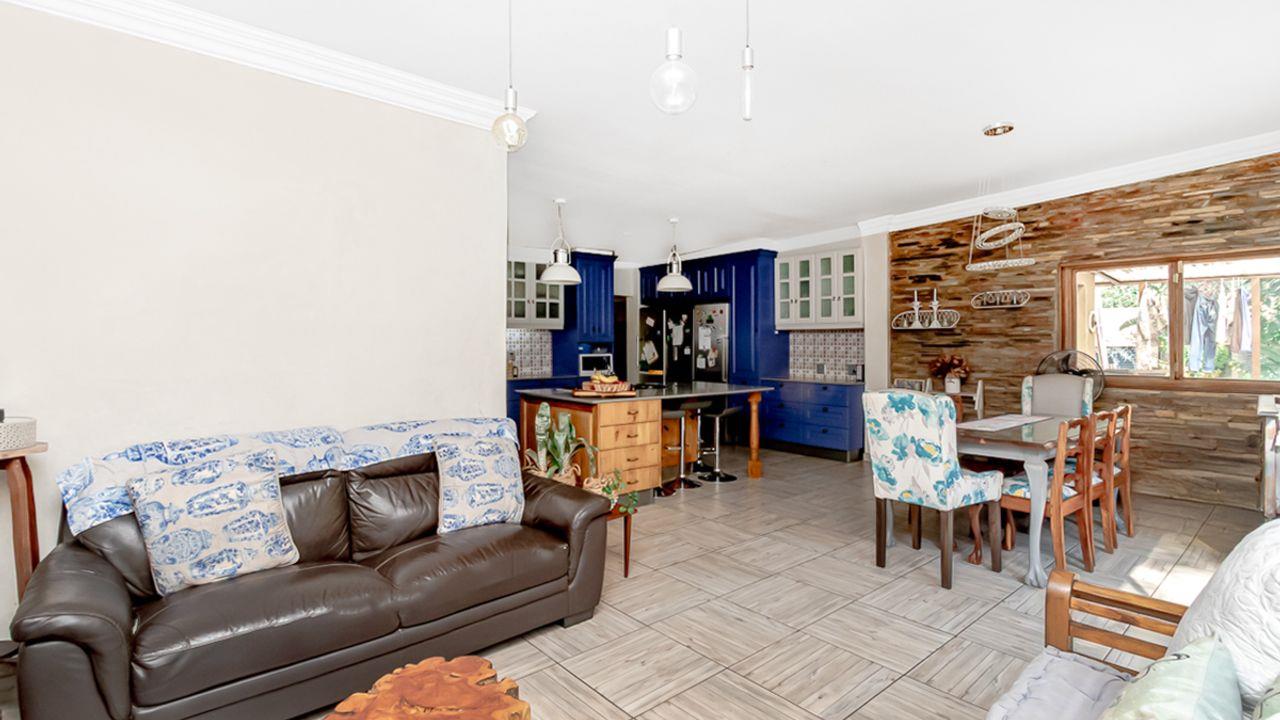 The main residence welcomes you with a charming entrance and boasts three spacious living areas, including an open-plan dining room and a modern, upgraded kitchen. The kitchen features ample cupboard space, a gas stove, stylish countertops, a separate scullery, and a walk-in pantry. The dining area flows effortlessly out to the garden, where you'll find a built-in braai and pizza oven perfect for entertaining. The property also includes a dedicated laundry area for added convenience.