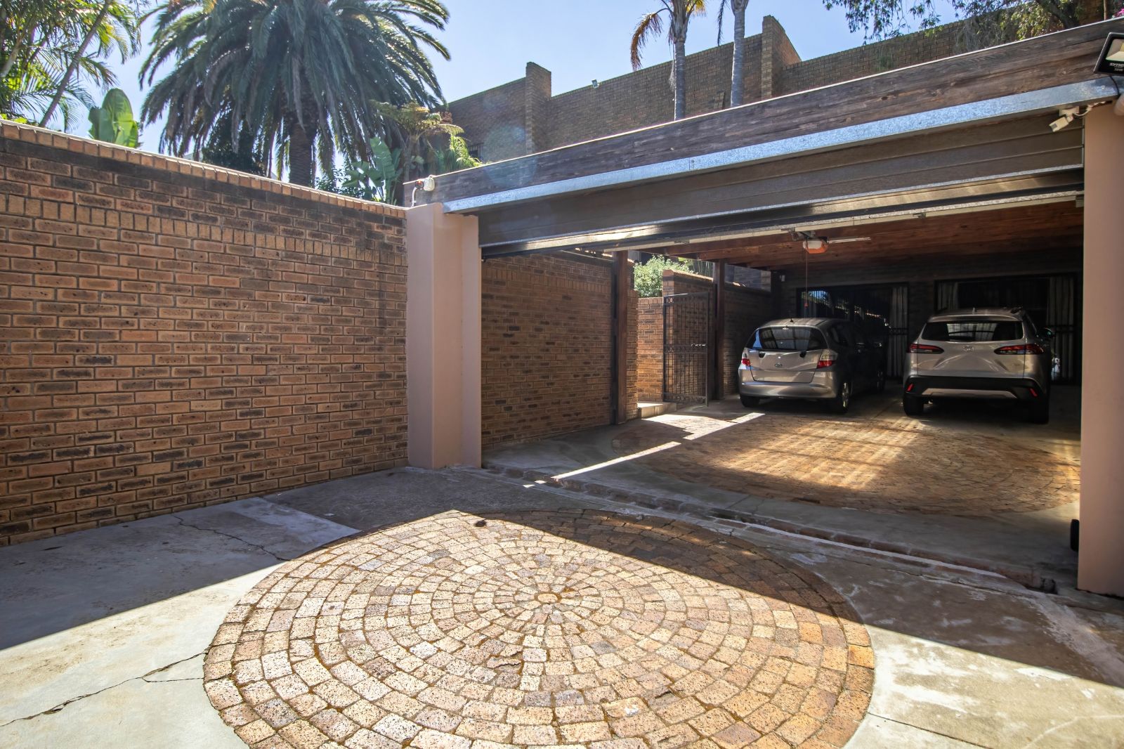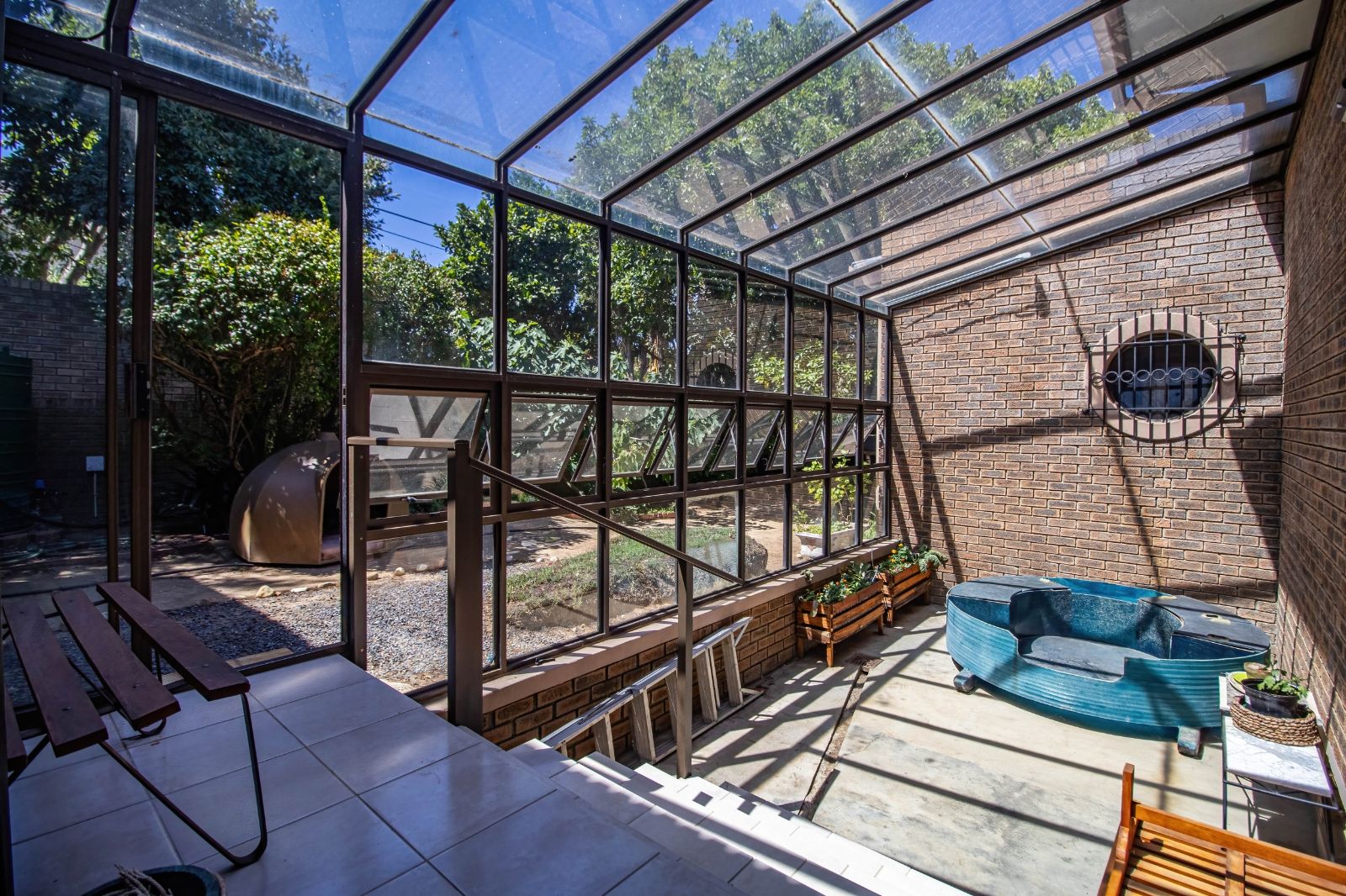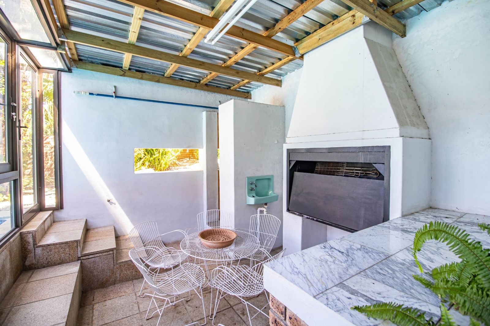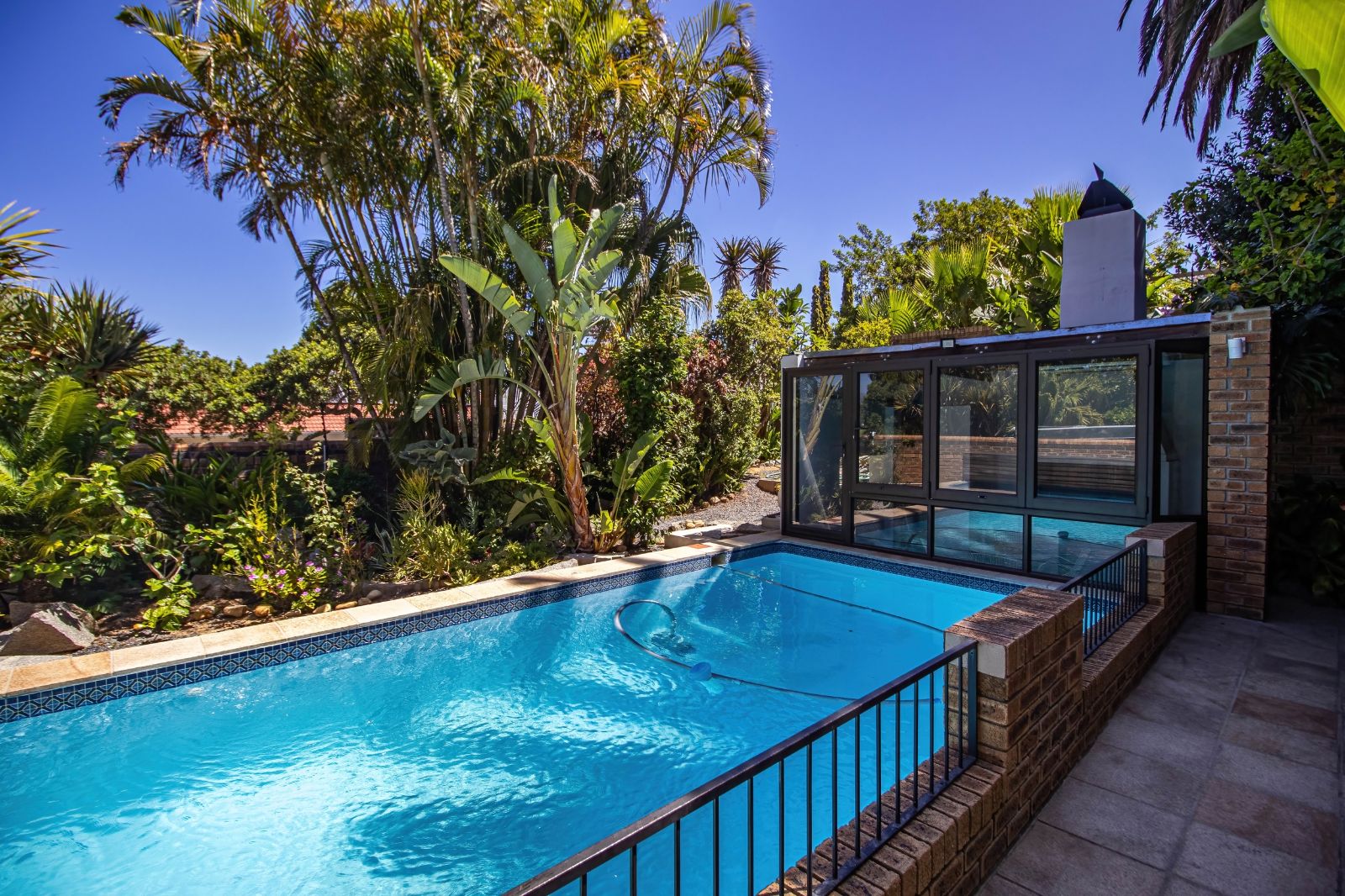 The garden is designed for ease of upkeep and includes a sparkling swimming pool with automatic pool cover, plus an enclosed braai room with shower and basin. Perfect for all-season entertainment.