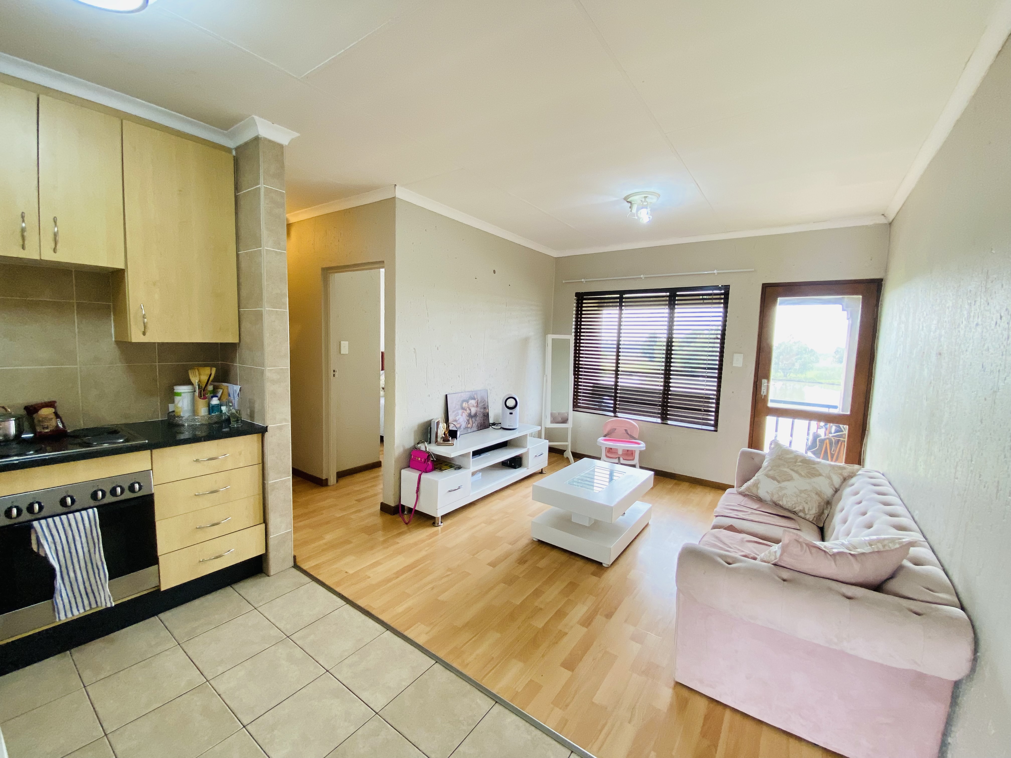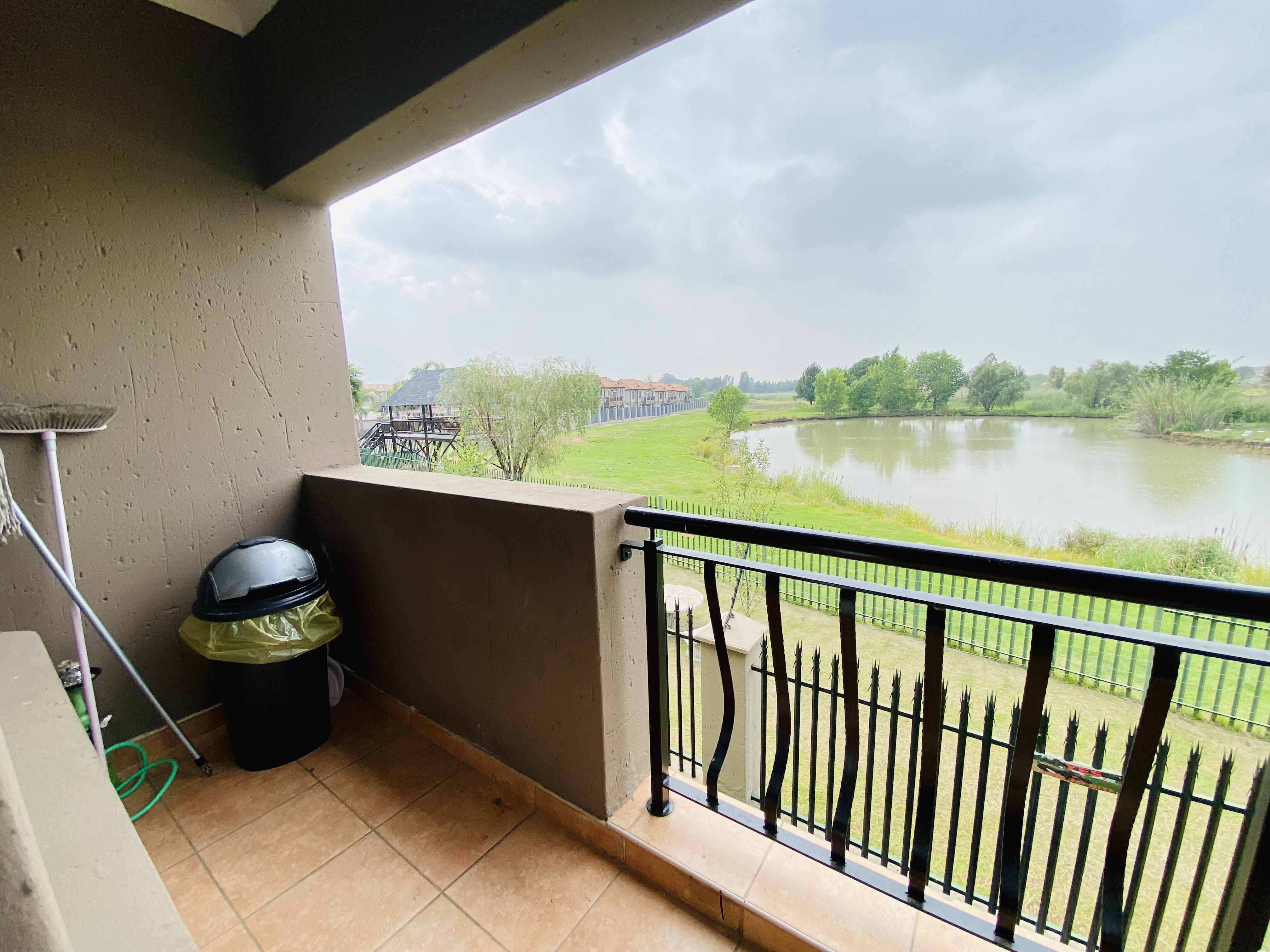 The apartment boasts a stunning view of a dam and ostriches, providing a peaceful and picturesque setting. The kitchen is equipped with ample cupboard space, perfect for storage and organization. The open plan lounge features laminated floors, creating a modern and stylish atmosphere.