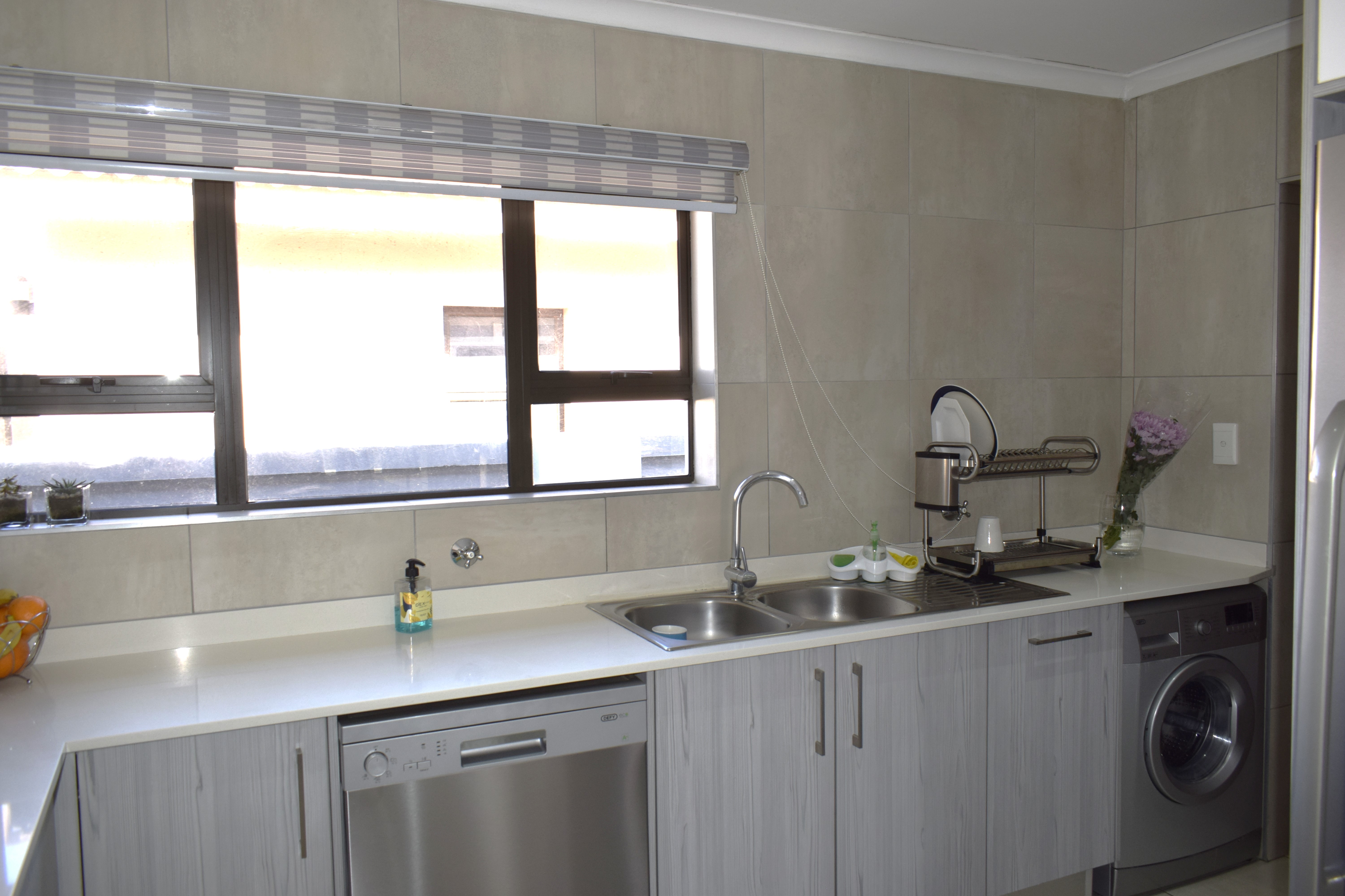 Large scullery with double sink, space for 3 appliances.