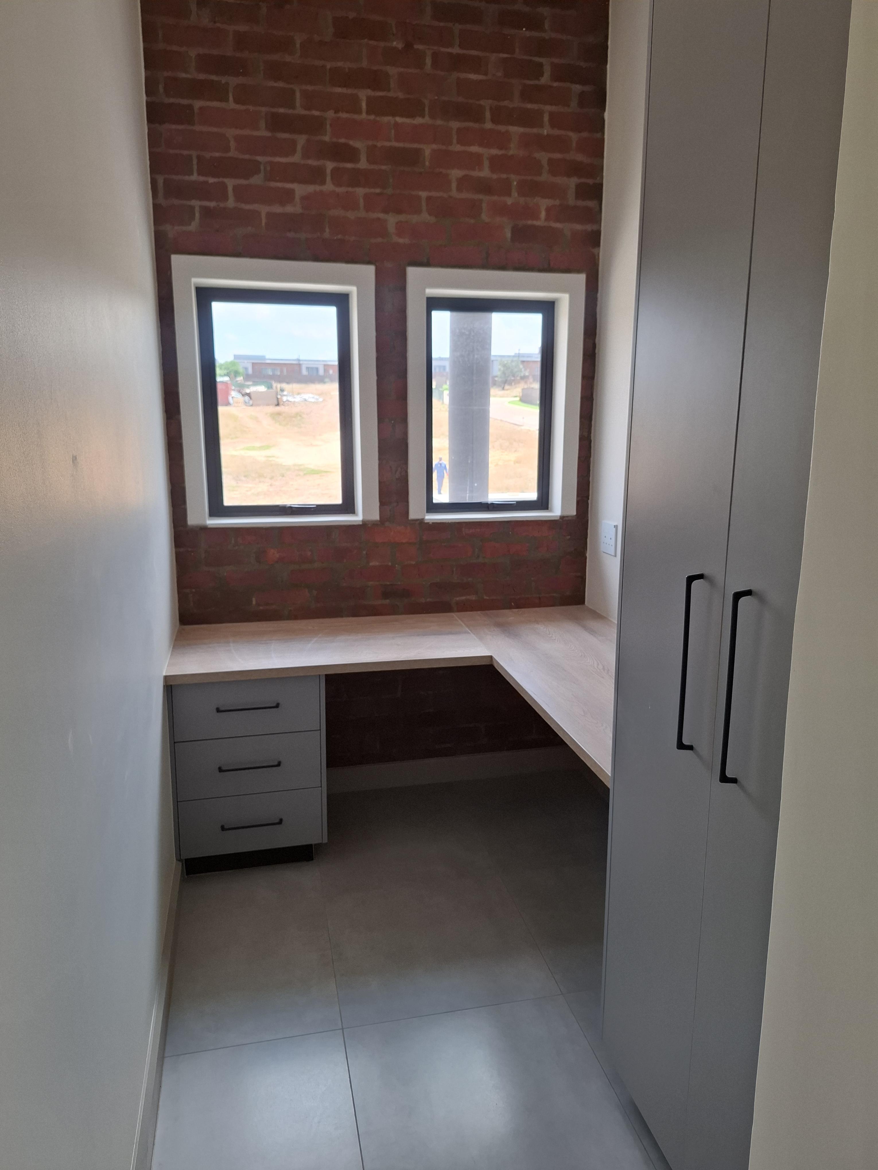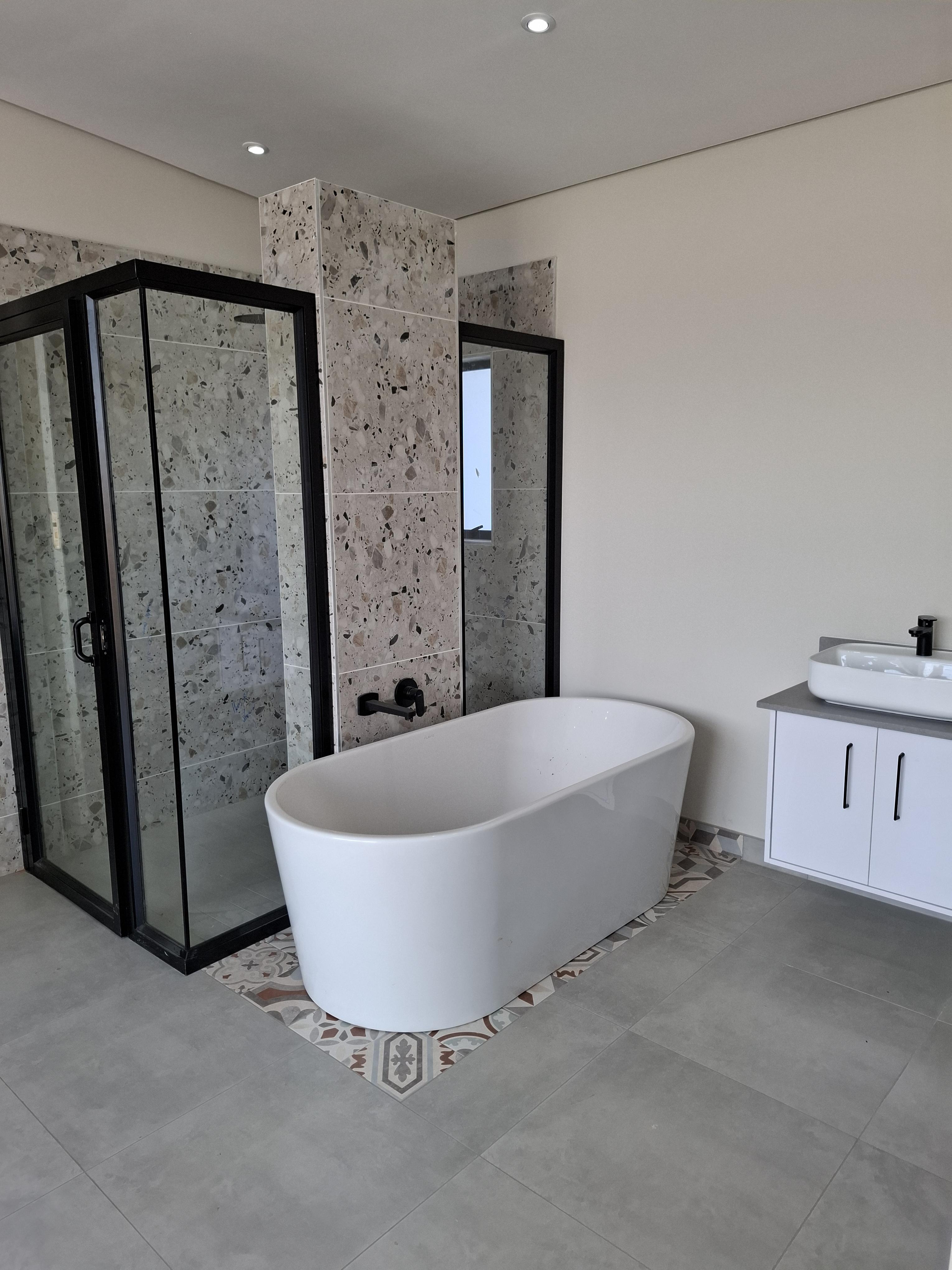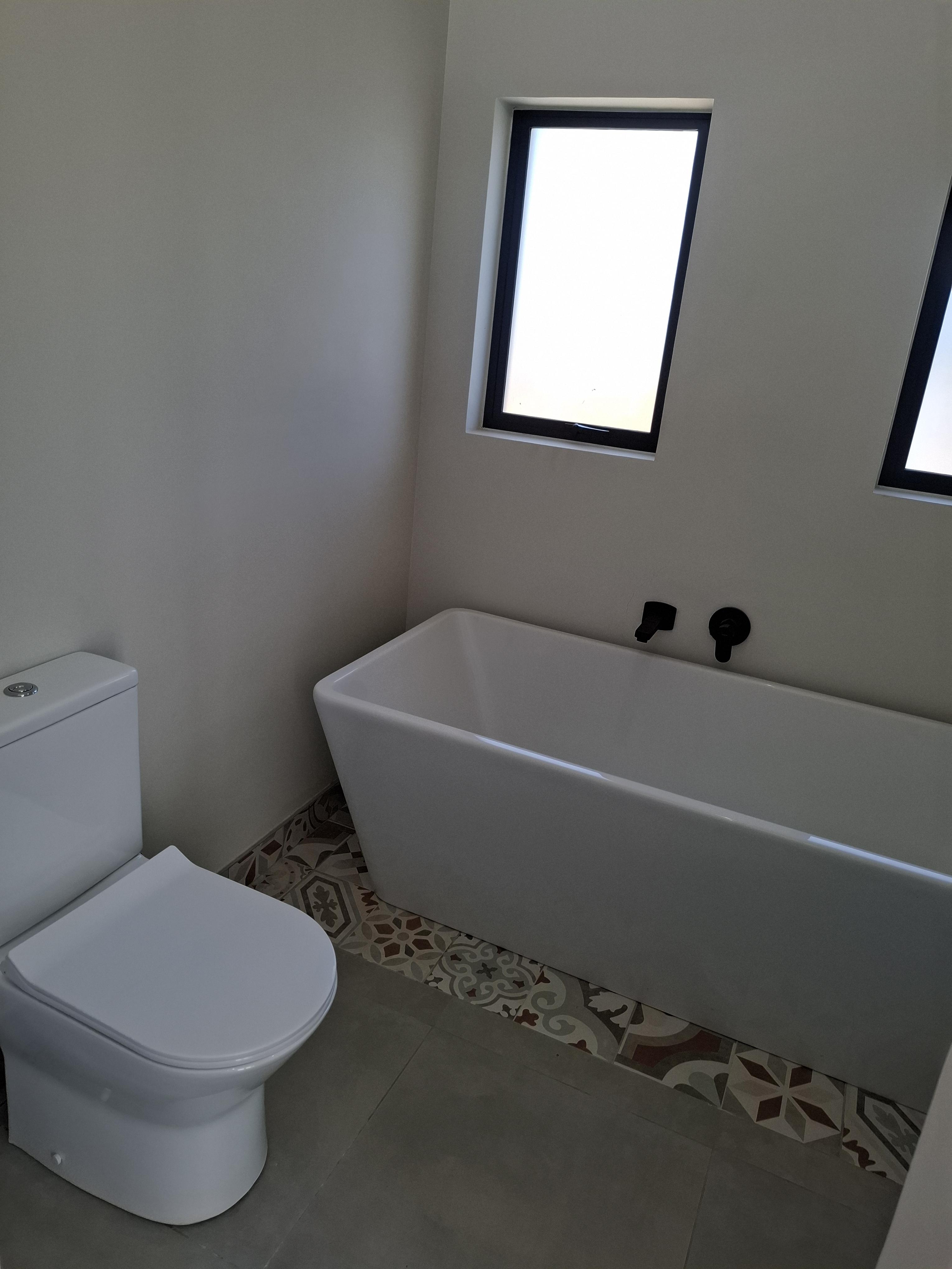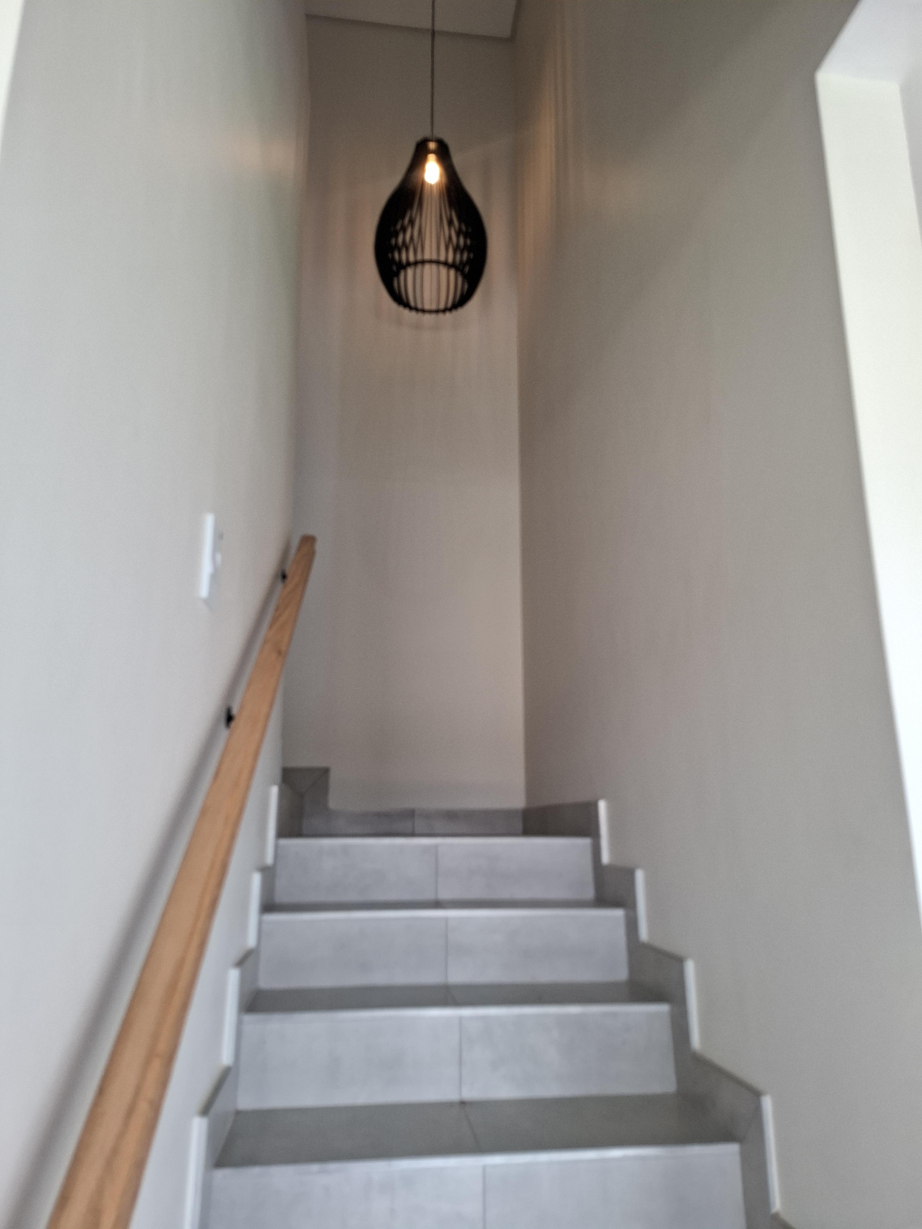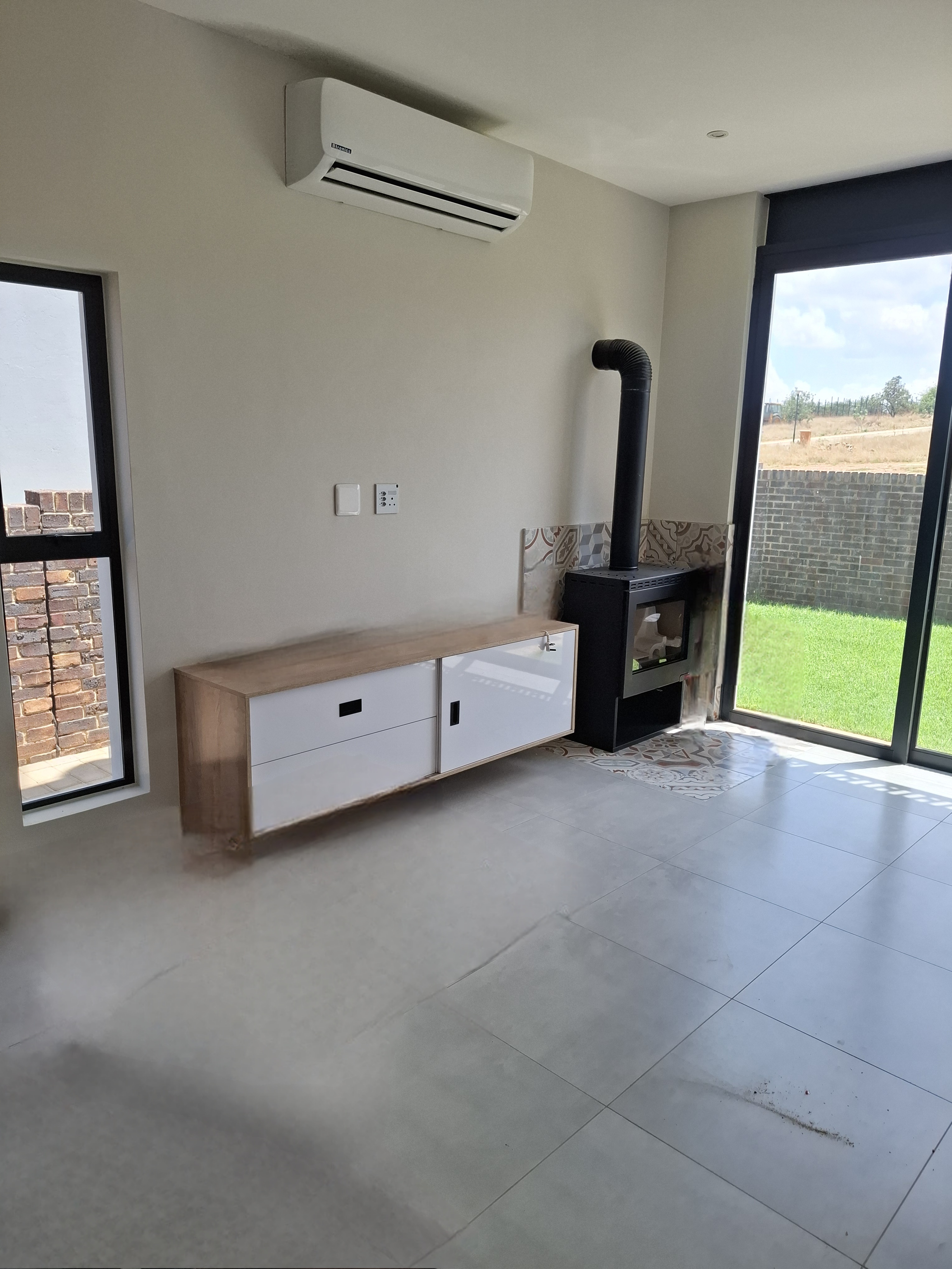 Upstairs, you’ll find two beautifully designed bedrooms and a study corner, perfect for working from home or extra storage space. The main bedroom features a luxurious en-suite bathroom complete with a bath, shower, toilet, and basin, as well as ample built-in cupboards. The guest bedroom upstairs includes its own bathroom with bath, toilet, and basin, and opens onto a private balcony — a perfect spot to enjoy morning coffee or unwind at sunset. Downstairs, a third bedroom offers its own bathroom with shower and basin, ideal for guests or family members preferring ground-floor access. The open-plan living area flows effortlessly into a modern kitchen with sleek finishes, leading out to a covered patio with a built-in braai — perfect for entertaining. 2 x Gas Geysers 5 Burner gas stove, electric oven- Gas bottles will be supplied. Aircon in main bedroom and living area Slow combustion fireplace 5 KVA Inverter with Battery and 5 solar panels Water filtration for household use in scullery/kitchen