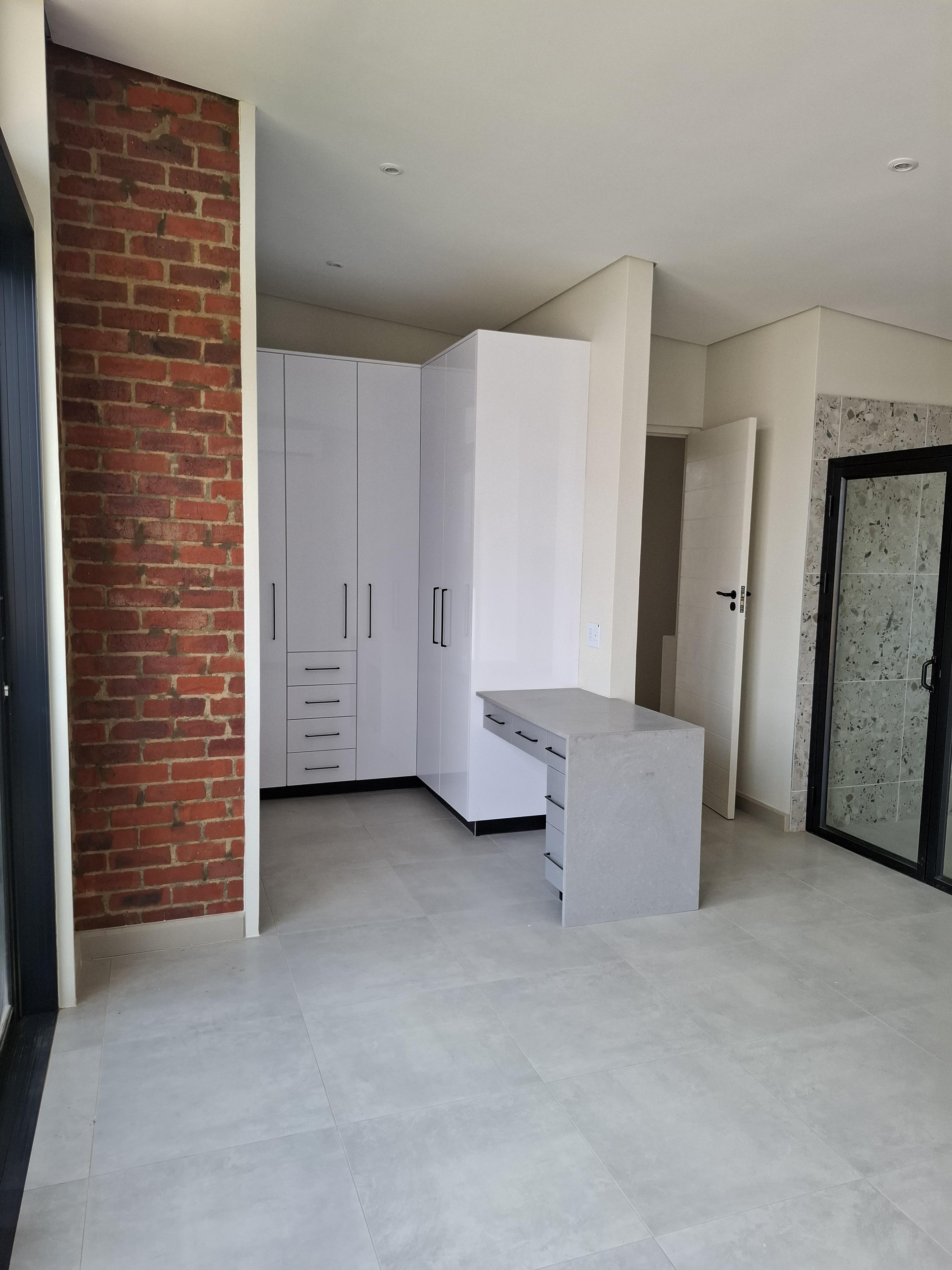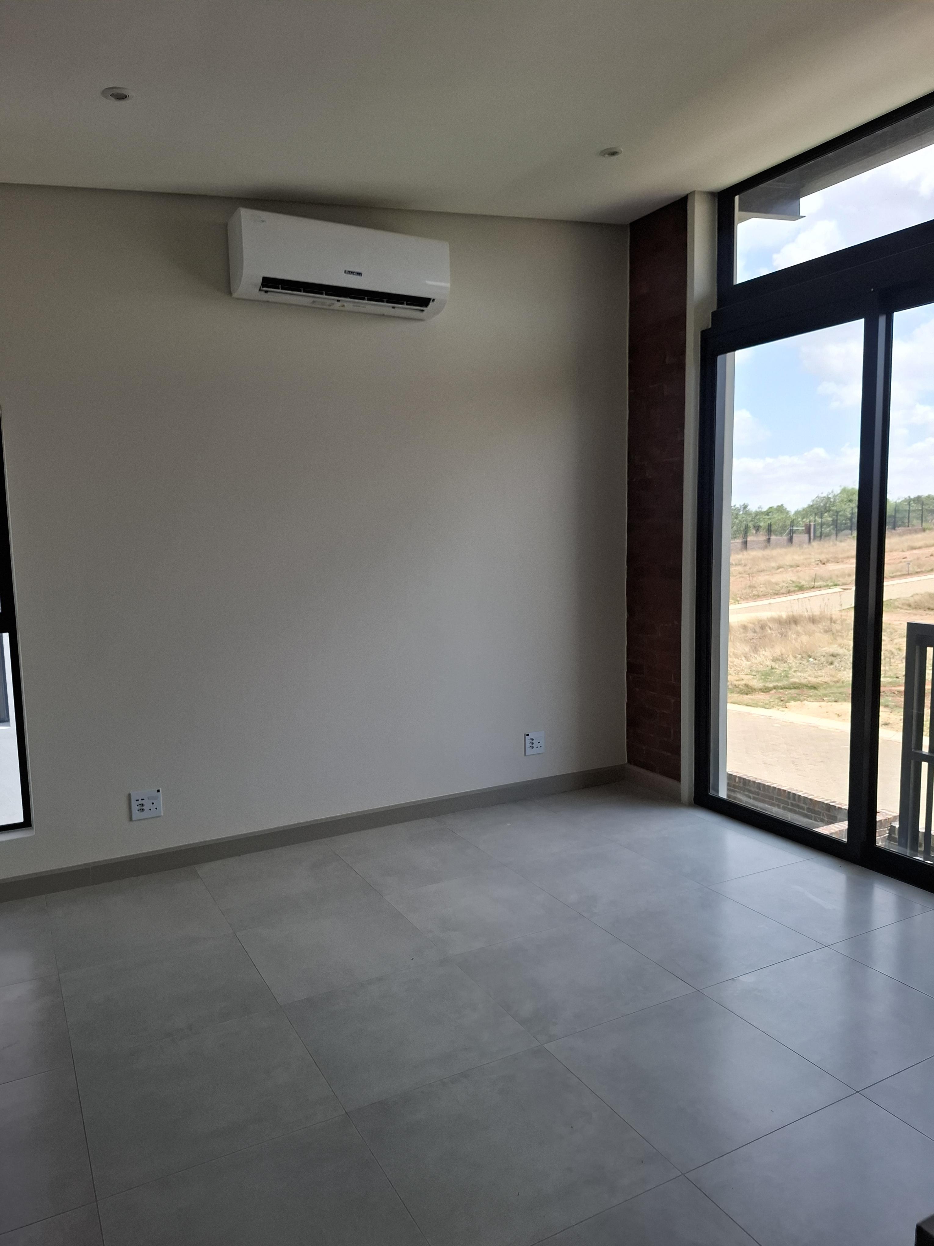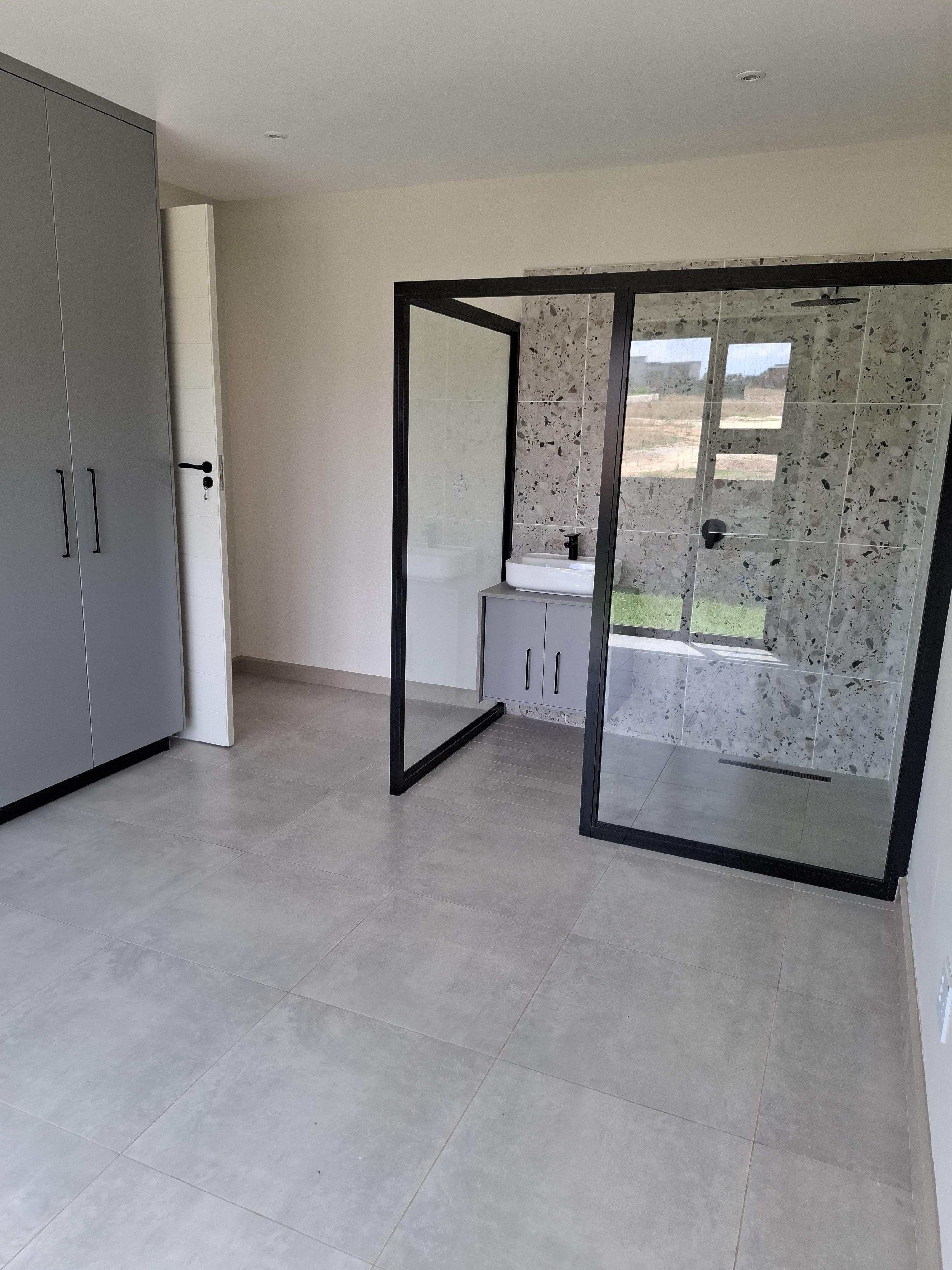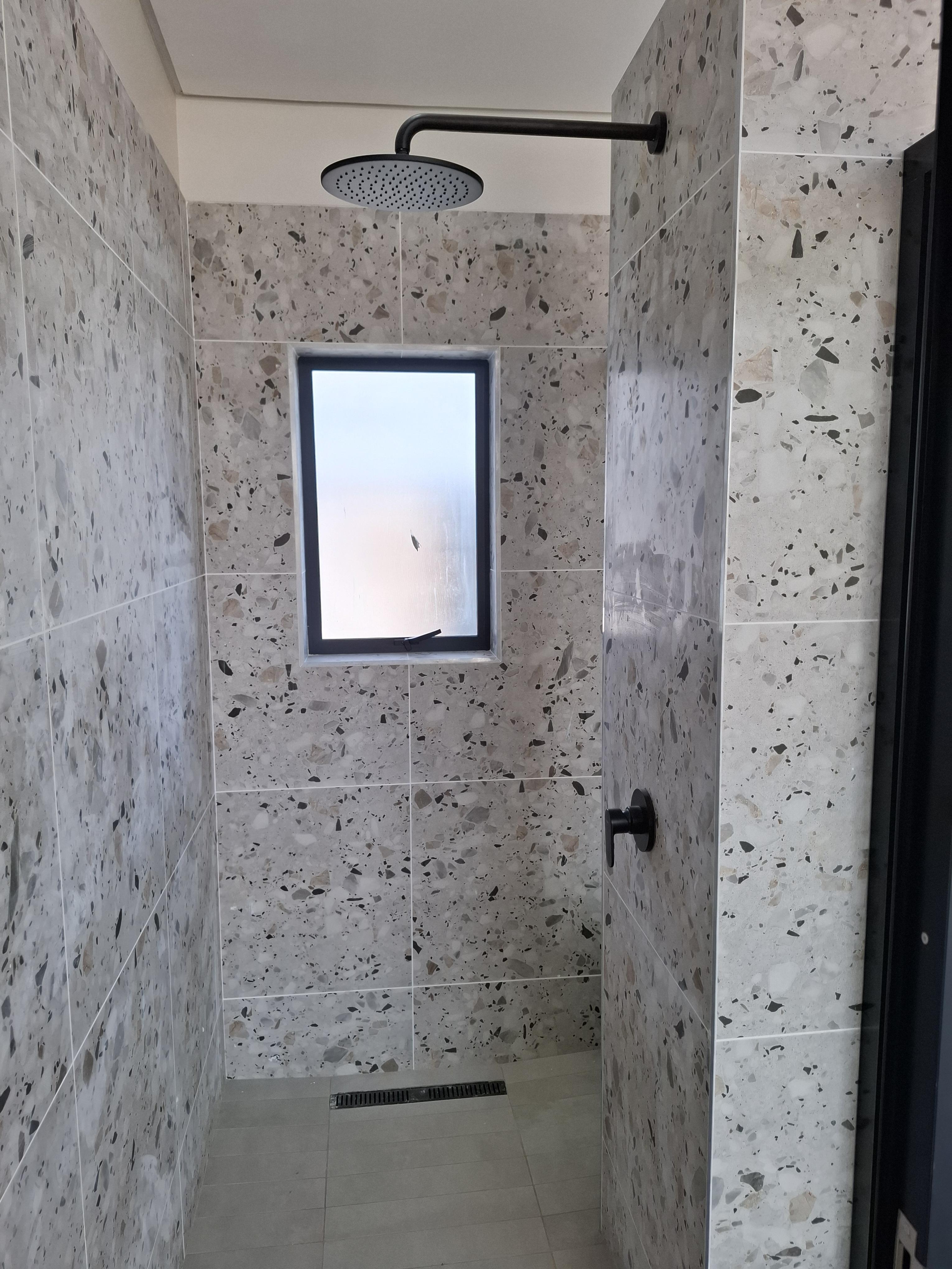 Upstairs, you’ll find two beautifully designed bedrooms and a study corner, perfect for working from home or extra storage space. The main bedroom features a luxurious en-suite bathroom complete with a bath, shower, toilet, and basin, as well as ample built-in cupboards. The guest bedroom upstairs includes its own bathroom with bath, toilet, and basin, and opens onto a private balcony — a perfect spot to enjoy morning coffee or unwind at sunset. Downstairs, a third bedroom offers its own bathroom with shower and basin, ideal for guests or family members preferring ground-floor access. The open-plan living area flows effortlessly into a modern kitchen with sleek finishes, leading out to a covered patio with a built-in braai — perfect for entertaining. 2 x Gas Geysers 5 Burner gas stove, electric oven- Gas bottles will be supplied. Aircon in main bedroom and living area Slow combustion fireplace 5 KVA Inverter with Battery and 5 solar panels Water filtration for household use in scullery/kitchen