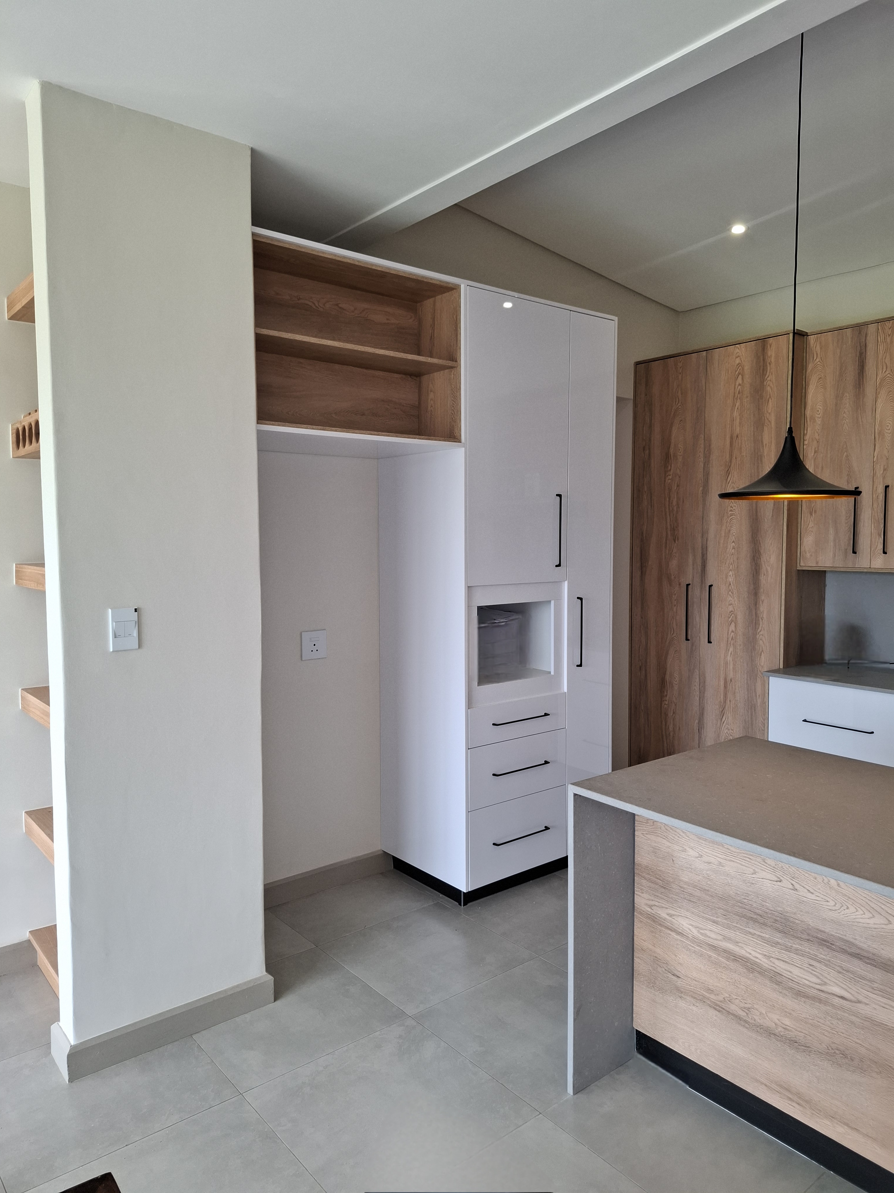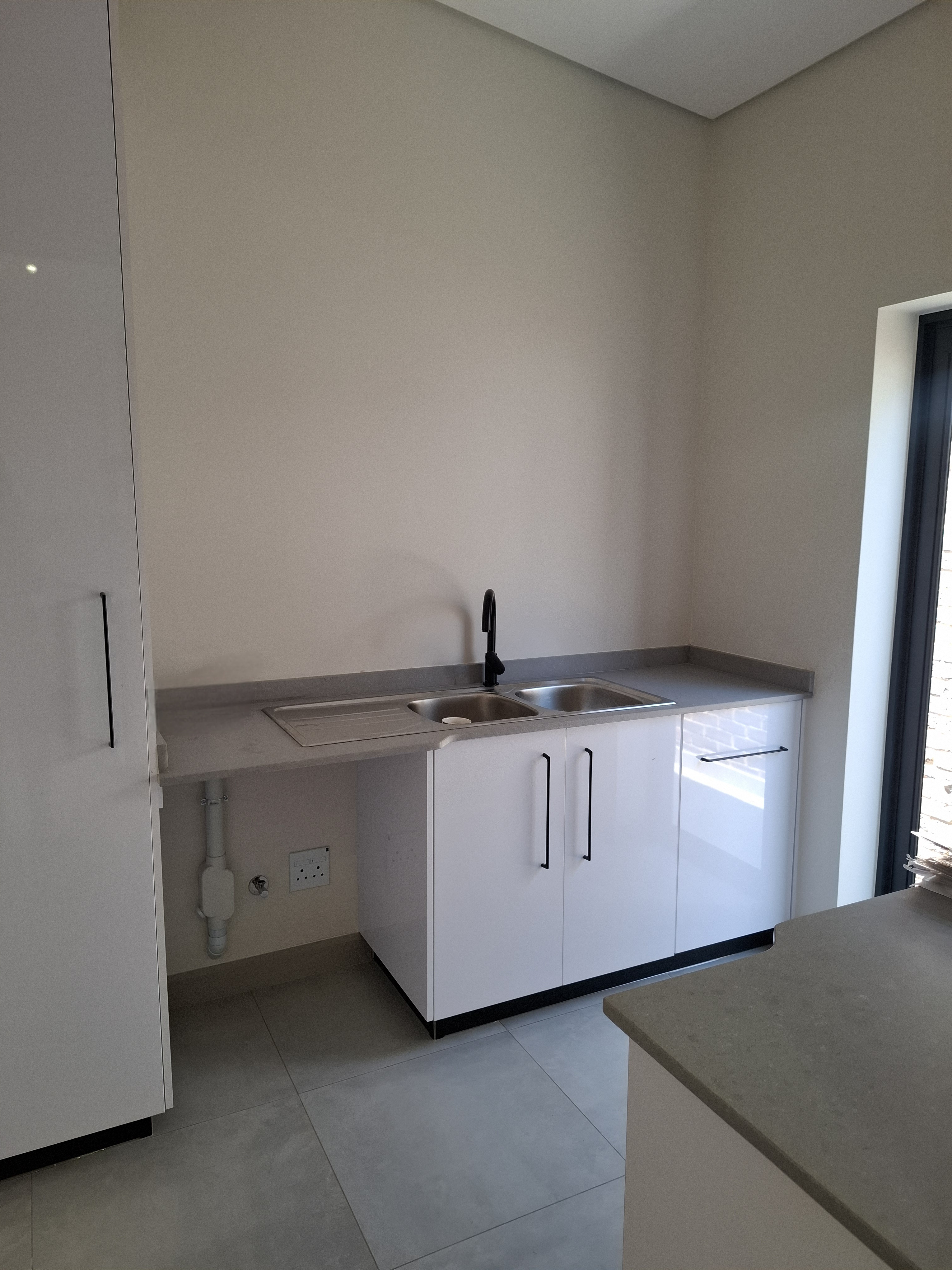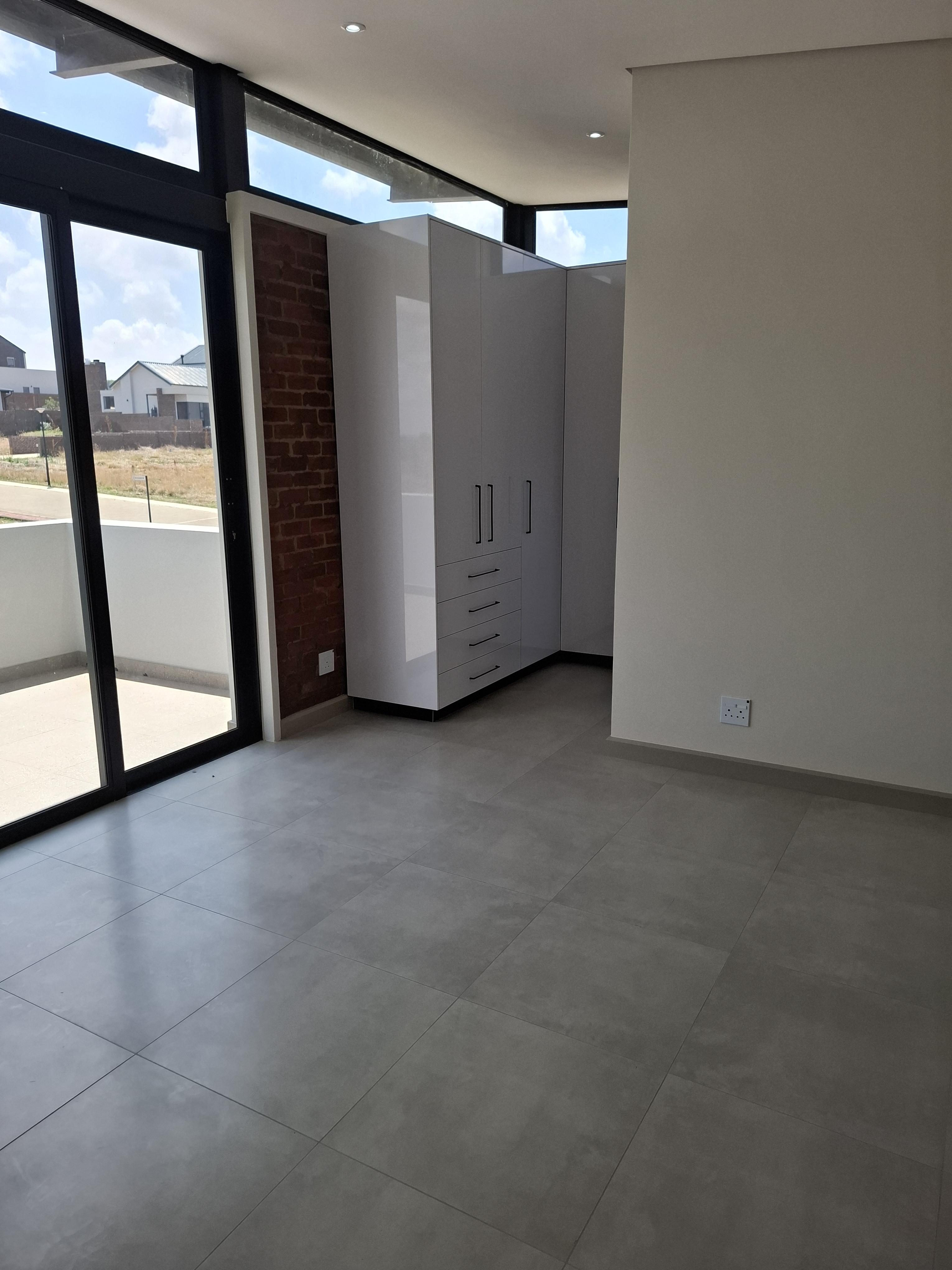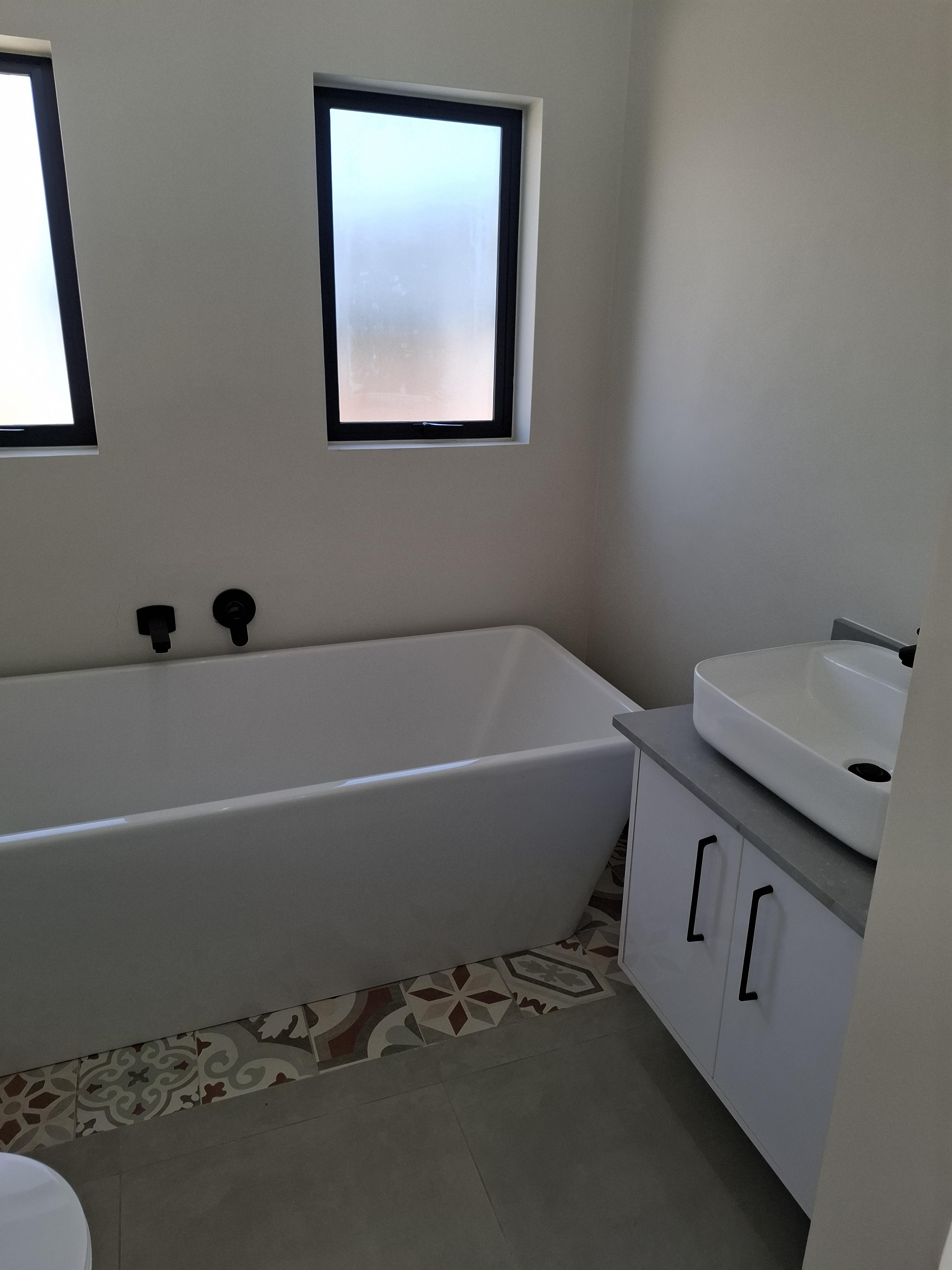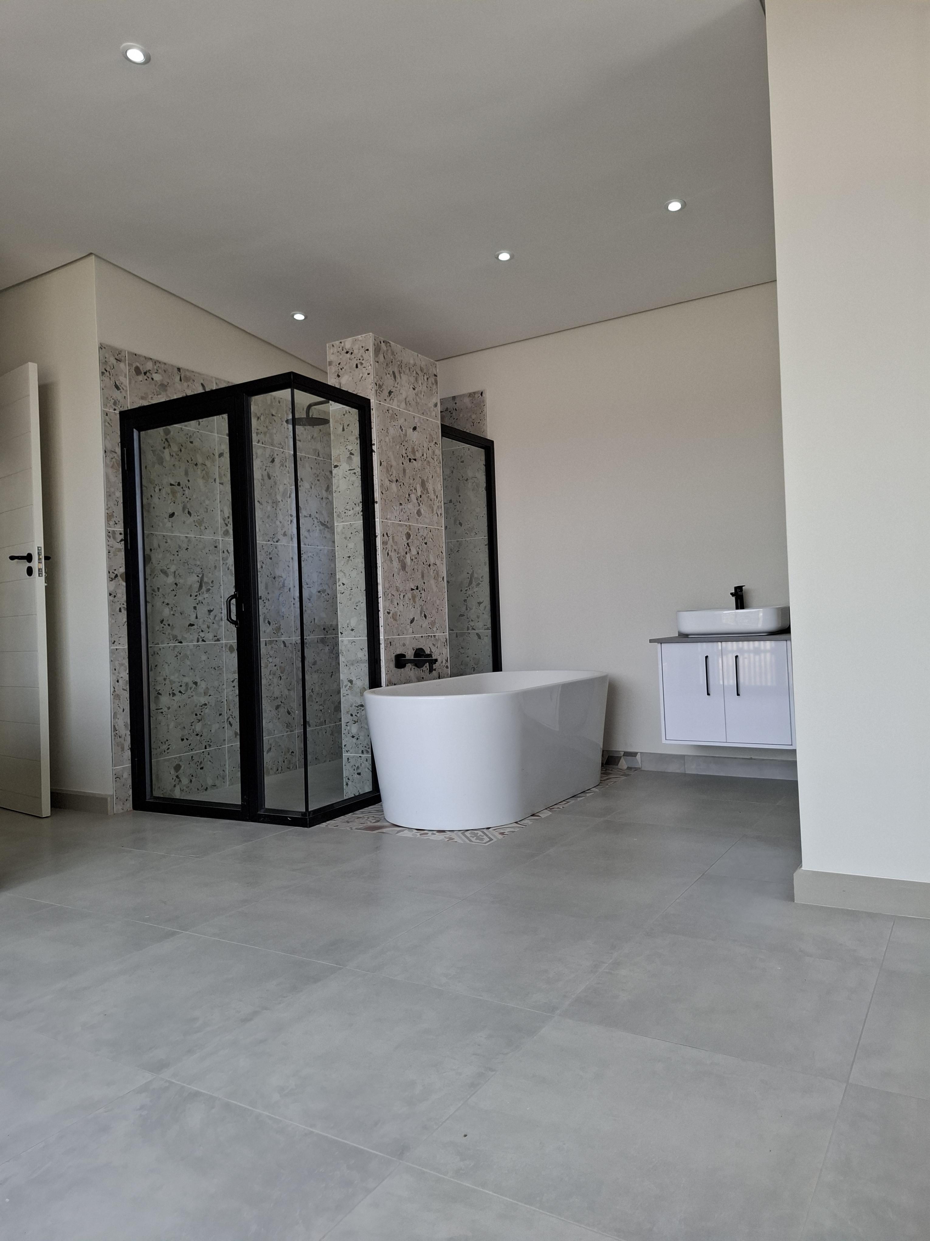Upstairs, you’ll find two beautifully designed bedrooms and a study corner, perfect for working from home or extra storage space. The main bedroom features a luxurious en-suite bathroom complete with a bath, shower, toilet, and basin, as well as ample built-in cupboards. The guest bedroom upstairs includes its own bathroom with bath, toilet, and basin, and opens onto a private balcony — a perfect spot to enjoy morning coffee or unwind at sunset. Downstairs, a third bedroom offers its own bathroom with shower and basin, ideal for guests or family members preferring ground-floor access. The open-plan living area flows effortlessly into a modern kitchen with sleek finishes, leading out to a covered patio with a built-in braai — perfect for entertaining. 2 x Gas Geysers 5 Burner gas stove, electric oven- Gas bottles will be supplied. Aircon in main bedroom and living area Slow combustion fireplace 5 KVA Inverter with Battery and 5 solar panels Water filtration for household use in scullery/kitchen