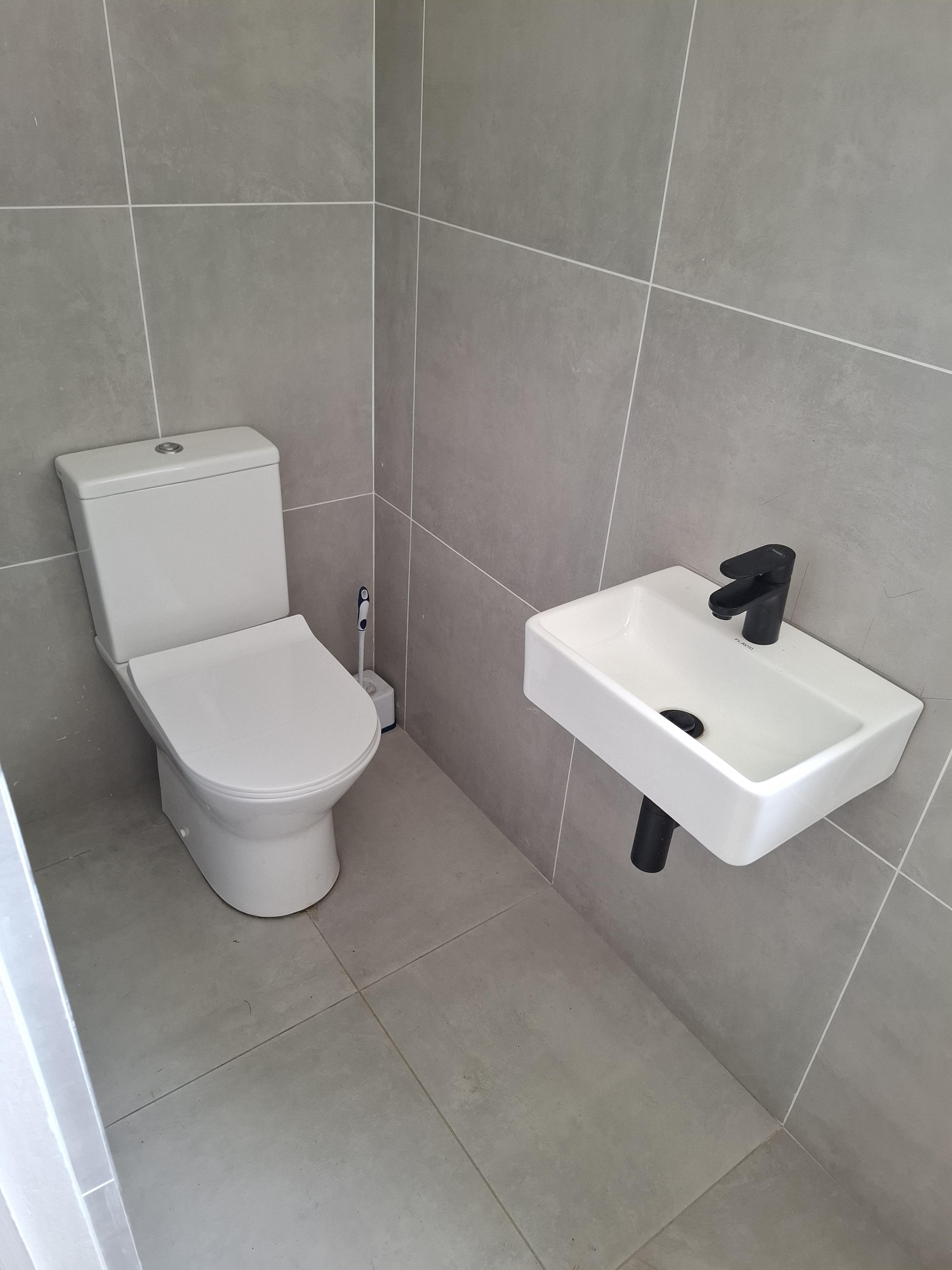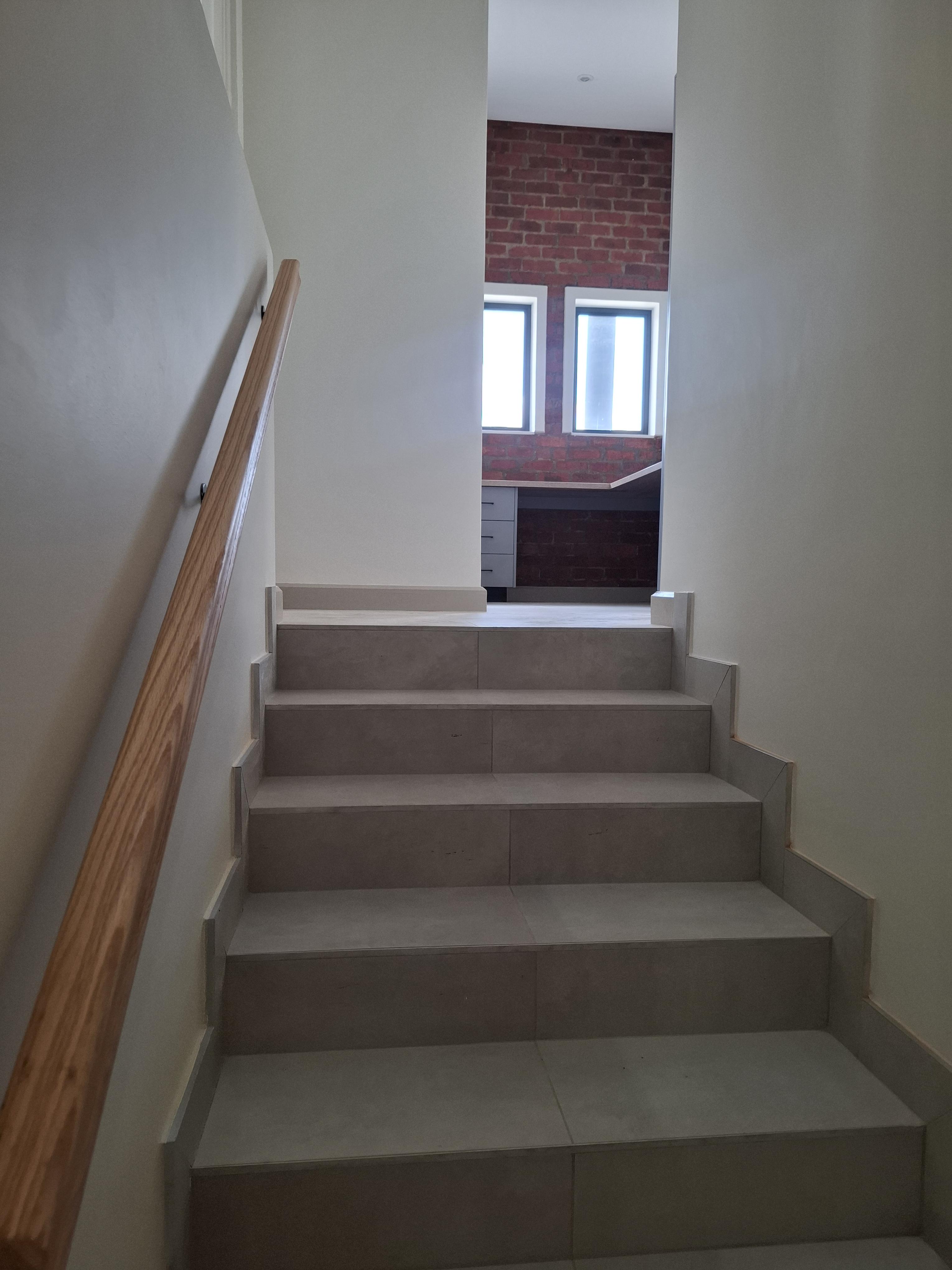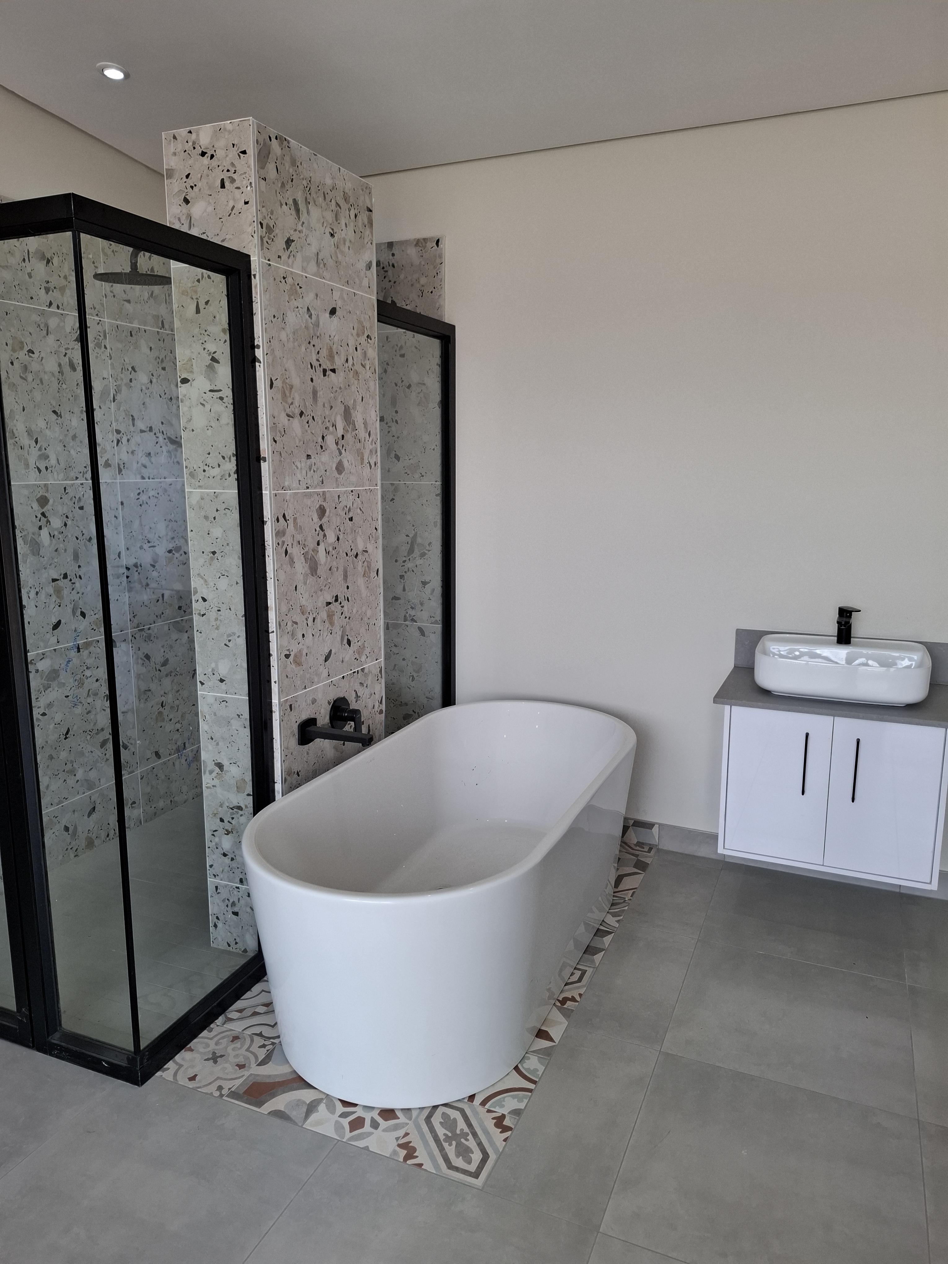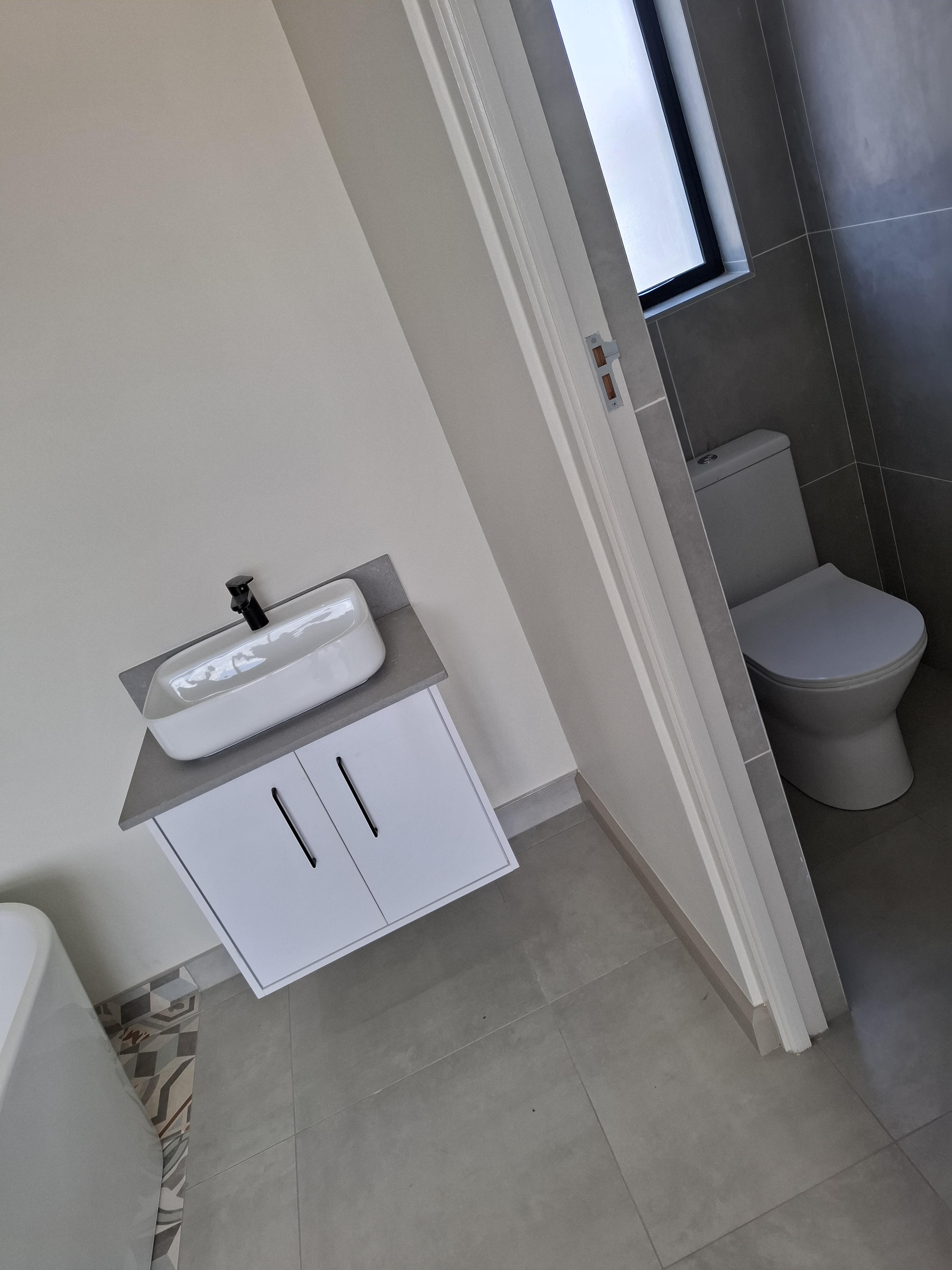 Ideal for tenants seeking upmarket living in a secure and peaceful environment. Upstairs, you’ll find two beautifully designed bedrooms and a study corner, perfect for working from home or extra storage space. The main bedroom features a luxurious en-suite bathroom complete with a bath, shower, toilet, and basin, as well as ample built-in cupboards. The guest bedroom upstairs includes its own bathroom with bath, toilet, and basin, and opens onto a private balcony — a perfect spot to enjoy morning coffee or unwind at sunset. Downstairs, a third bedroom offers its own bathroom with shower and basin, ideal for guests or family members preferring ground-floor access. The open-plan living area flows effortlessly into a modern kitchen with sleek finishes, leading out to a covered patio with a built-in braai — perfect for entertaining. No Pets No Smoking