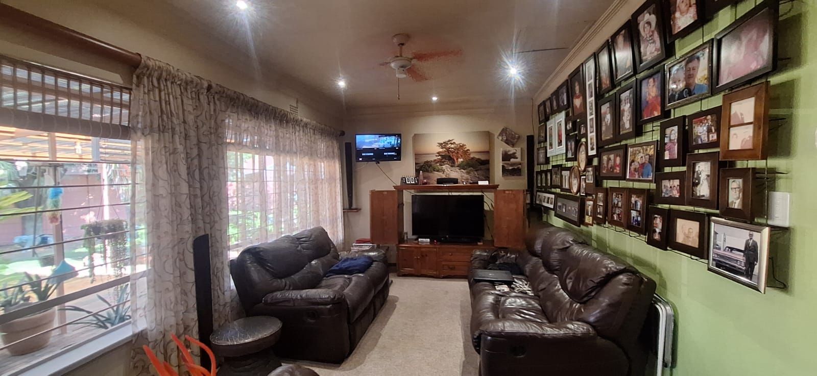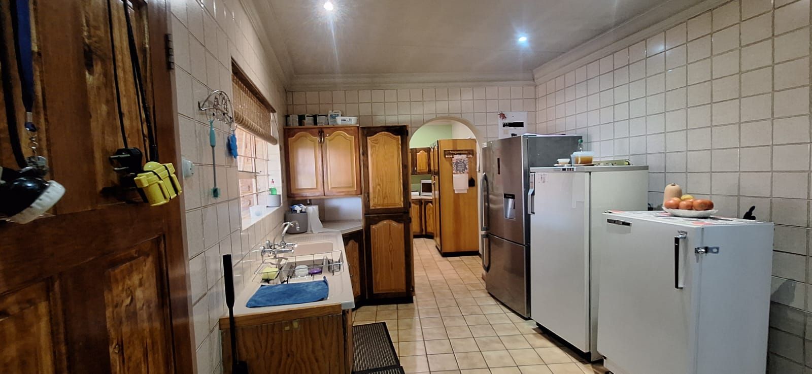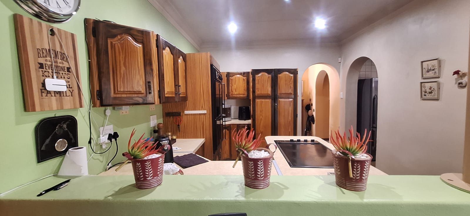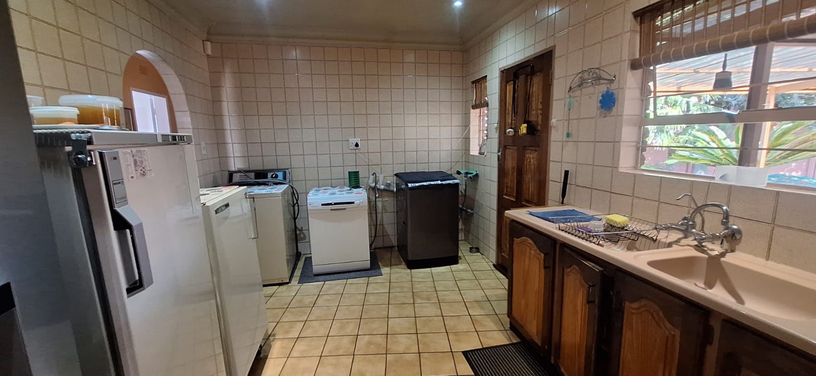 The main house welcomes you with a generous open-plan layout that makes everyday living and entertaining effortless. The modern kitchen is both functional and inviting, offering wooden cupboards, ample counter space, an electric stove with oven, and a spacious scullery. It flows seamlessly into the dining and living areas, creating a warm and welcoming space for family gatherings. A second lounge or TV room adds extra flexibility and can easily be used as a study or work-from-home office.
