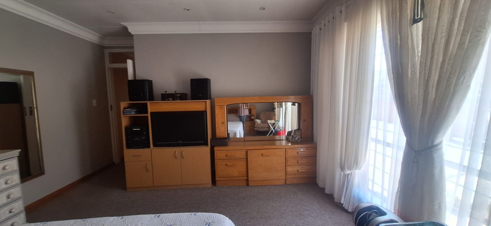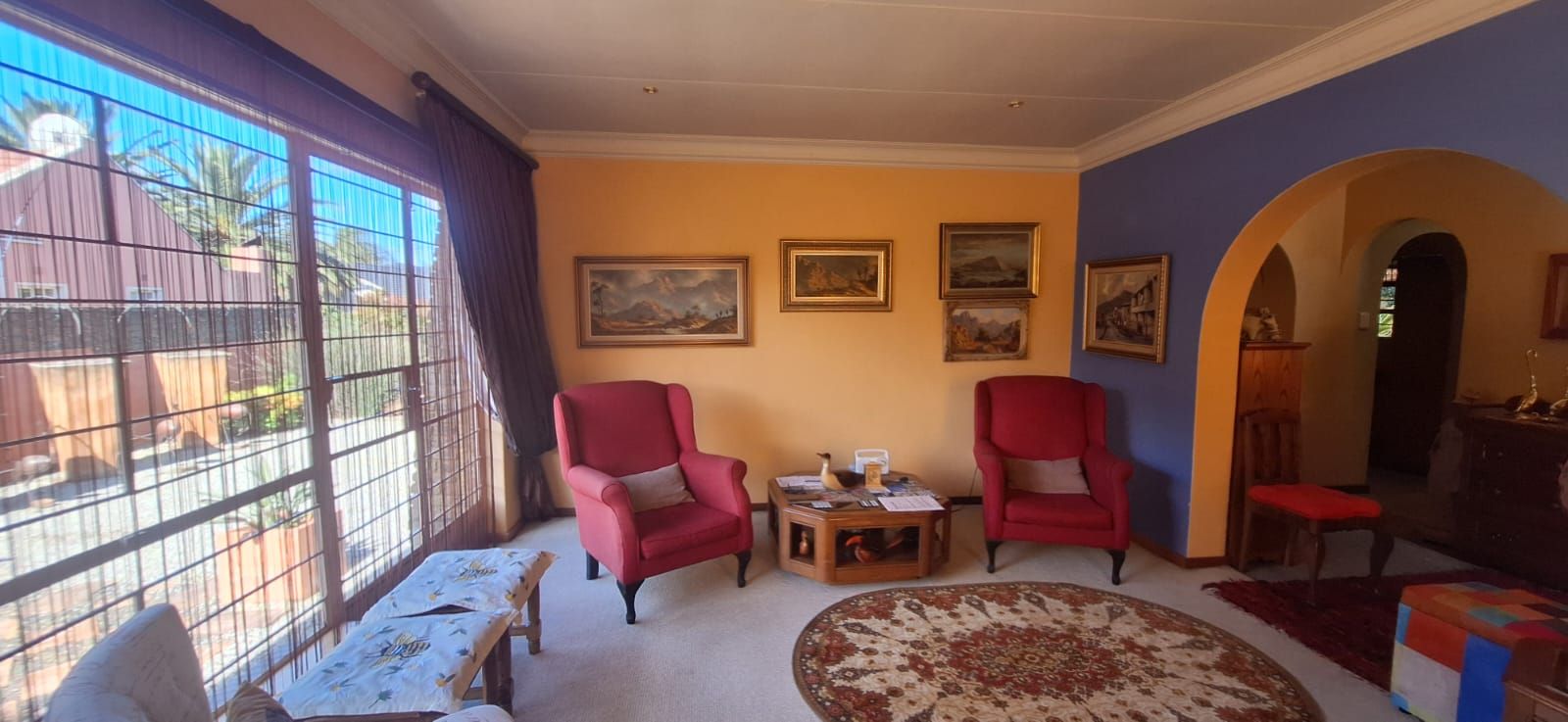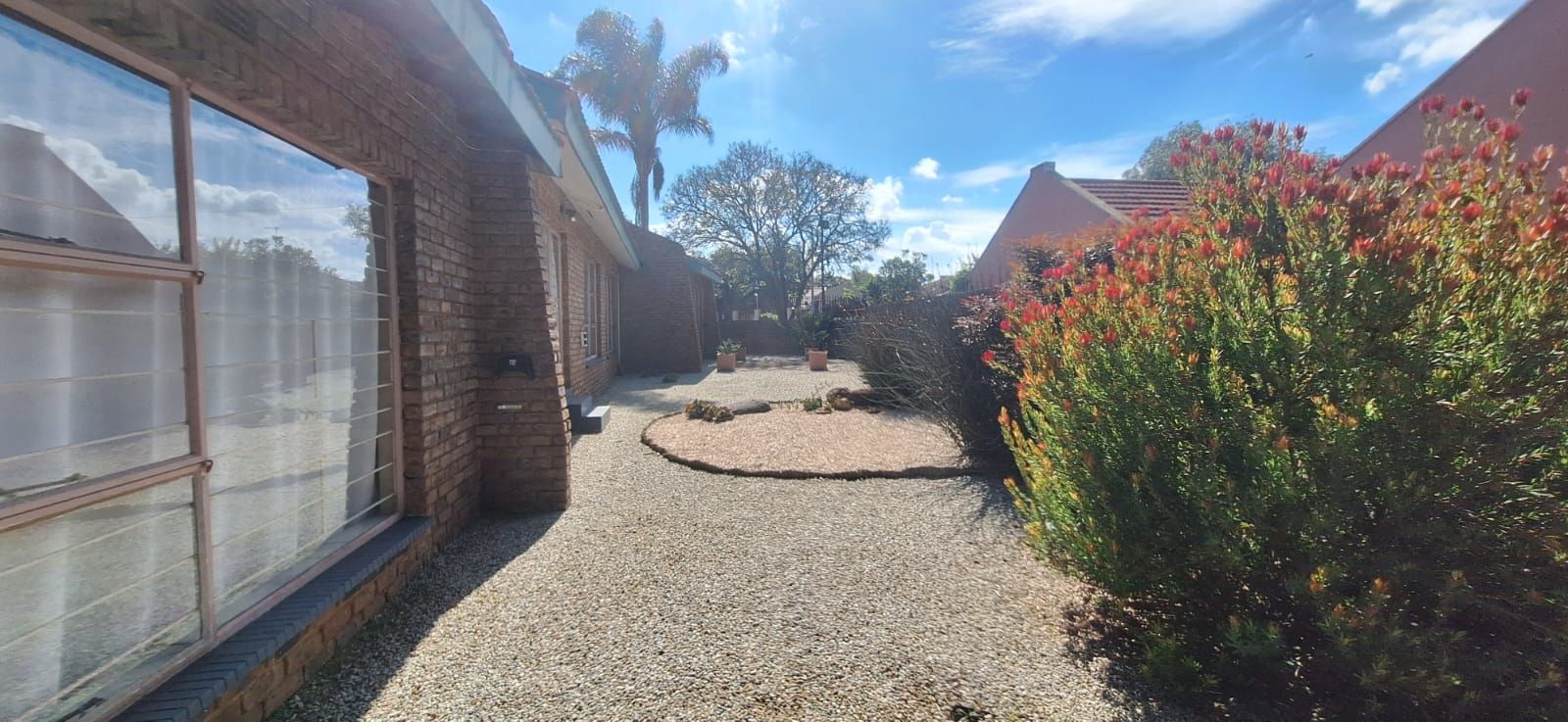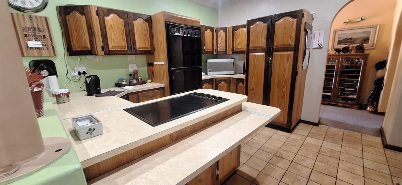 The main house welcomes you with a generous open-plan layout that makes everyday living and entertaining effortless. The modern kitchen is both functional and inviting, offering wooden cupboards, ample counter space, an electric stove with oven, and a spacious scullery. It flows seamlessly into the dining and living areas, creating a warm and welcoming space for family gatherings. A second lounge or TV room adds extra flexibility and can easily be used as a study or work-from-home office.
