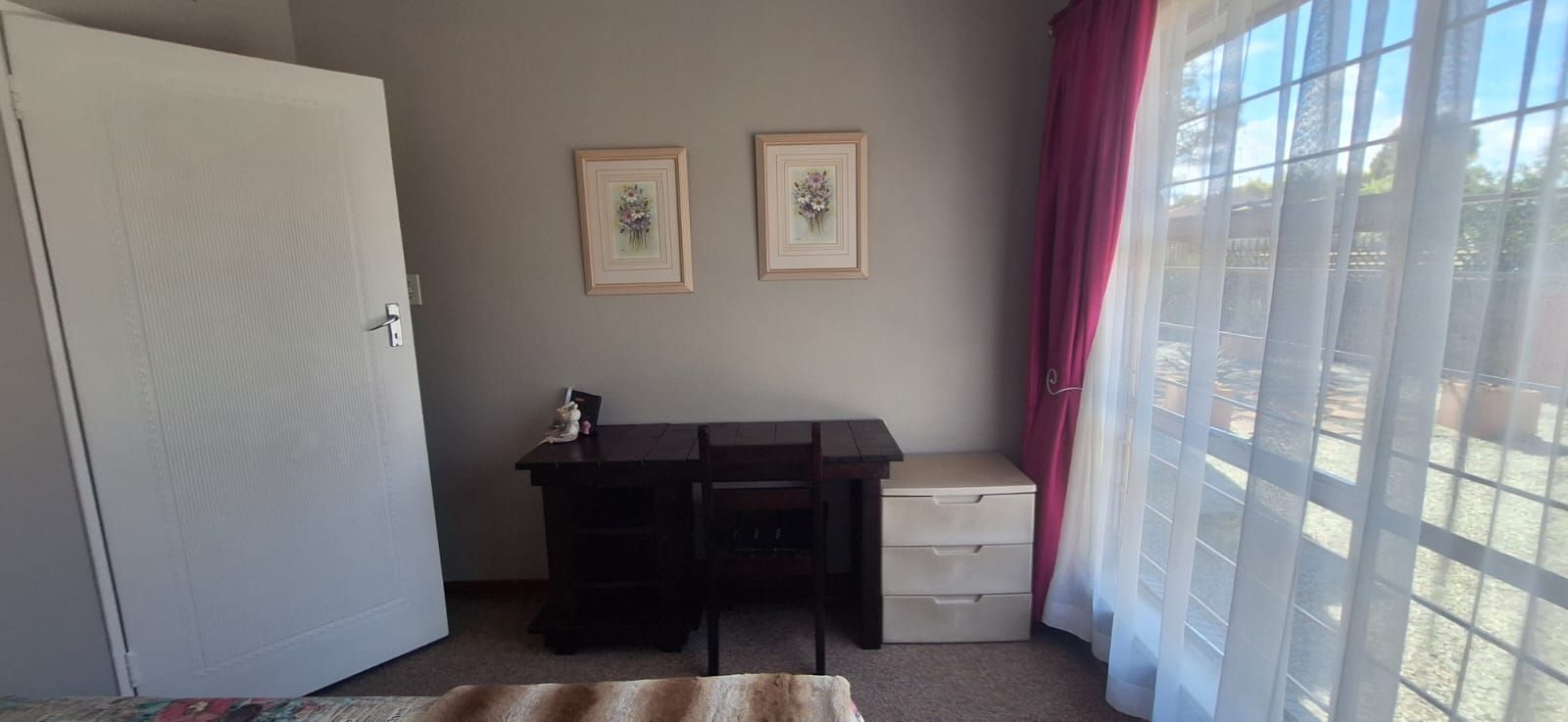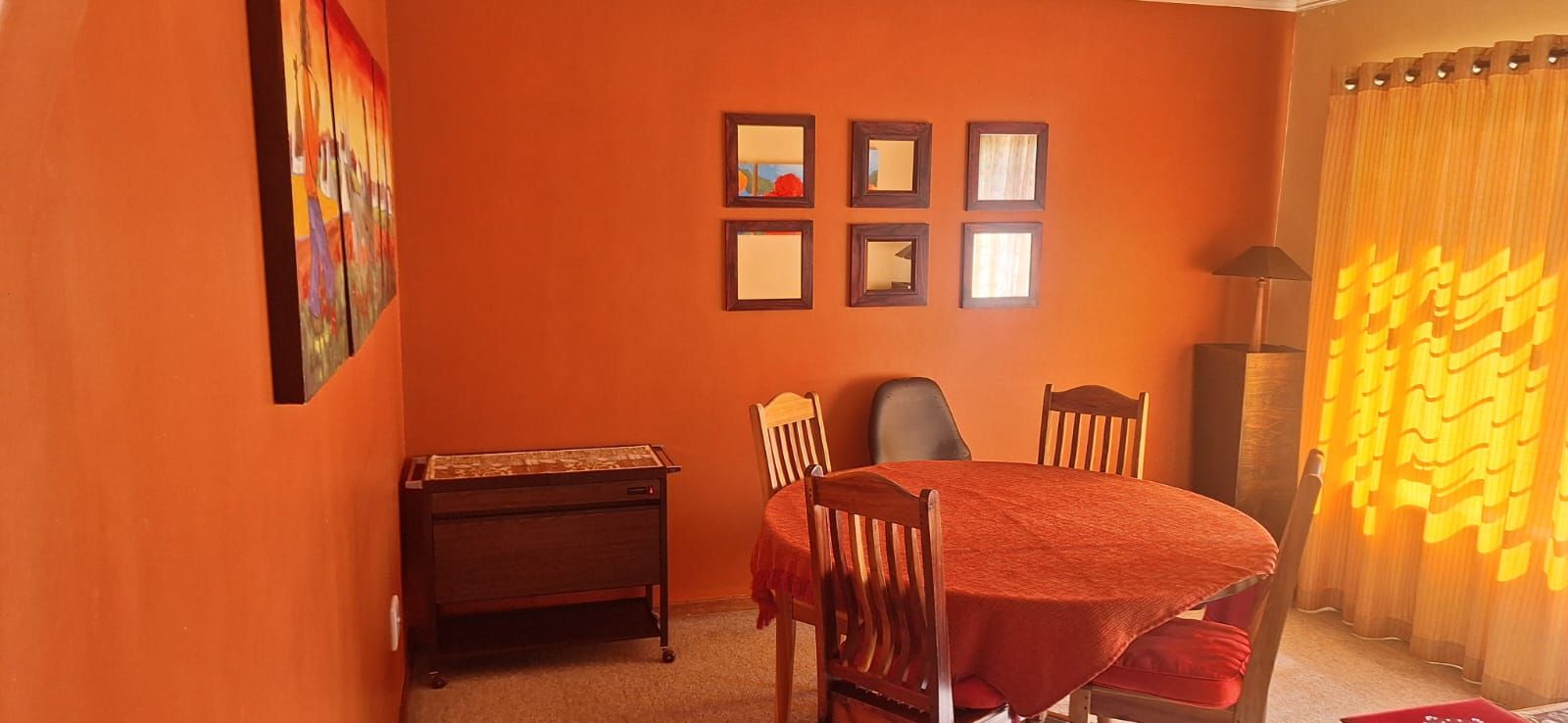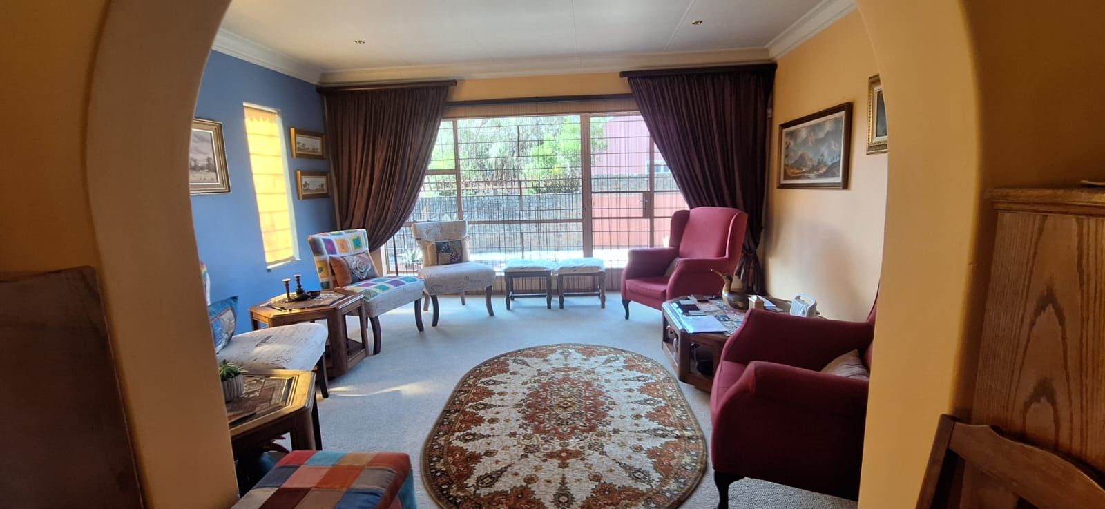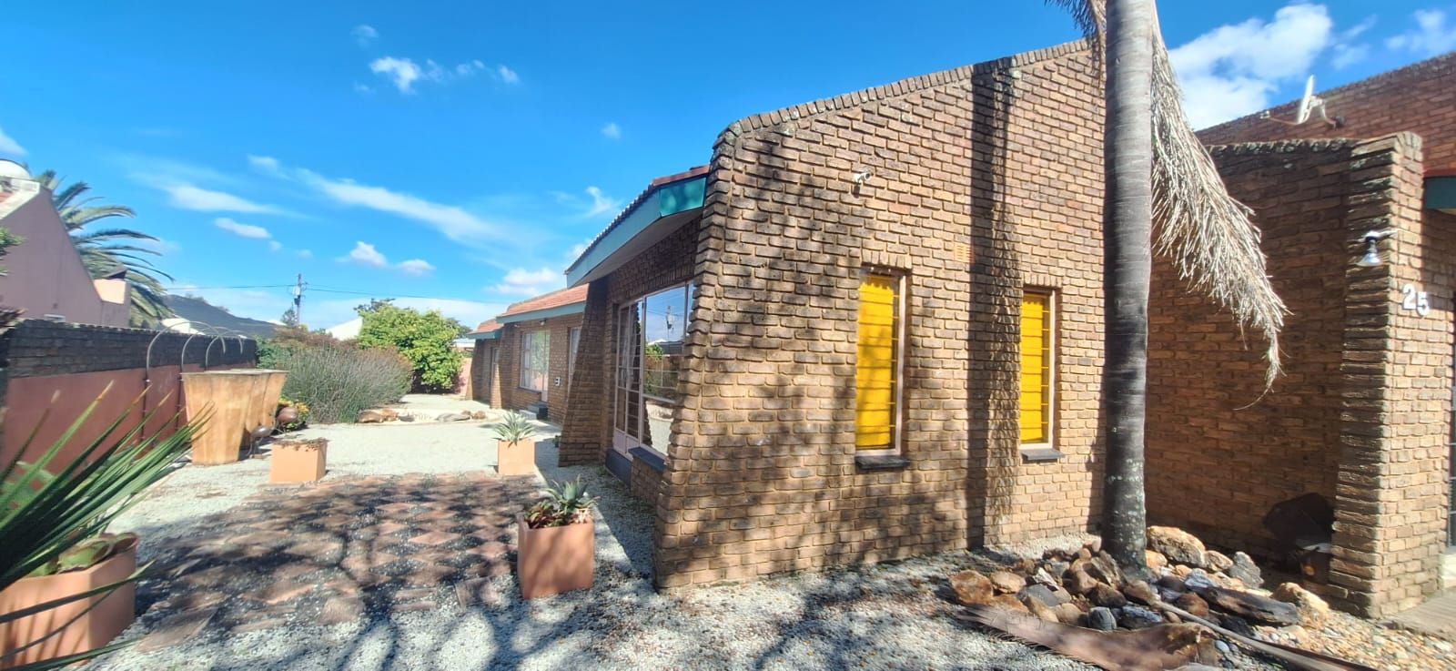 The main house welcomes you with a generous open-plan layout that makes everyday living and entertaining effortless. The modern kitchen is both functional and inviting, offering wooden cupboards, ample counter space, an electric stove with oven, and a spacious scullery. It flows seamlessly into the dining and living areas, creating a warm and welcoming space for family gatherings. A second lounge or TV room adds extra flexibility and can easily be used as a study or work-from-home office.