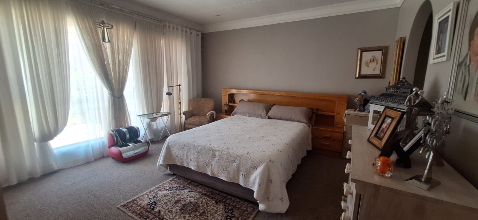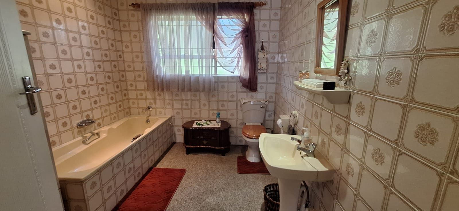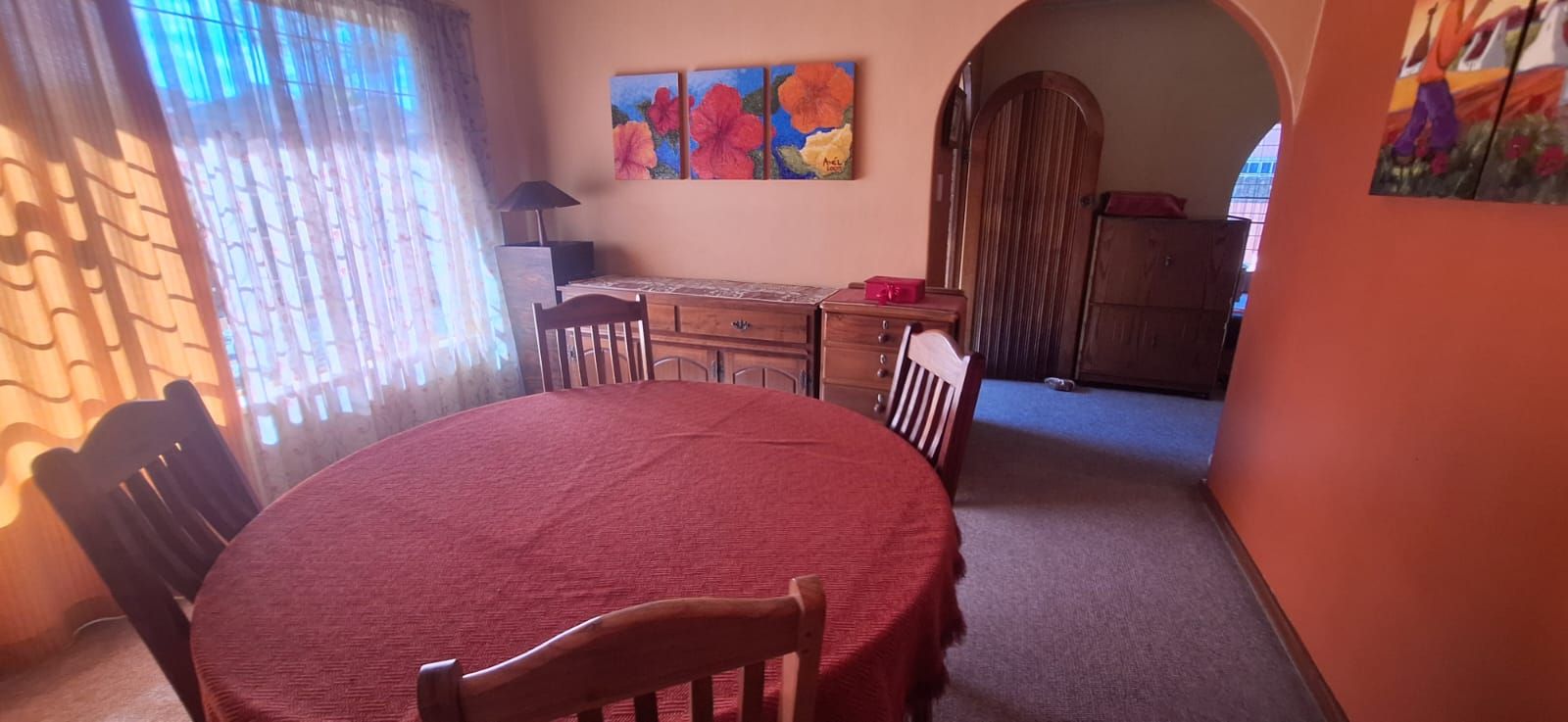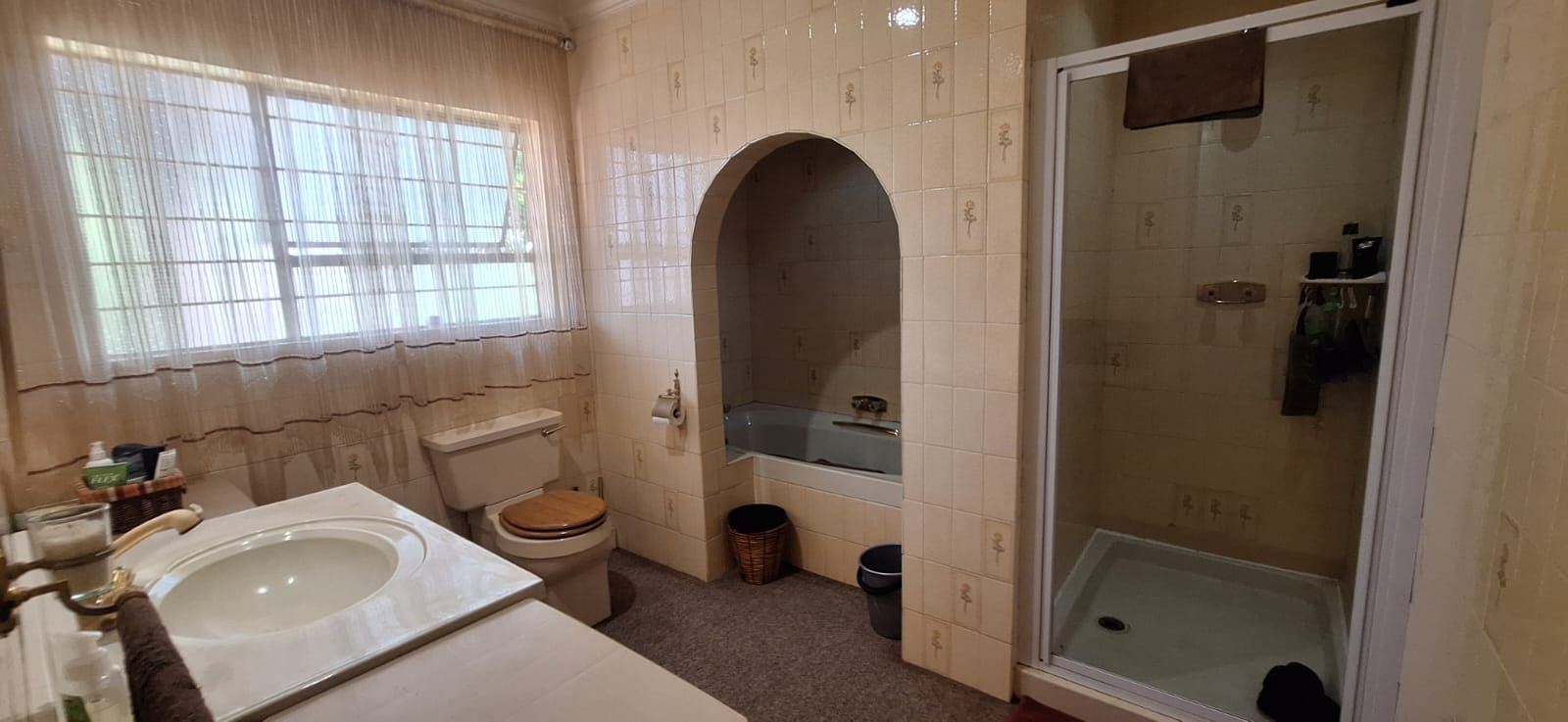 This home offers four spacious bedrooms, all fitted with built-in cupboards. The main bedroom is a true retreat, featuring a stylish en-suite bathroom with a bath, shower, toilet, and basin. The guest bathroom is neatly finished with a bath, basin, and toilet. The home is carpeted throughout, excluding the kitchen, ensuring comfort and warmth all year round.