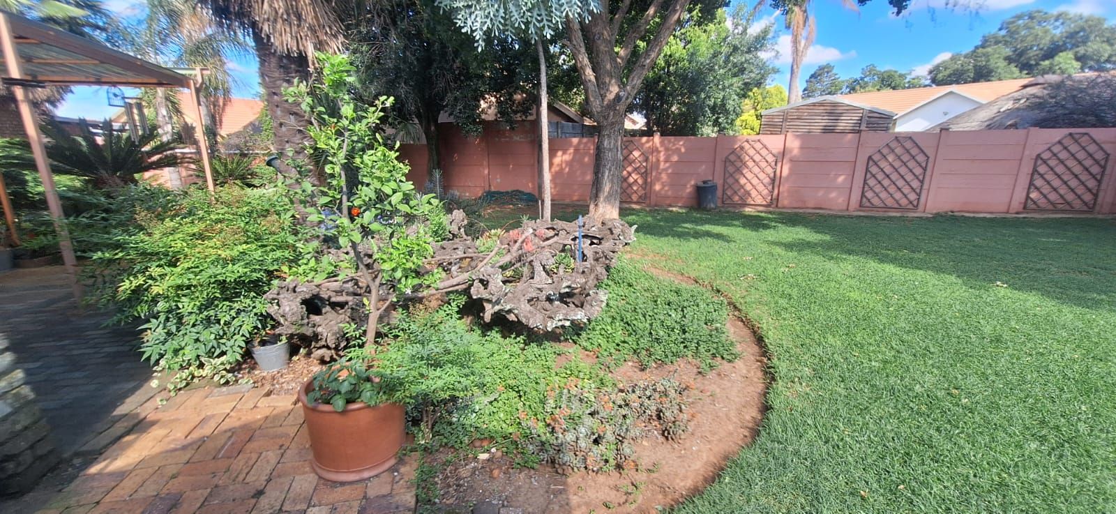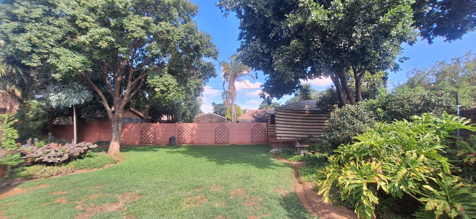 A backyard with an awning for added shade