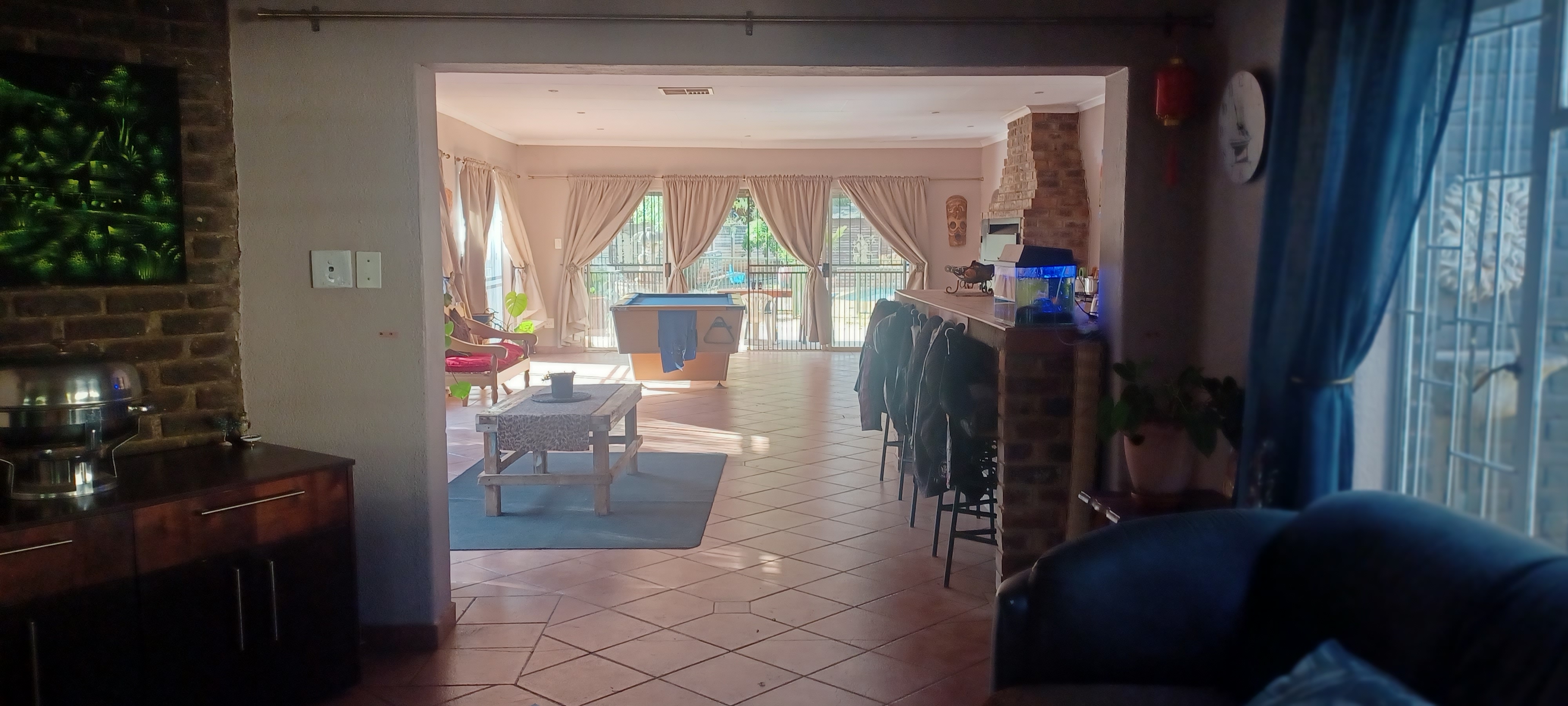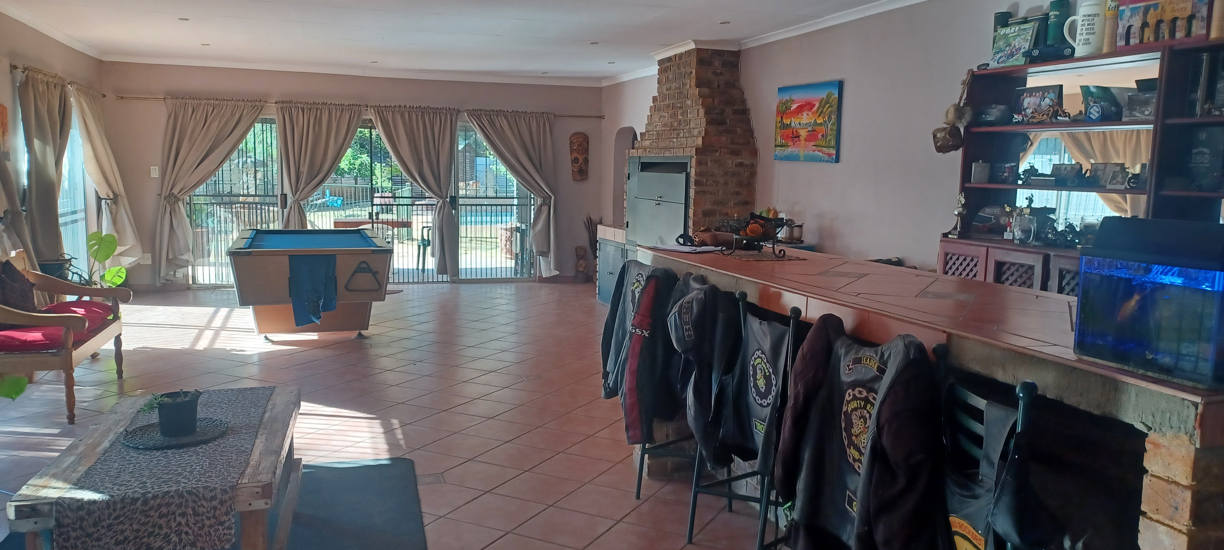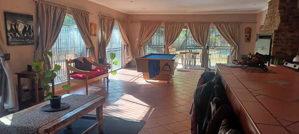 The main entrance leads into a lovely open plan kitchen, dining area/ lounge, which in turn leads to a huge bar area complete with pool table, seating at the bar and a lovely built in braai. Perfect for family and entertaining friends. Off this area there is a door into the garage, another lounge for tv room/study etc and another large family room. Patio doors lead out to a covered patio, which overlooks the pool. There is a guest room on the other side of the pool with a bathroom.