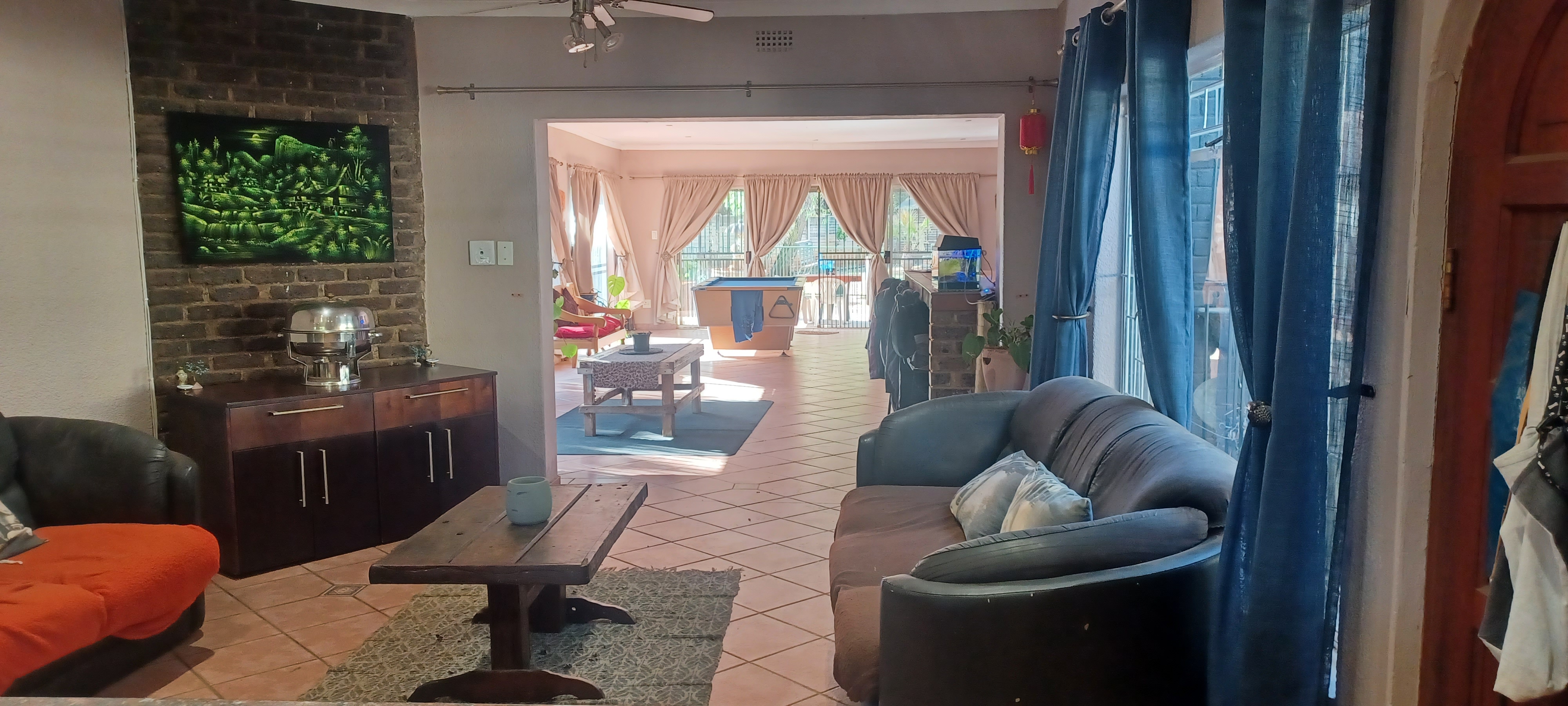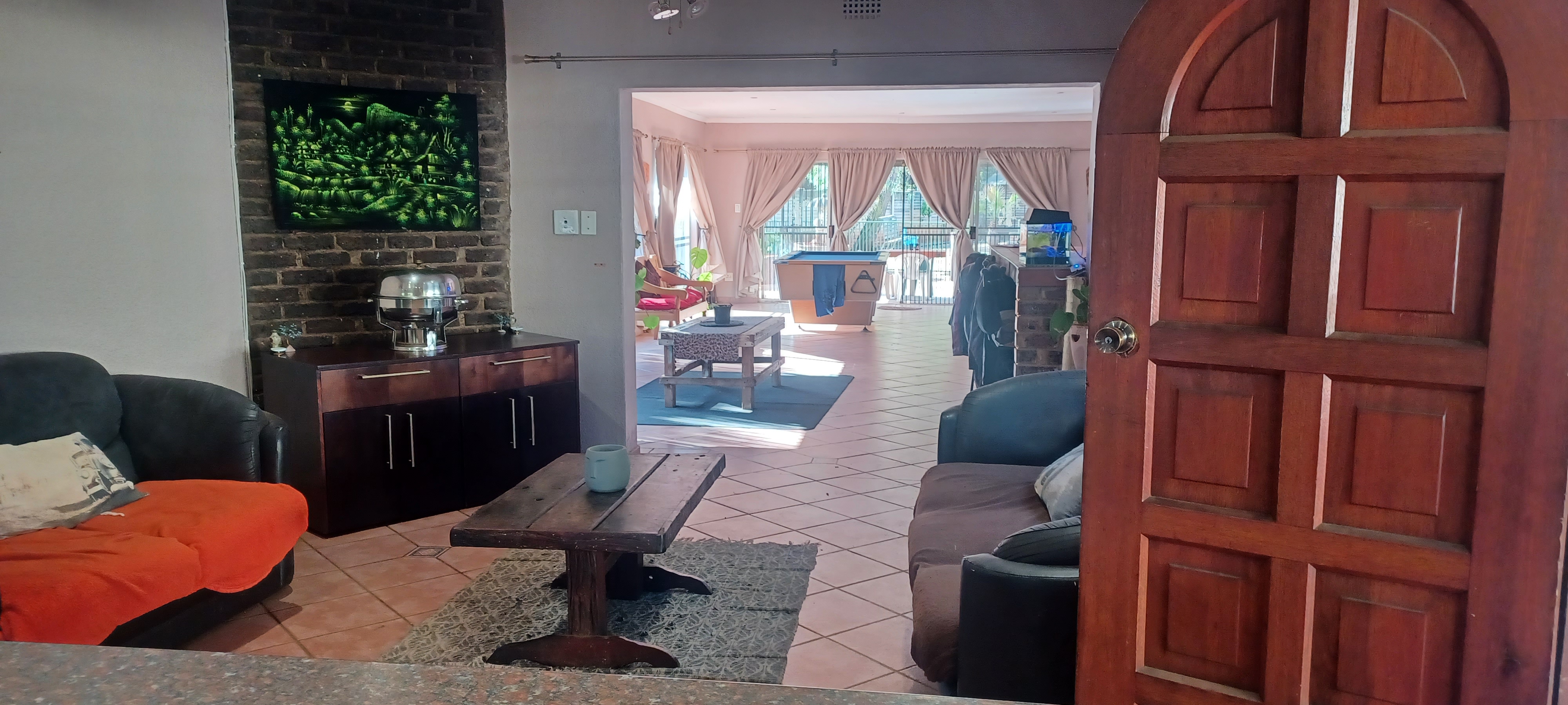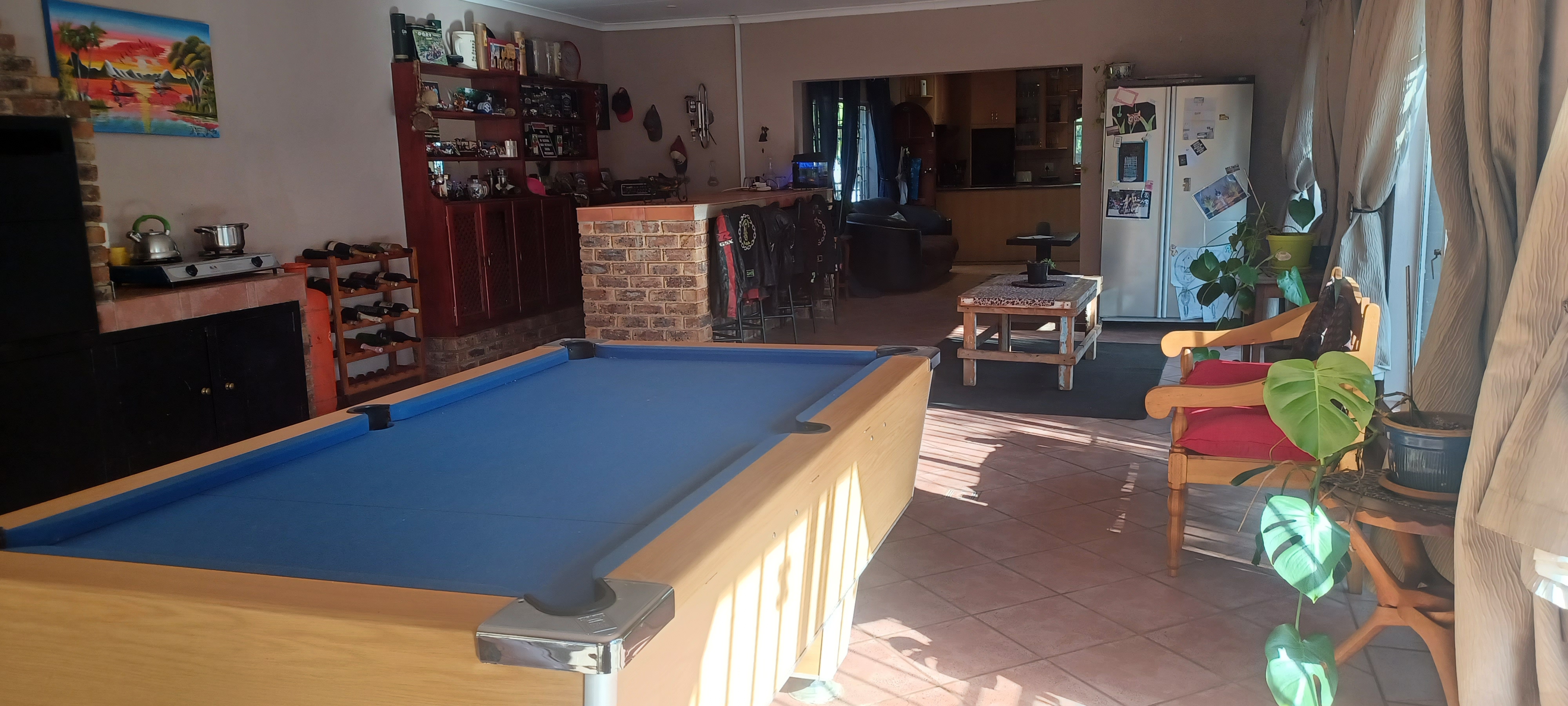 The main entrance leads into a lovely open plan kitchen, dining area/ lounge, which in turn leads to a huge bar area complete with pool table, seating at the bar and a lovely built in braai. Perfect for family and entertaining friends. Off this area there is a door into the garage, another lounge for tv room/study etc and another large family room. Patio doors lead out to a covered patio, which overlooks the pool. There is a guest room on the other side of the pool with a bathroom.