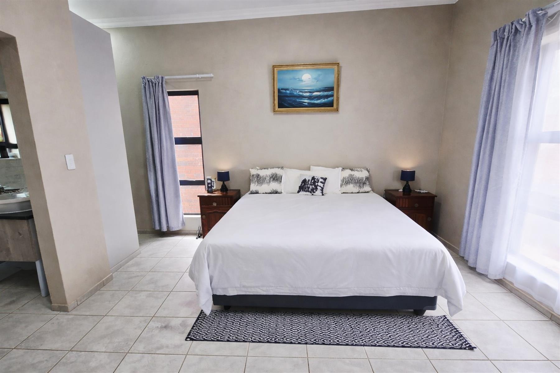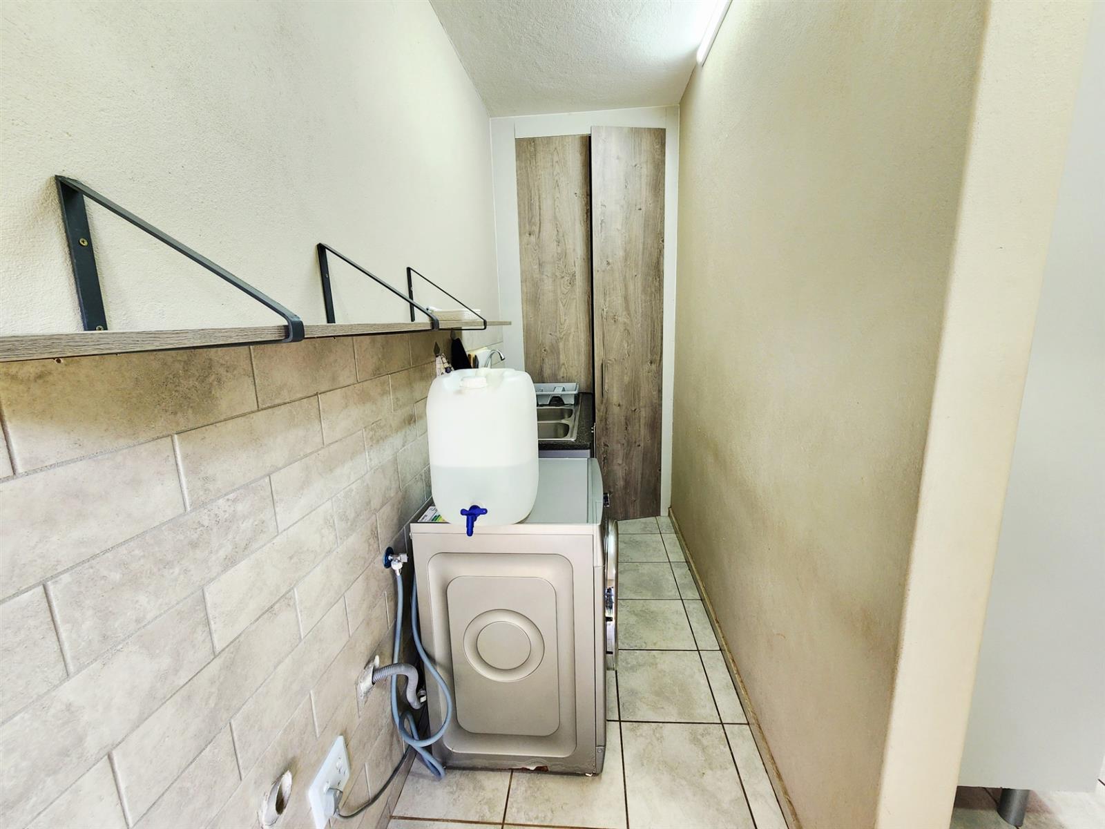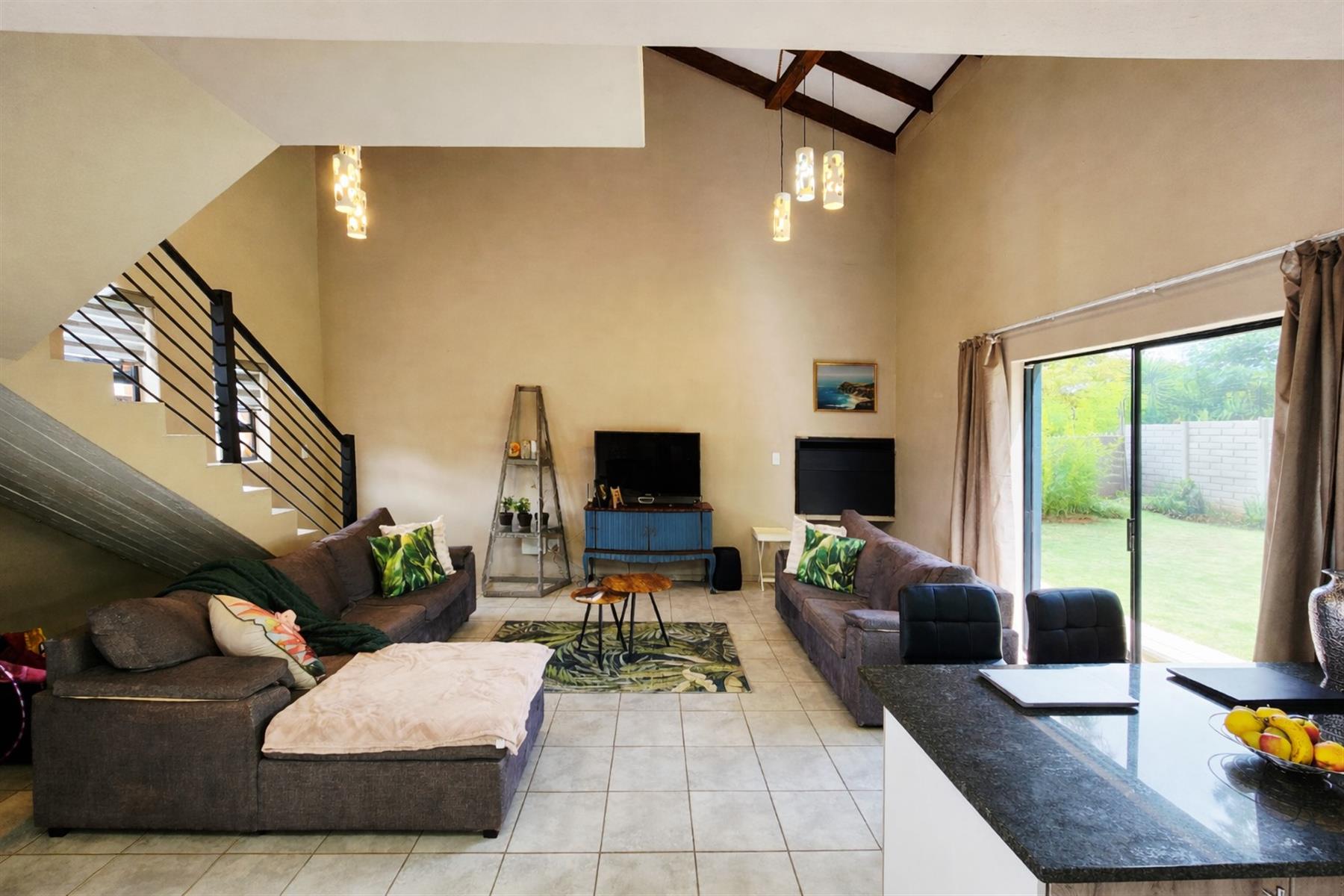 Downstairs, you are welcomed by a modern open-plan kitchen with a pantry, a small scullery cabinet, and space for a dishwasher or washing machine. The kitchen flows seamlessly into the living area with an indoor braai, ideal for relaxed entertaining. The home is equipped with a gas stove and a semi gas geyser with WiFi connectivity, adding modern convenience. Take note Wifi has additional cost and gas is also for own cost.