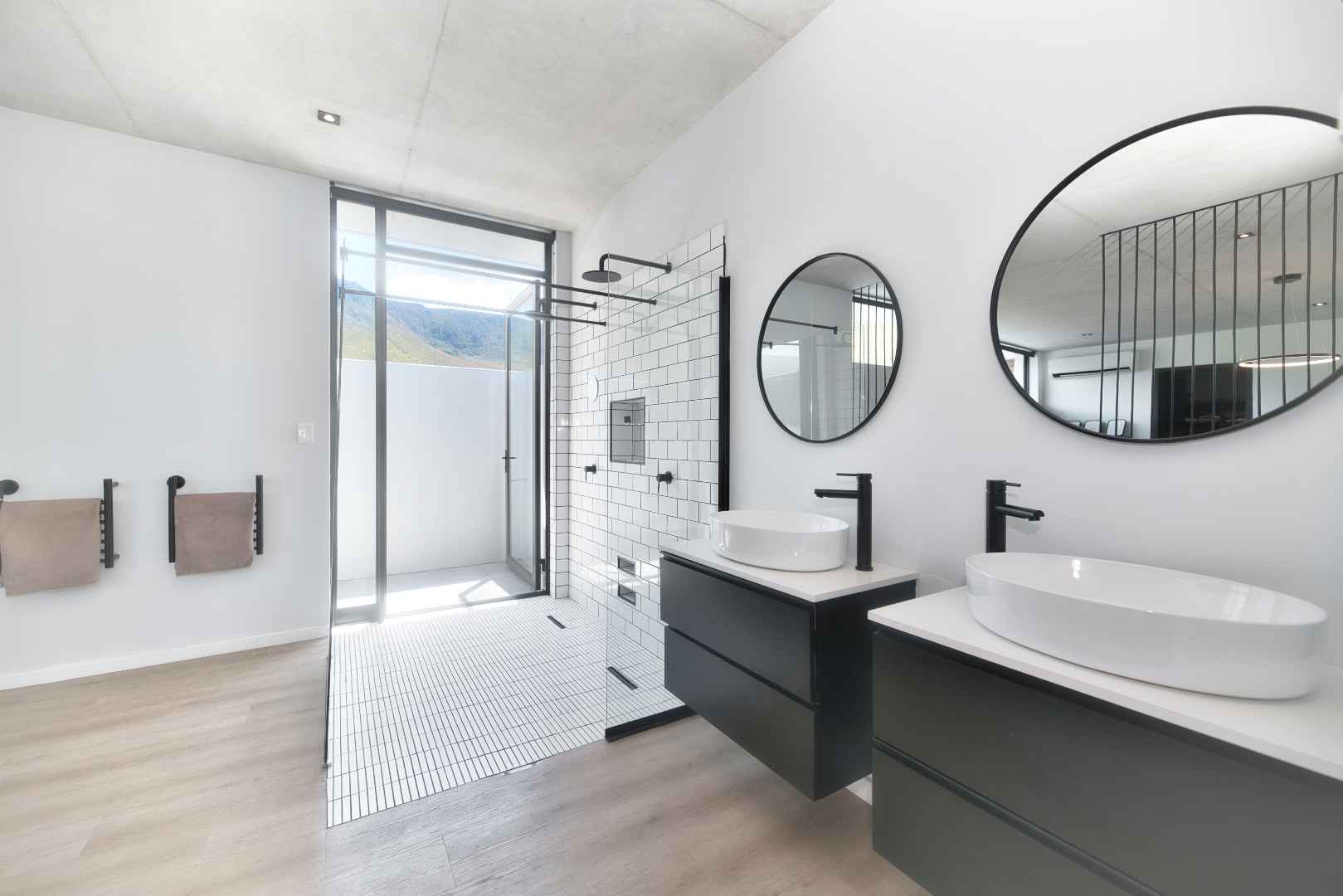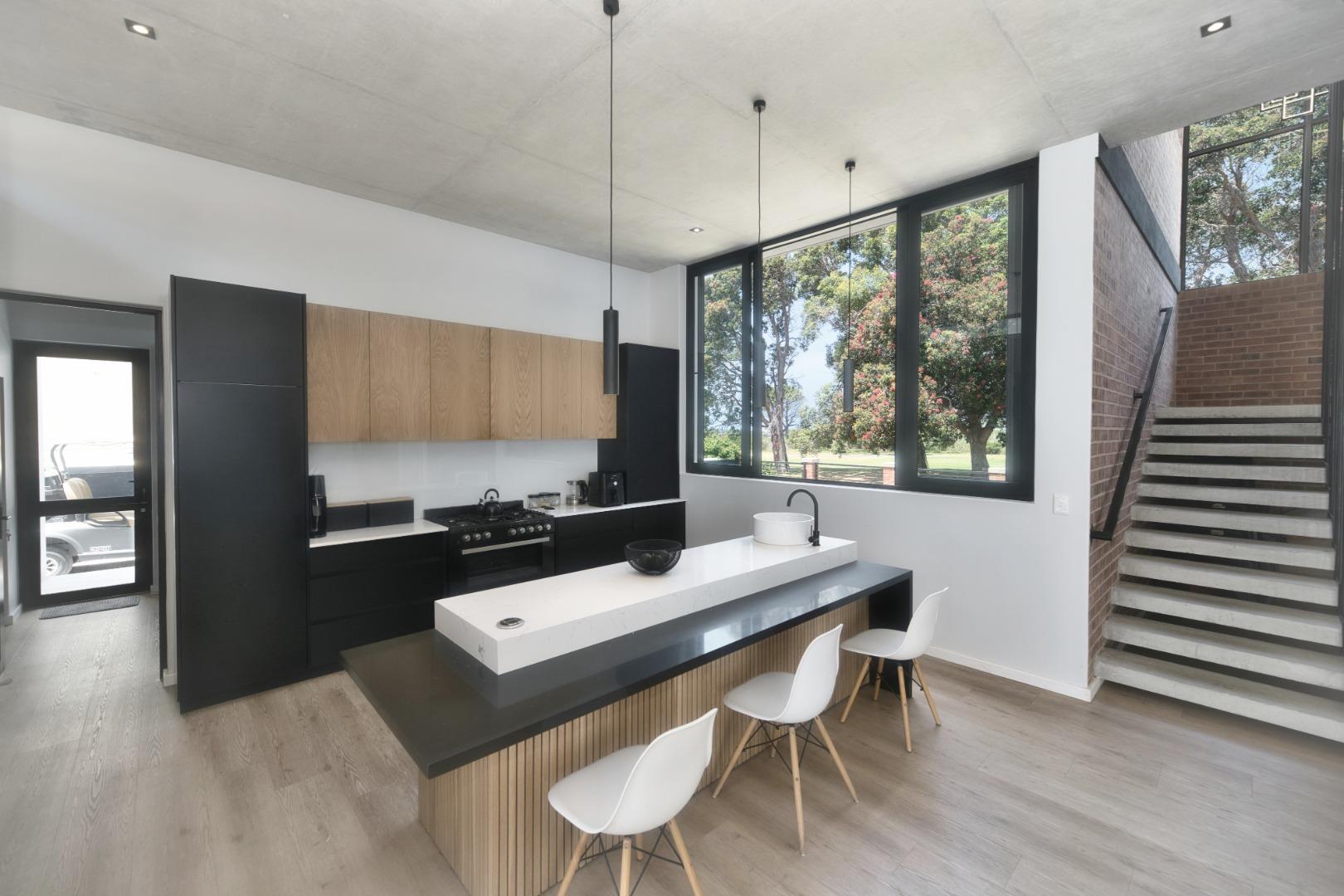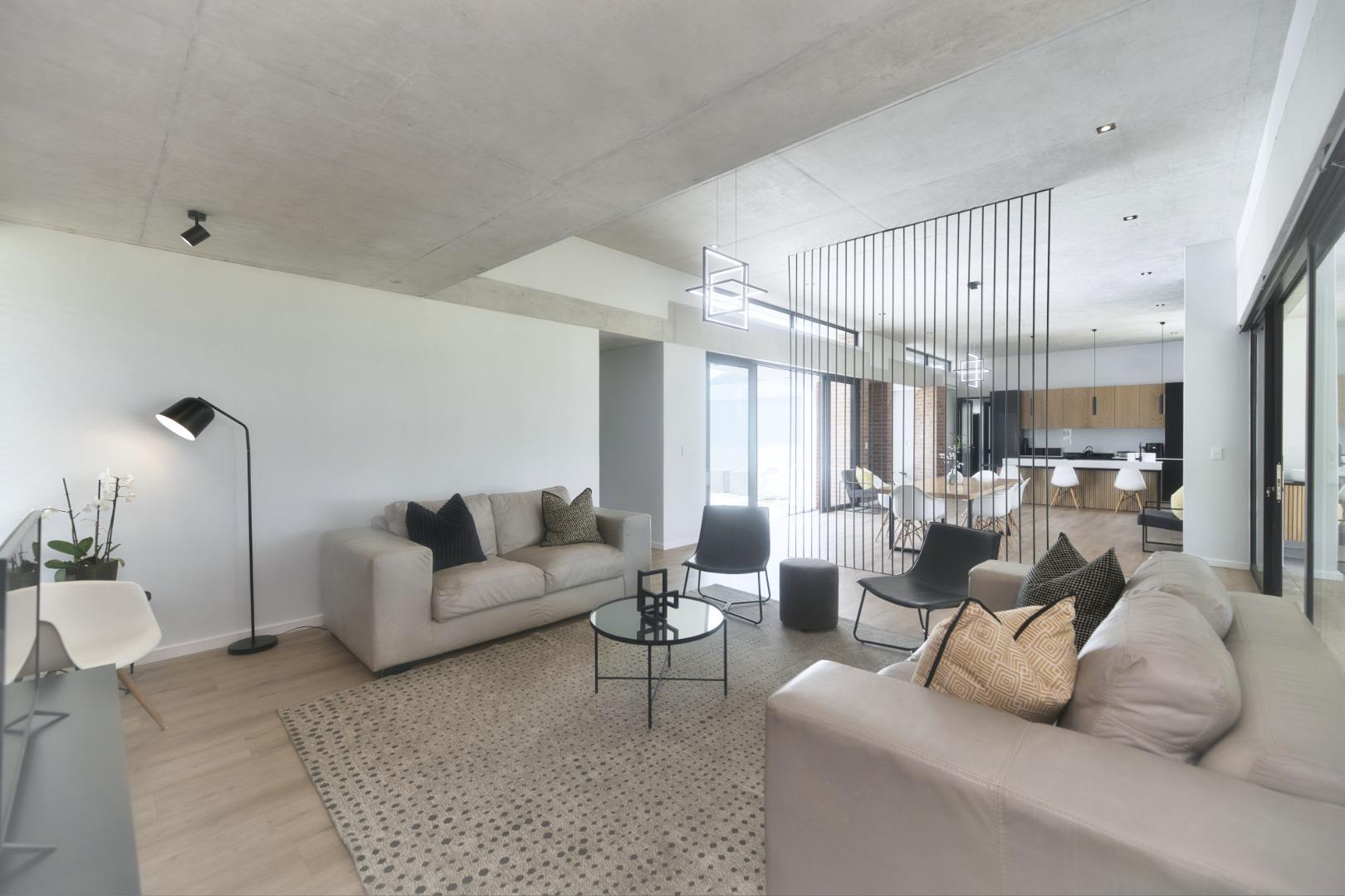 Set in the peaceful and very popular suburb of Hermanus Heights but biting on the lip of the golf course boundary, this home presents an exquisite fusion of industrial-chic design and coastal elegance. The striking facade, complemented by a meticulously paved driveway and garden, offers a captivating first impression.