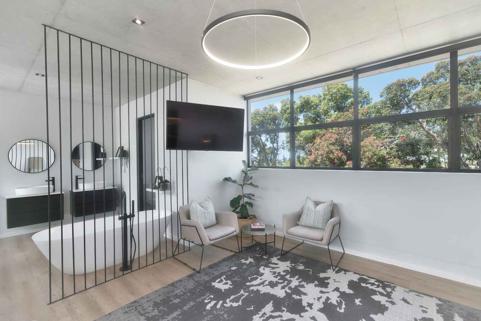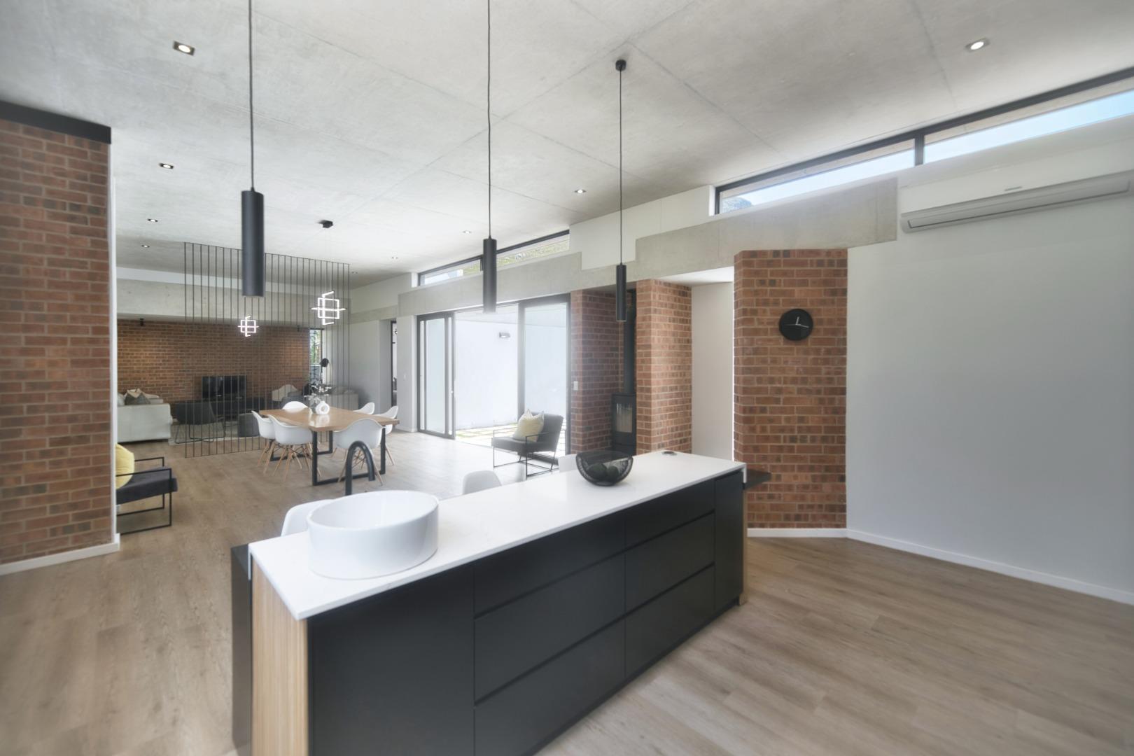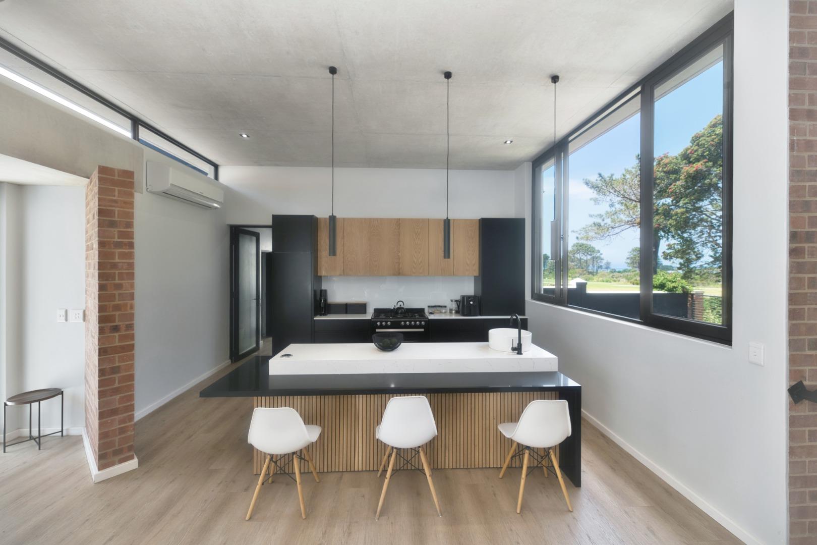 Walking in it feels like an open-plan sanctuary where exposed concrete ceilings and artfully placed brick accent walls create a distinctive aesthetic. The seamless flow between the lounge, dining area, and a contemporary kitchen, complete with a pantry and a stylish island, is enhanced by expansive sliding glass doors and windows. These special doors invite abundant natural light and effortlessly merge indoor luxury with the serene outdoor environment, perfect for entertaining or quiet contemplation.