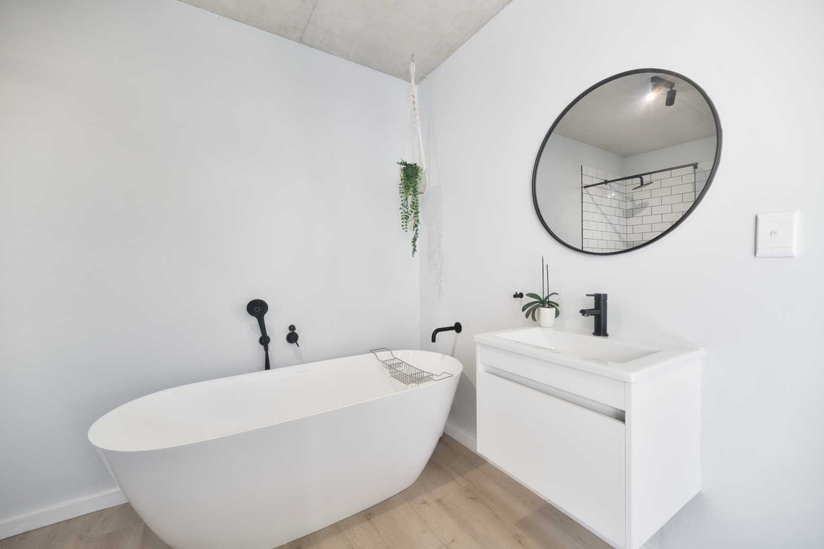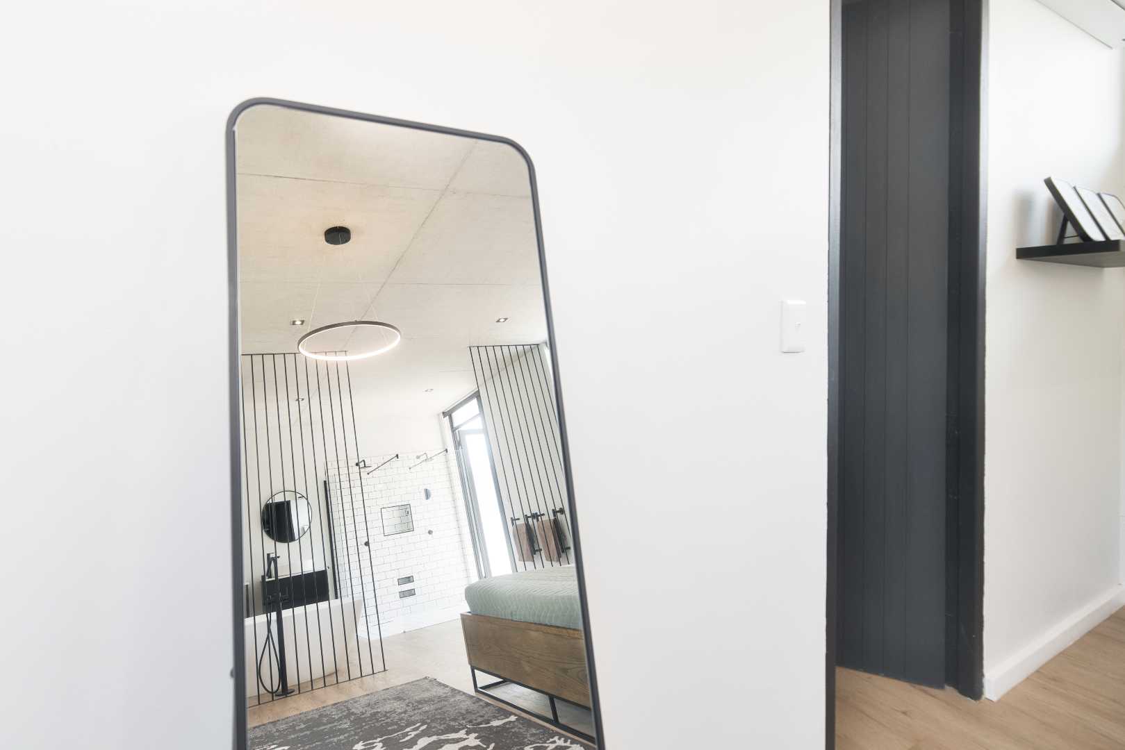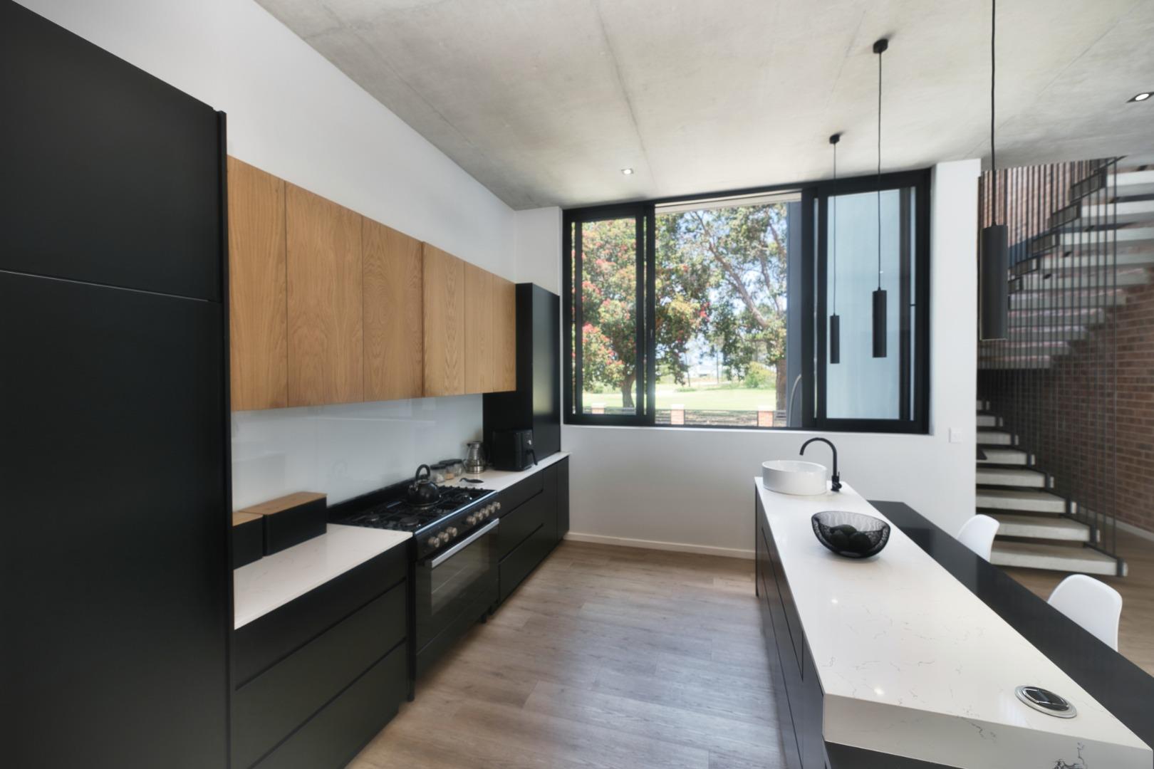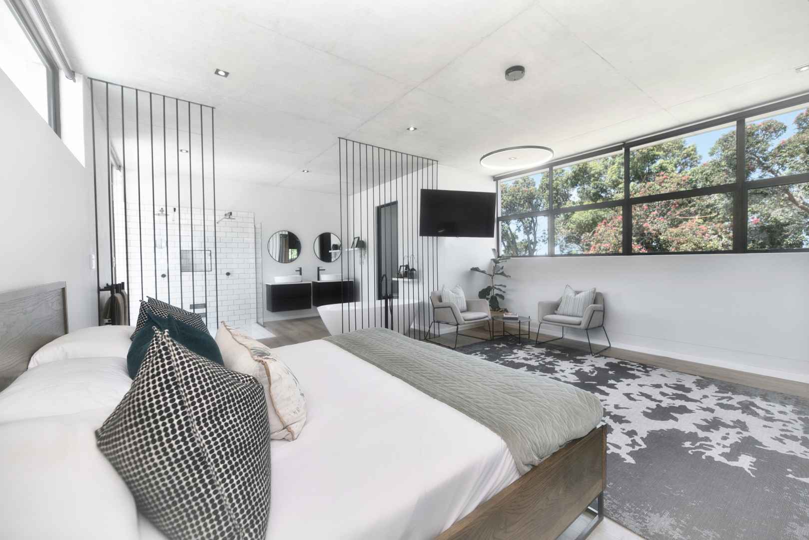 Walking in it feels like an open-plan sanctuary where exposed concrete ceilings and artfully placed brick accent walls create a distinctive aesthetic. The seamless flow between the lounge, dining area, and a contemporary kitchen, complete with a pantry and a stylish island, is enhanced by expansive sliding glass doors and windows. These special doors invite abundant natural light and effortlessly merge indoor luxury with the serene outdoor environment, perfect for entertaining or quiet contemplation.