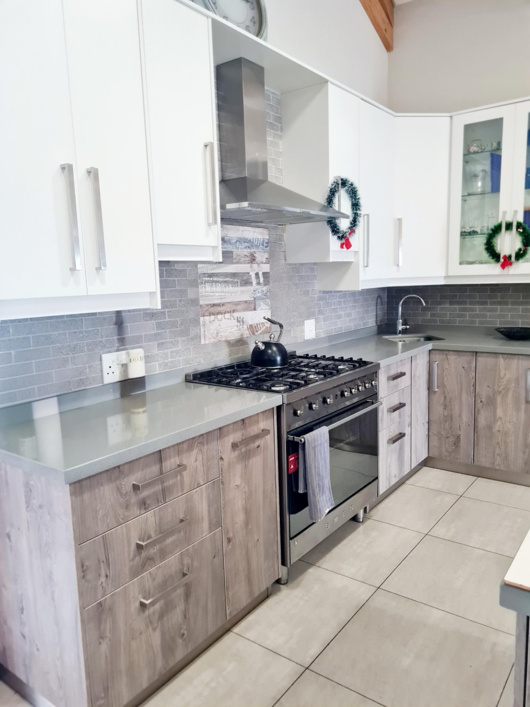 Modern kitchen with island, gas stove, oven & separate scullery