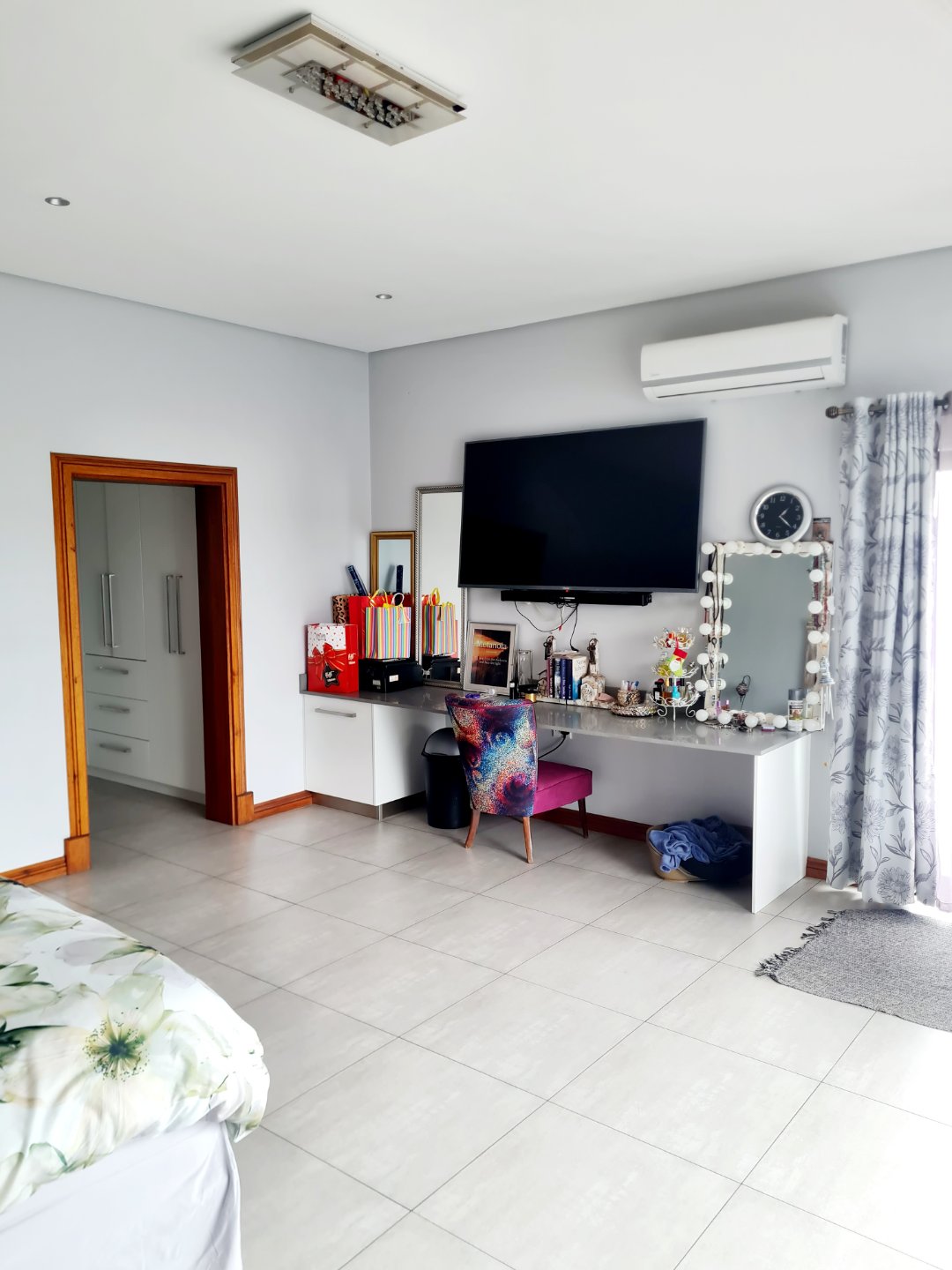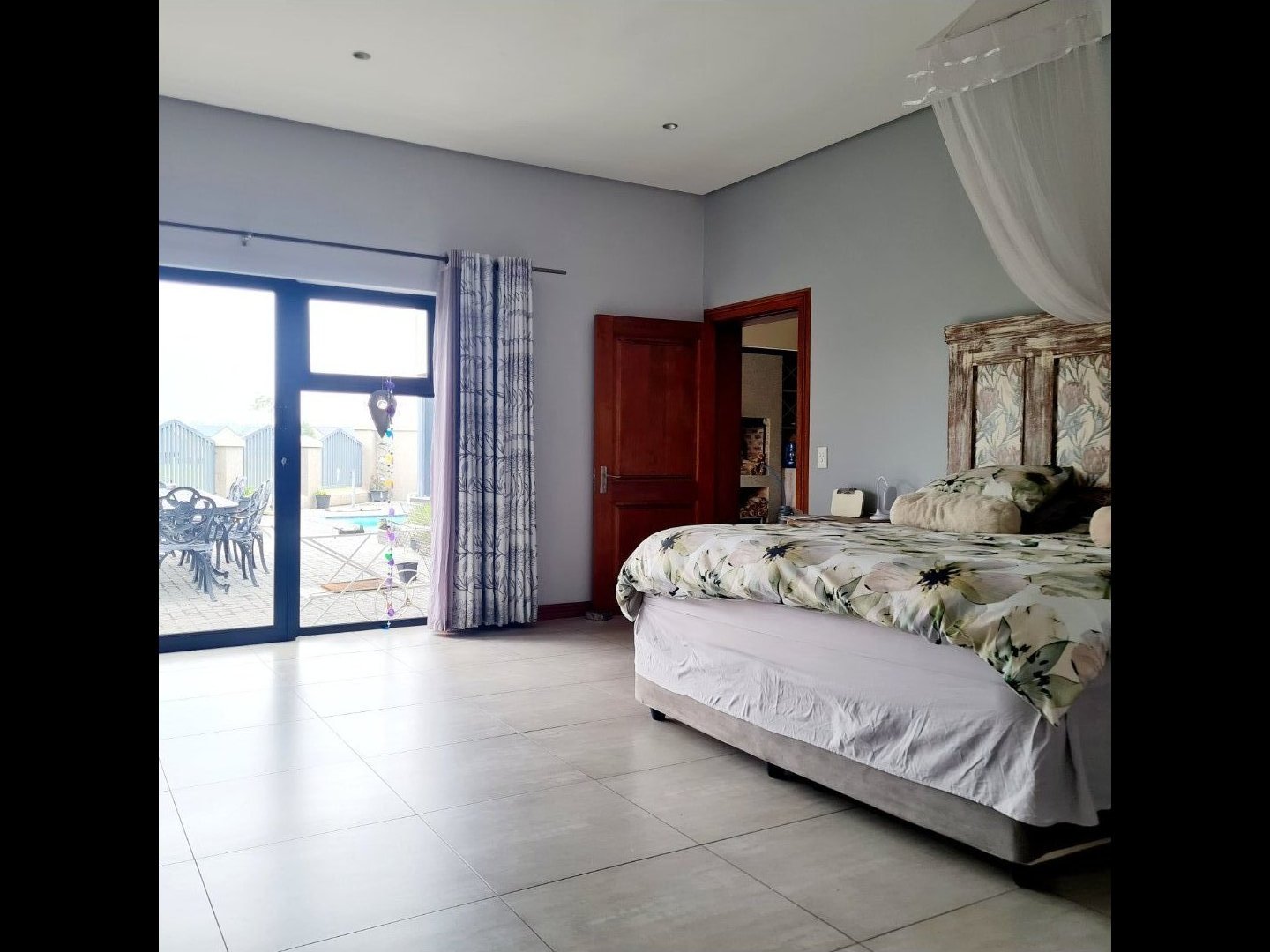 Main bedroom with walk-in dressing area & stacking doors opening to the pool