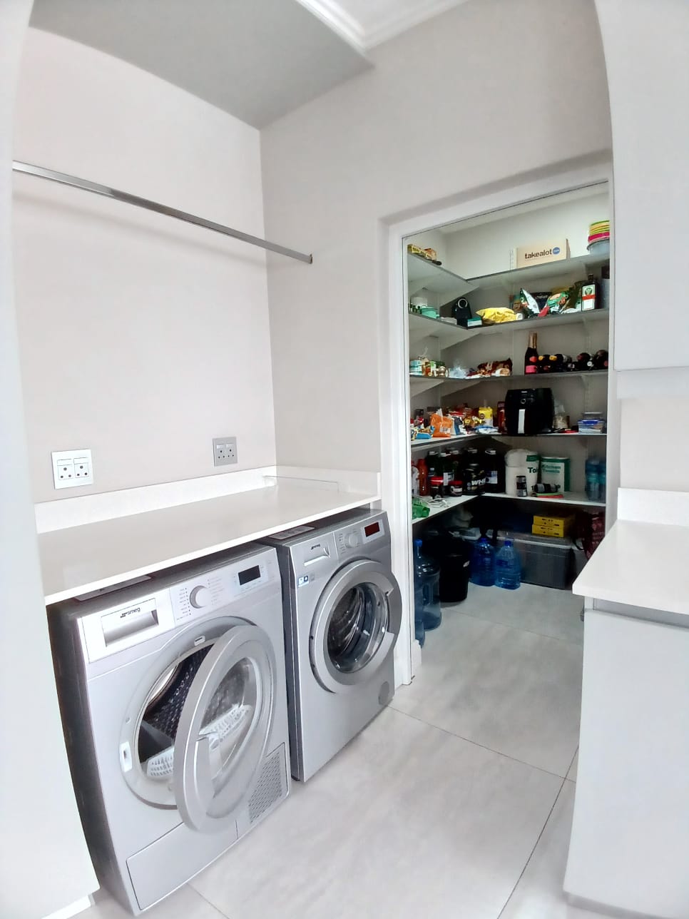 Step into a beautifully designed open living area, featuring a modern kitchen with beautiful cabinetry, granite countertops, gas stove, and a large counter to work on. The kitchen also includes a scullery, pantry, and laundry room for added convenience.