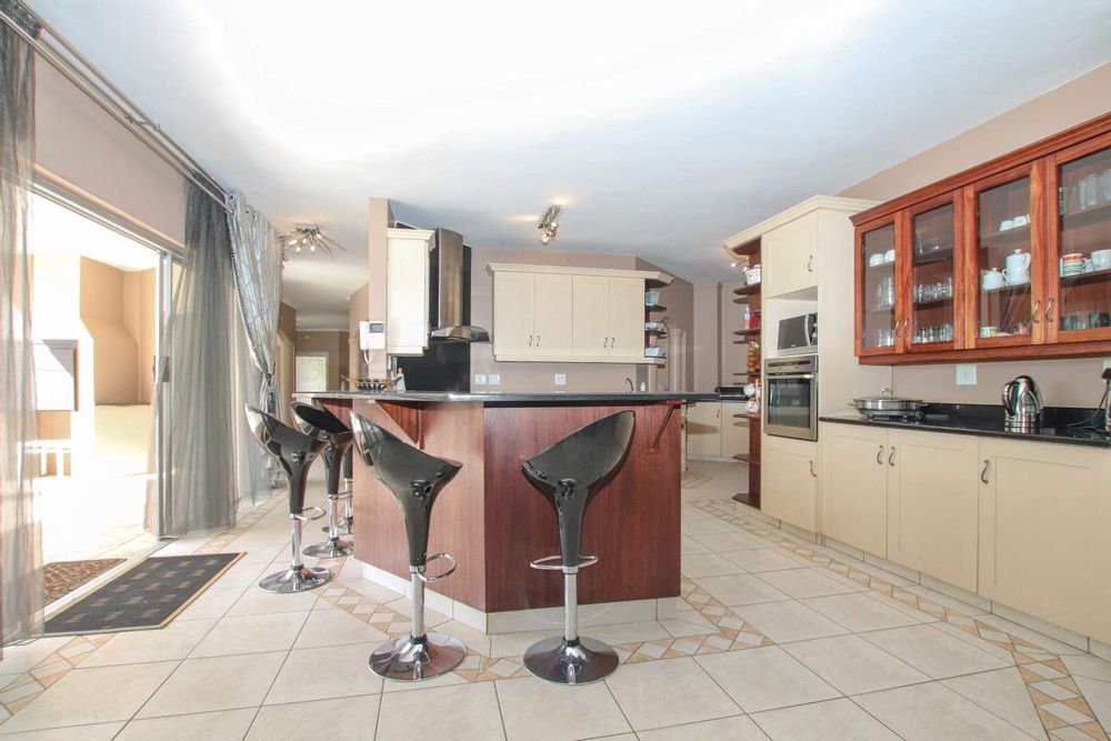 The living spaces in the house have a relaxed flow, with two lounges, a dining room, and a kitchen that all open onto a large covered patio. This patio includes a built-in braai and overlooks the sparkling pool, lush garden, and poolside bar area.