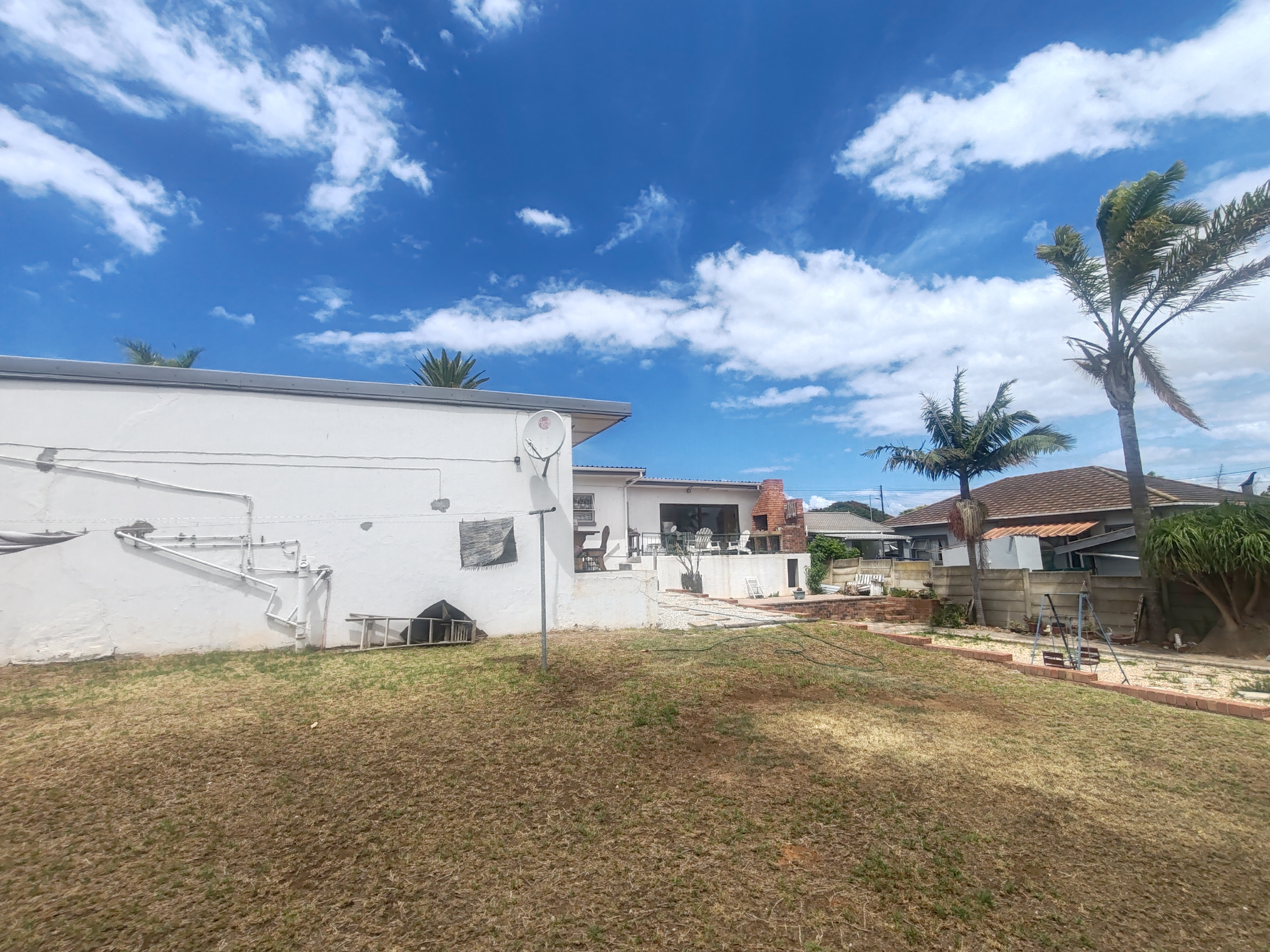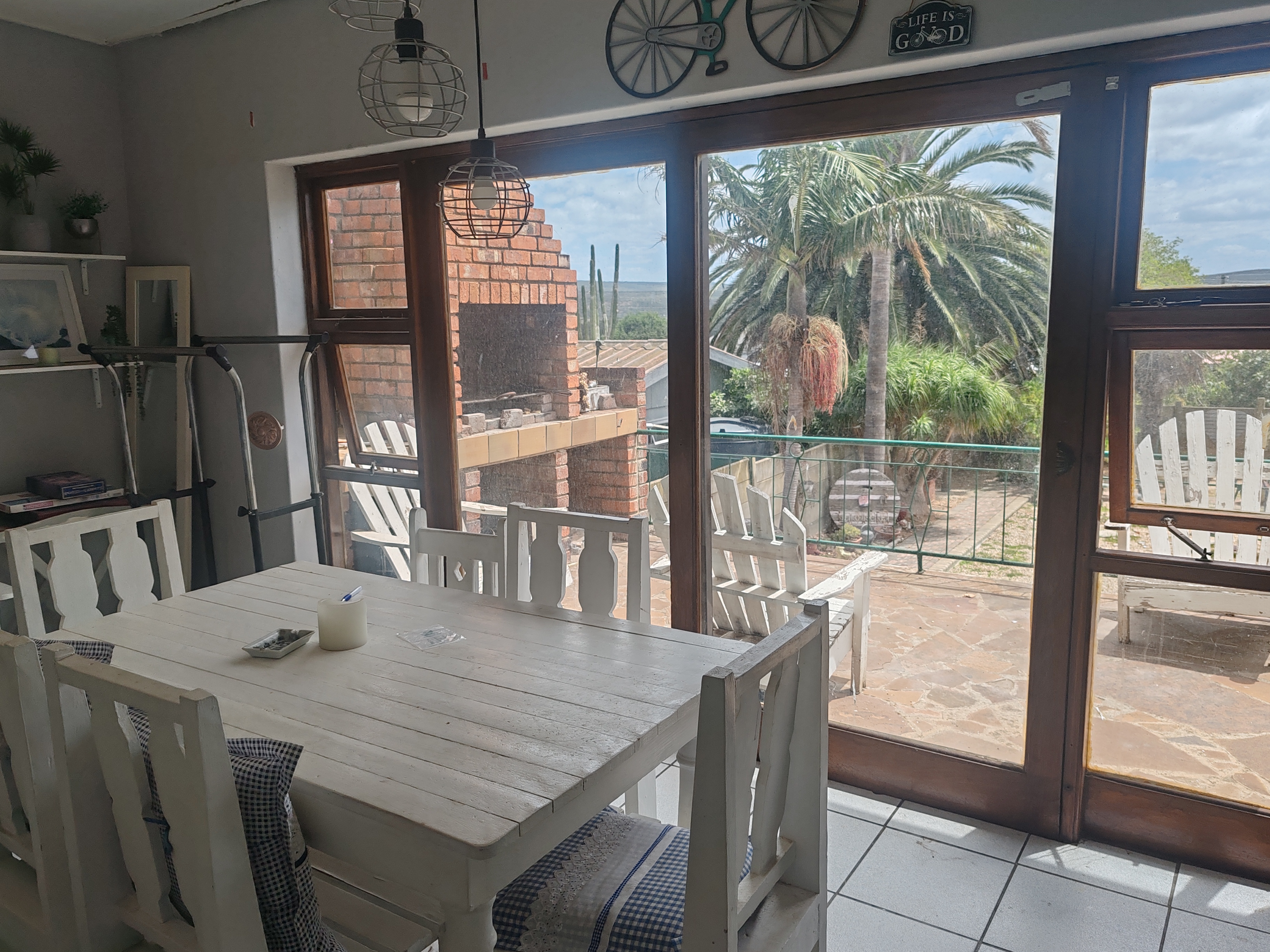 The property welcomes you through an entrance hall into a spacious open-plan living area and modern kitchen, complete with a separate scullery and laundry. The kitchen flows seamlessly into the dining area, which opens via sliding doors to an outdoor braai area—perfect for entertaining.