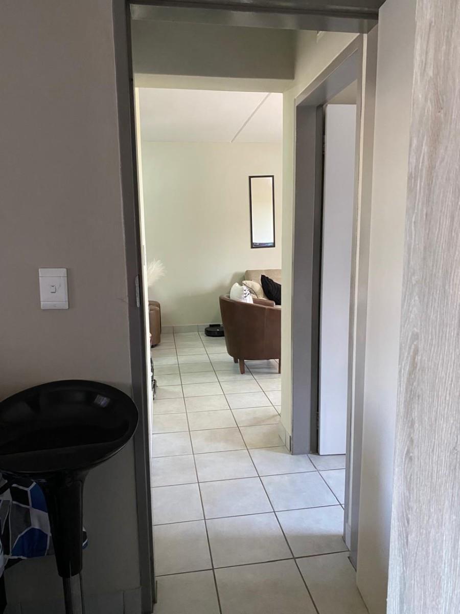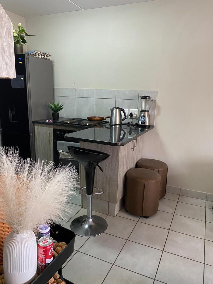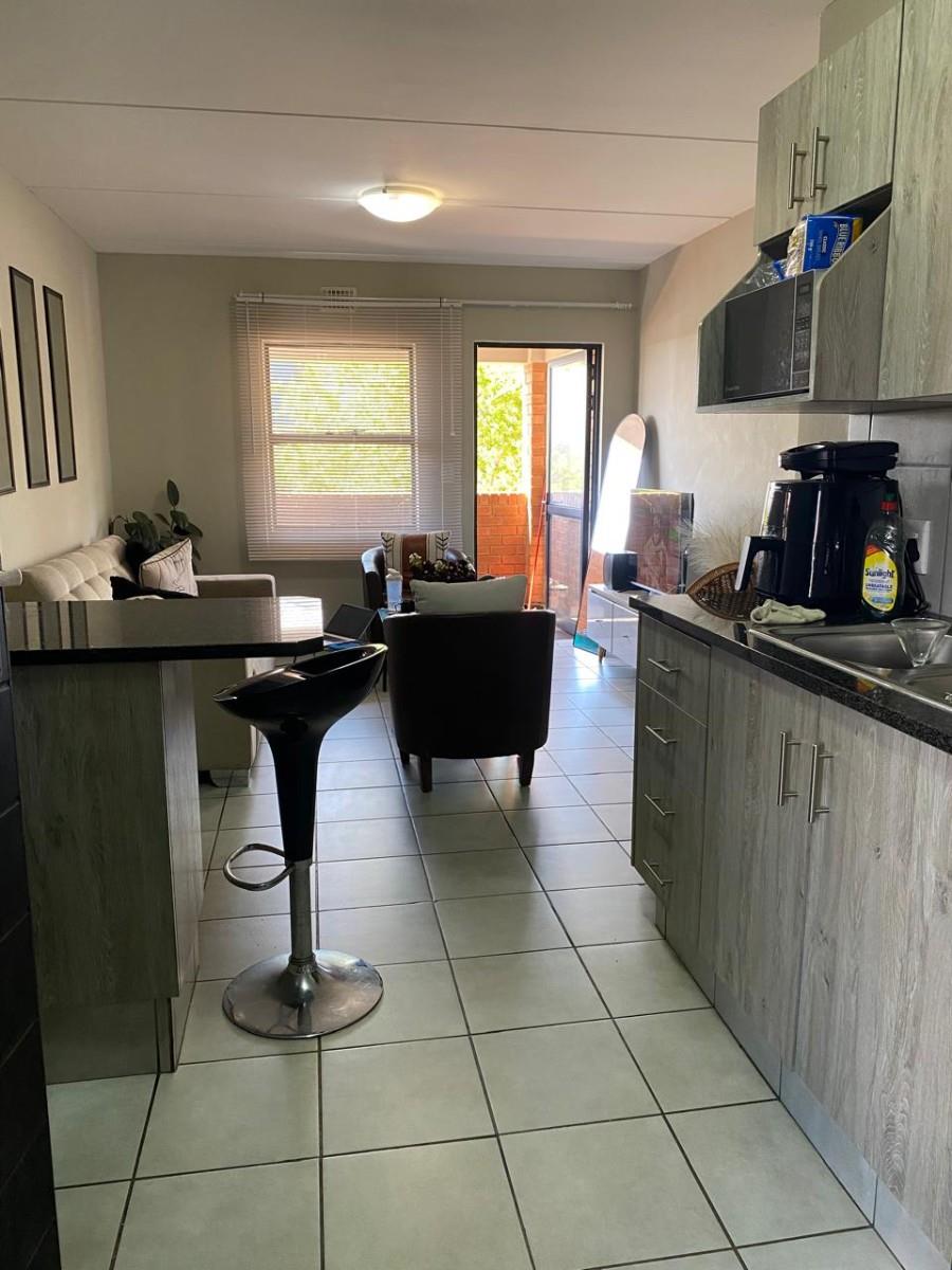 The open-plan layout, featuring tiled floors throughout, creates a spacious and inviting atmosphere. The kitchen features granite tops and enough cupboard space. Step out onto your private balcony to enjoy lovely views, making it an ideal spot for morning coffee or evening relaxation. The two bedrooms feature built-in cupboards, and the full bathroom features a washbasin, toilet, bath and shower.