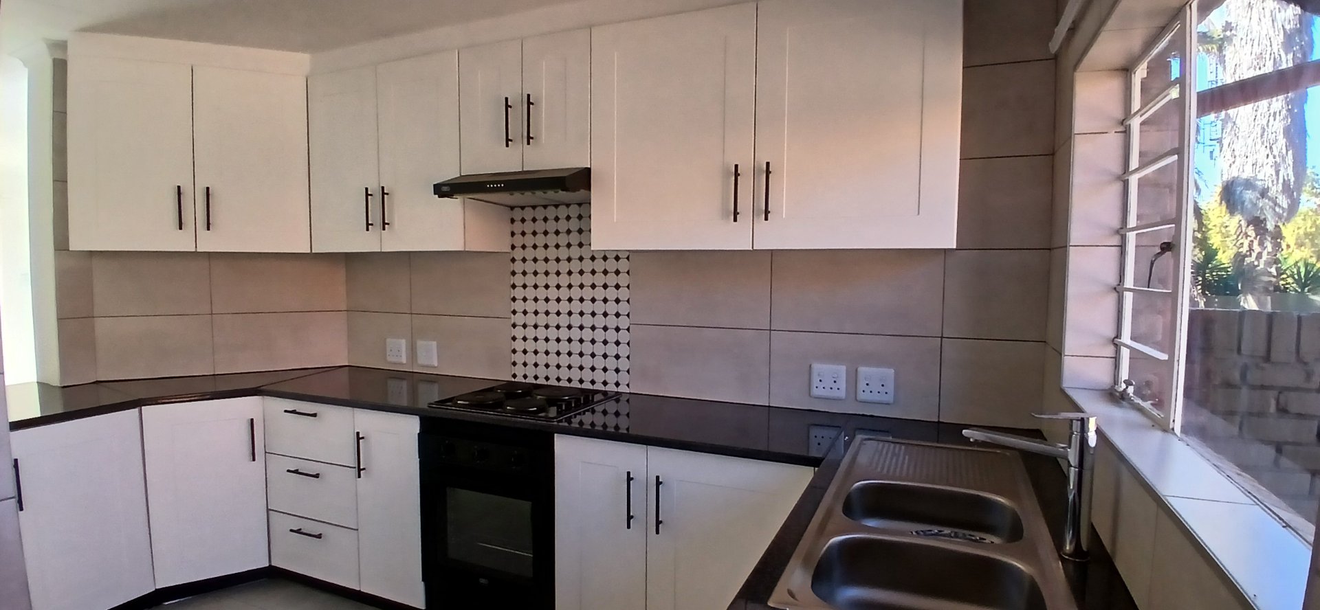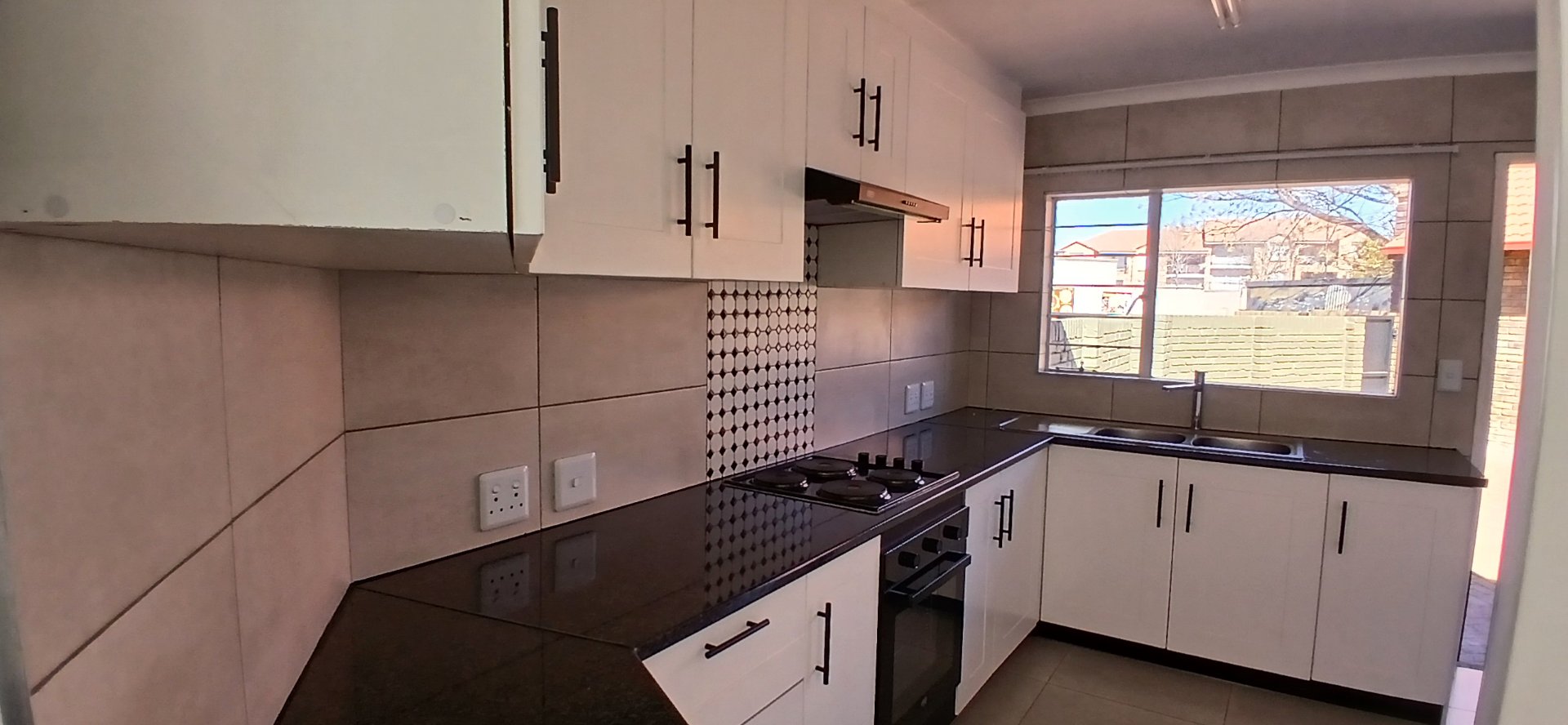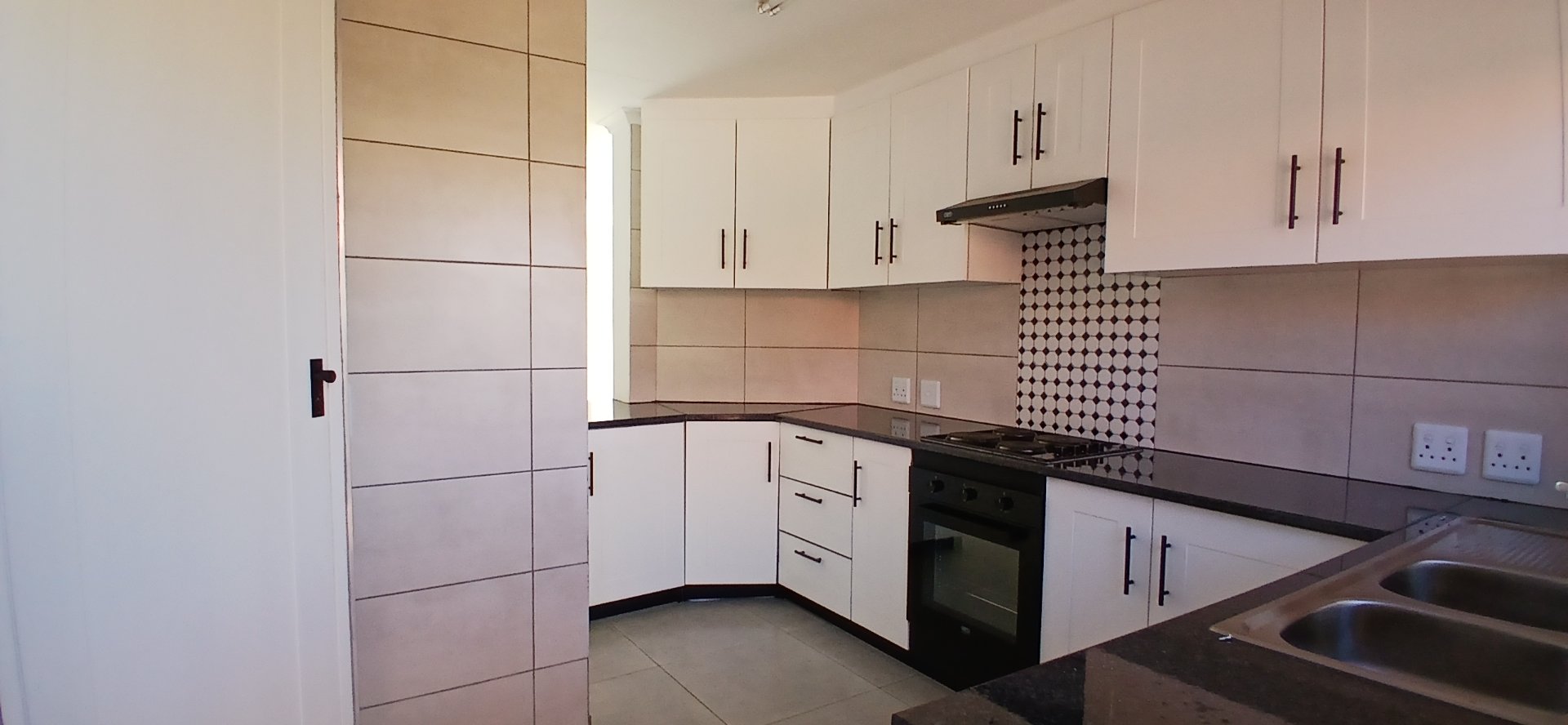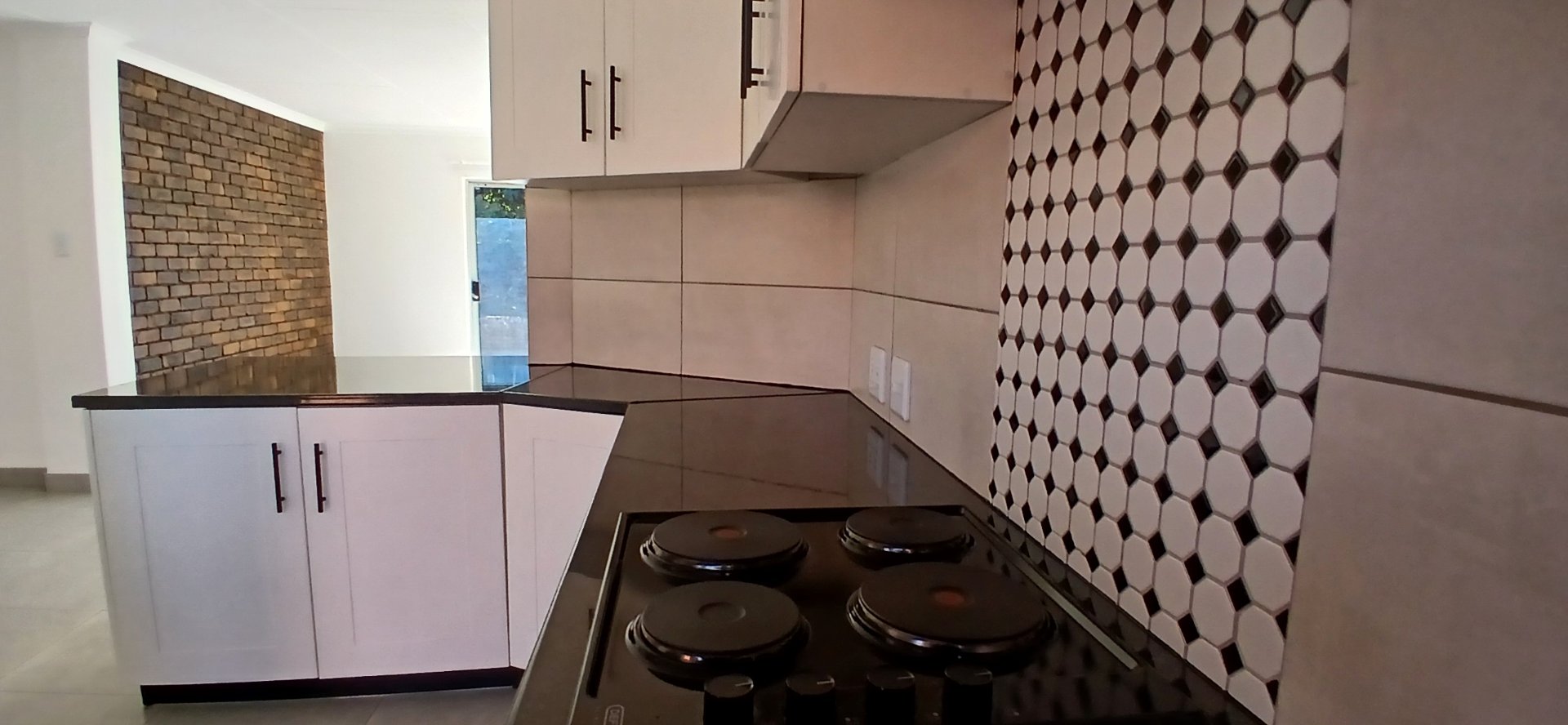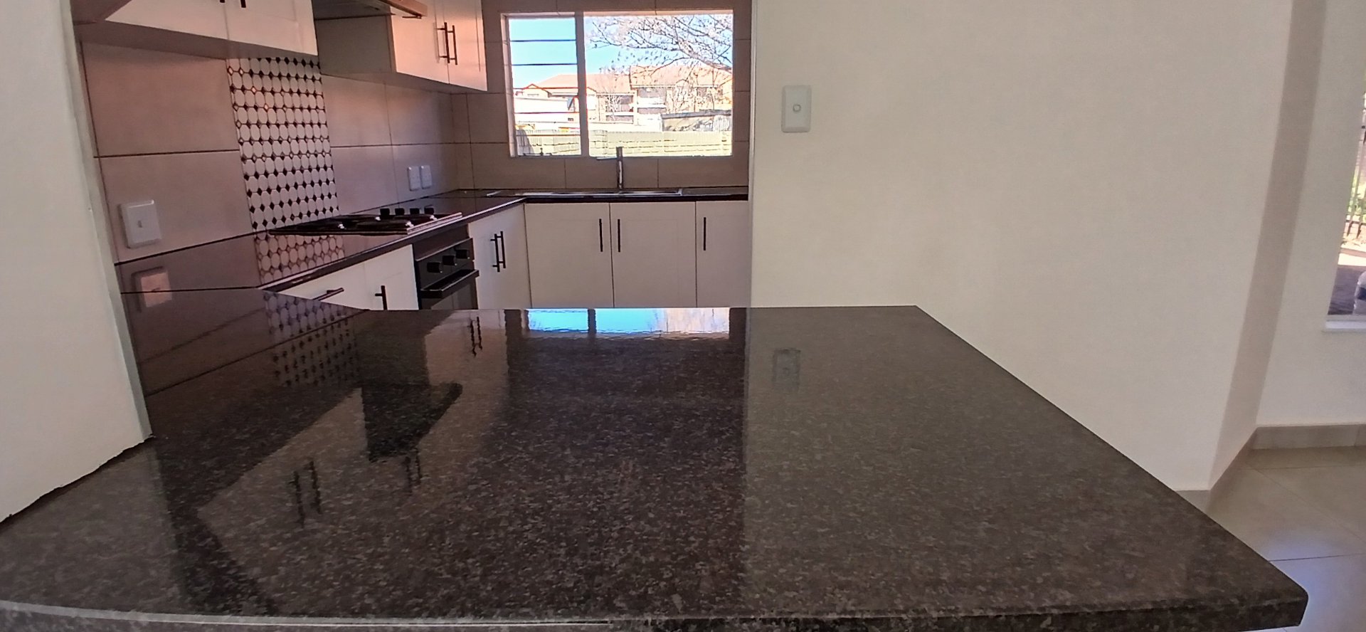 The kitchen boasts granite countertops, a hob, an under-counter oven, and a washing machine.