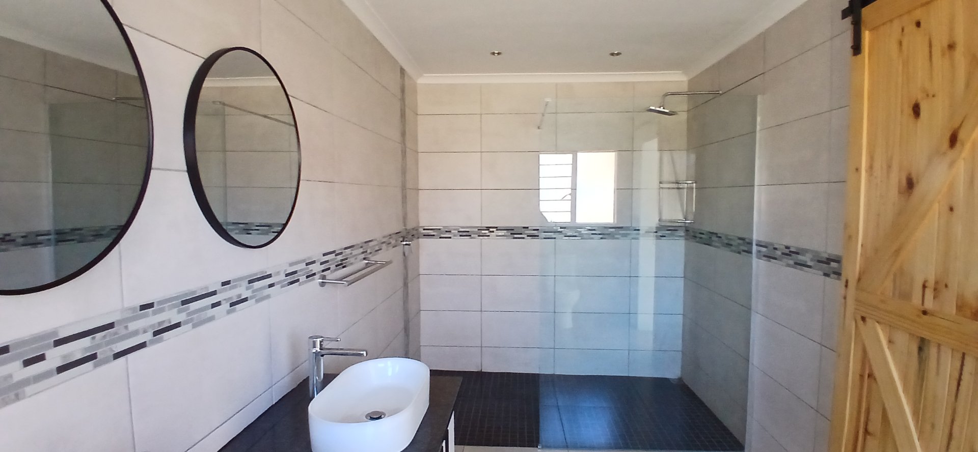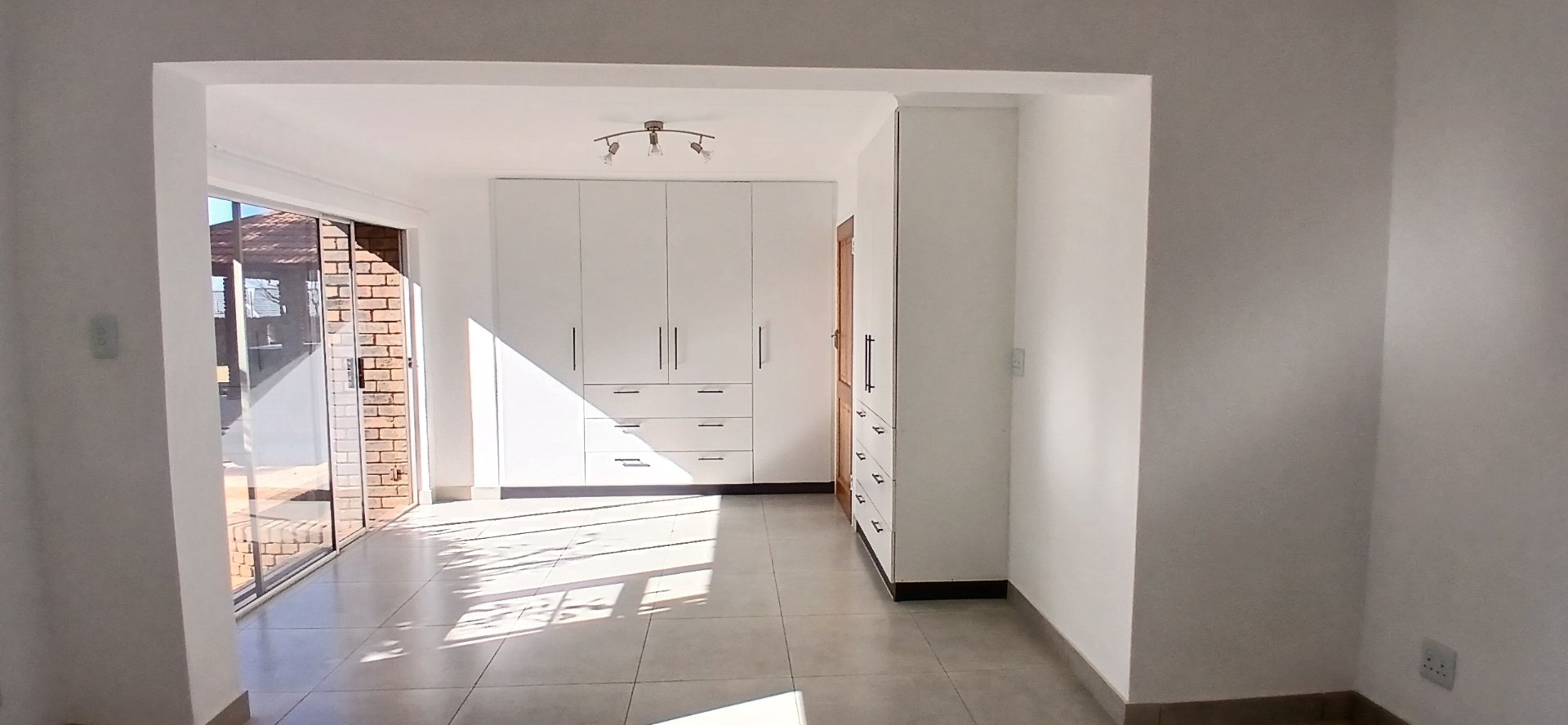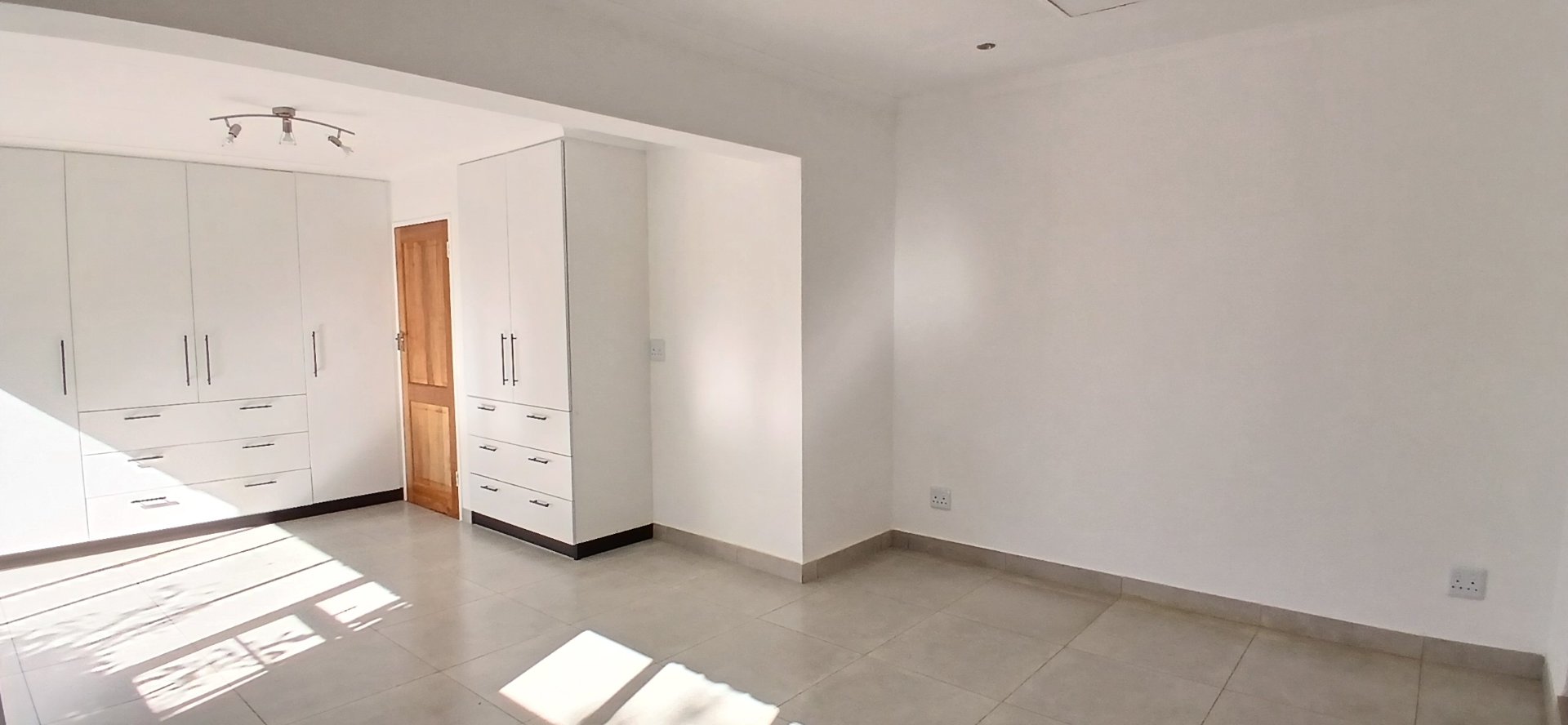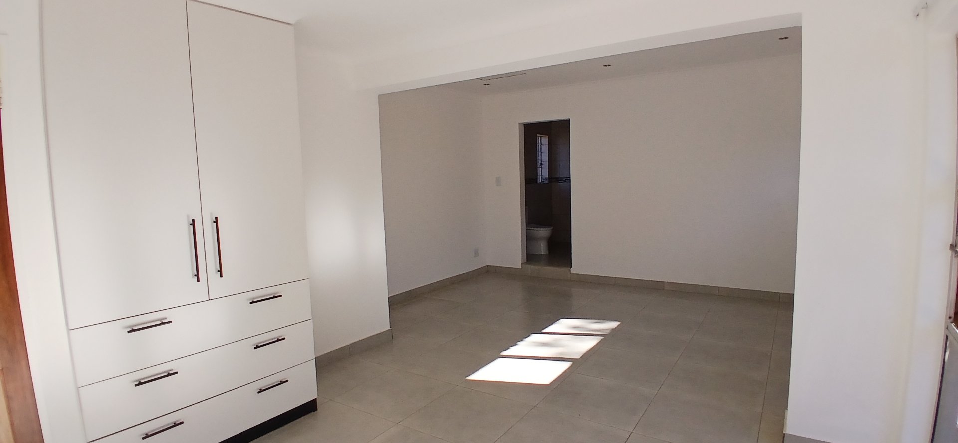 A master bedroom with ample cupboard space and a luxurious en suite bathroom featuring a walk-in shower, double vanity basin, and toilet.
