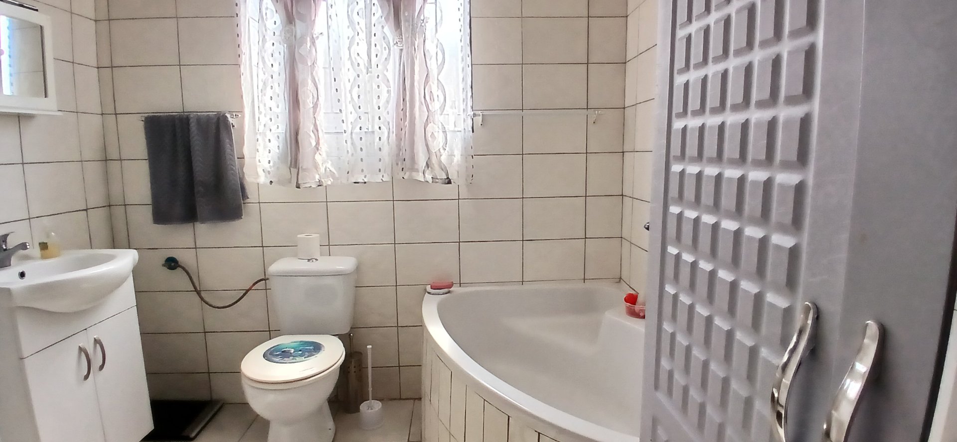 There is also two bedrooms, both with ample cupboard space, sharing a modern full bathroom with corner bath, shower, toilet, and vanity basin.