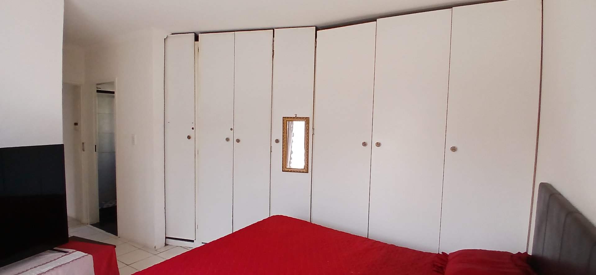 A spacious master bedroom featuring a full an en - suite bathroom with shower, vanity basin, and toilet, plus ample built-in cupboards and a walk-in closet.