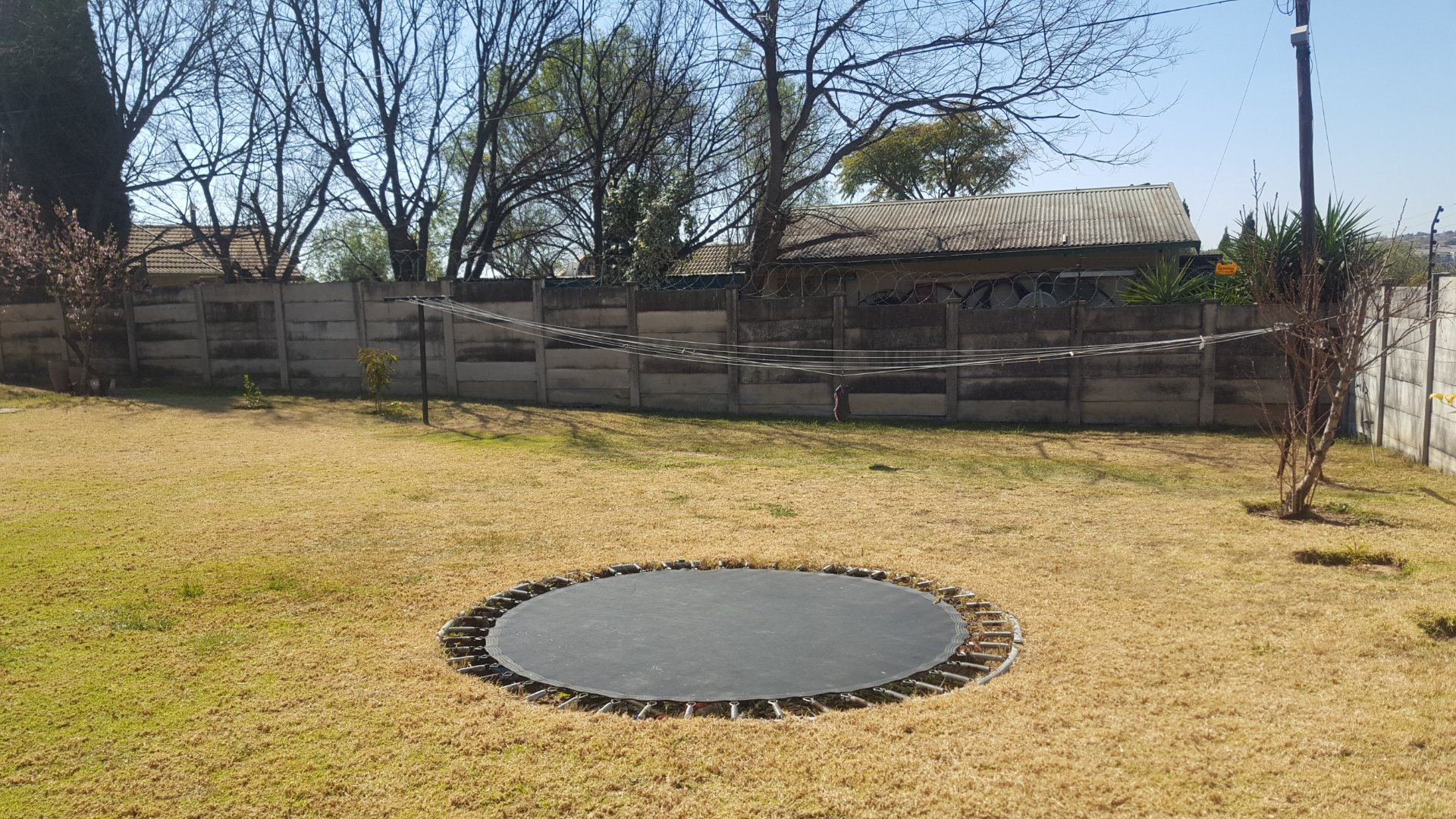 The inclusion of a jungle gym and a trampoline adds a playful touch for families with children.