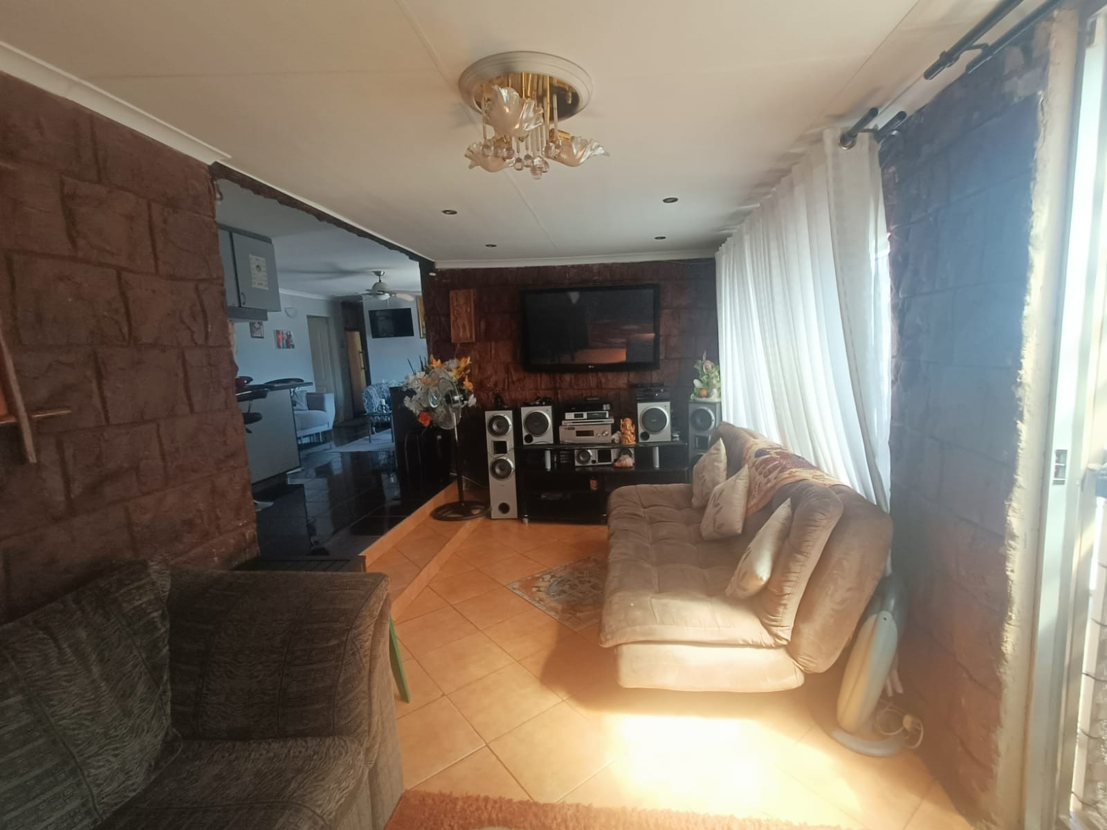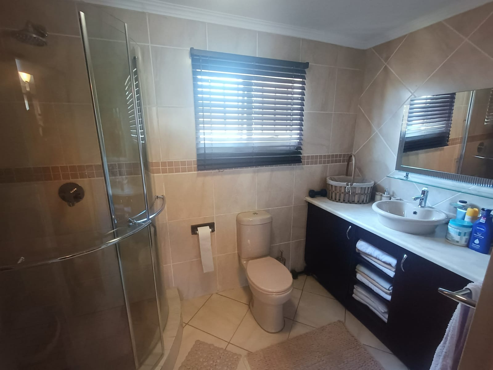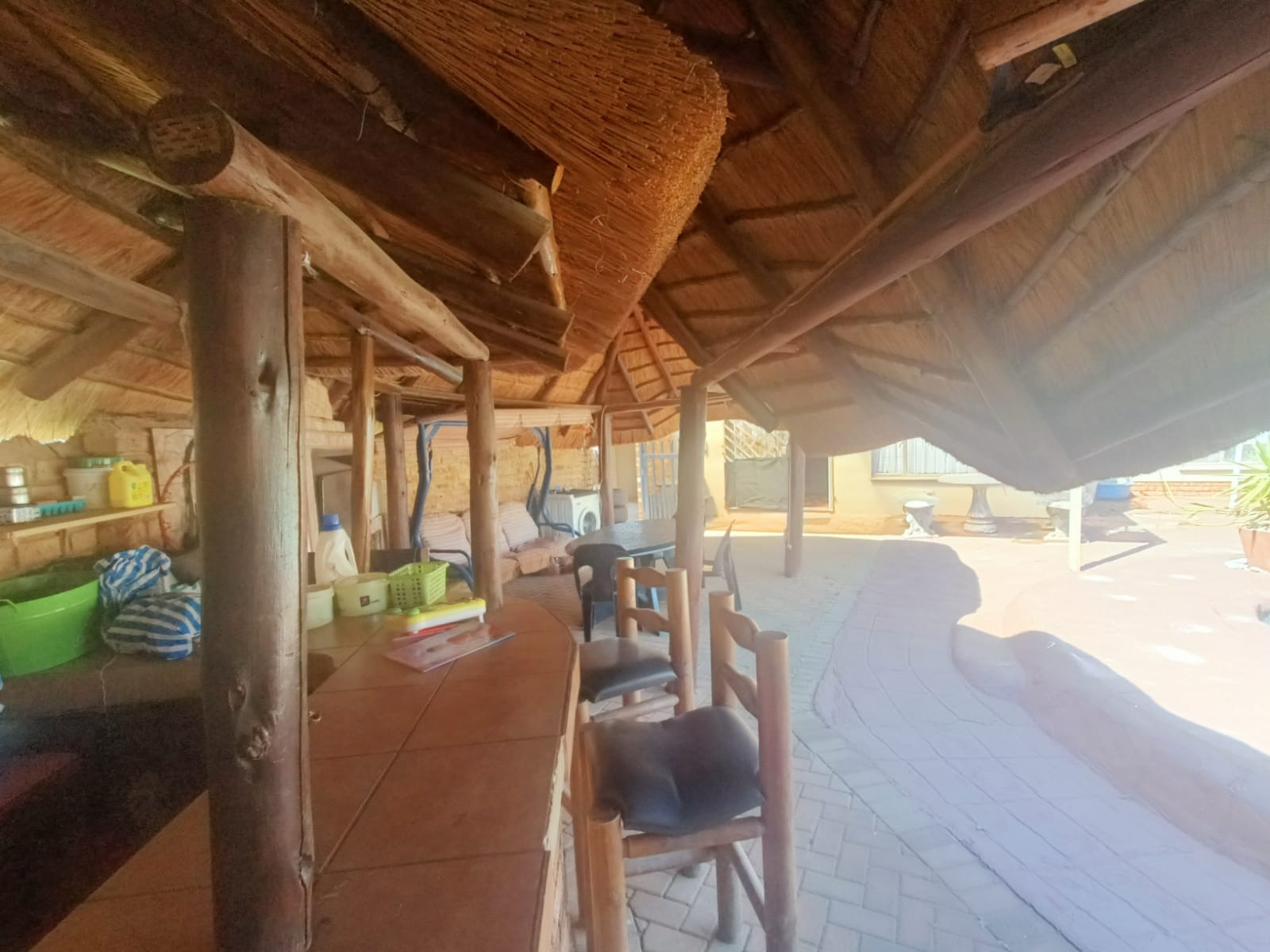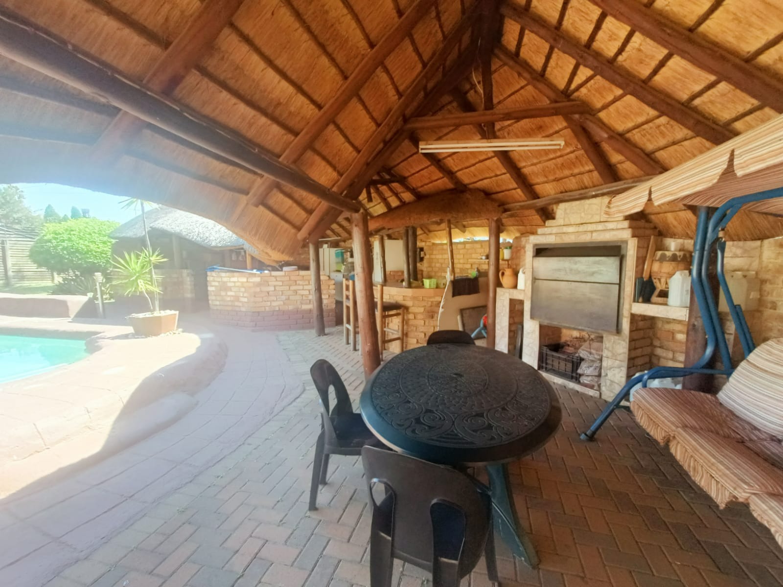 Modern-looking kitchen with ample cupboards and a breakfast nook. Open-plan living areas from where you can walk through to an entertainment area with a sparkling pool and lapa.