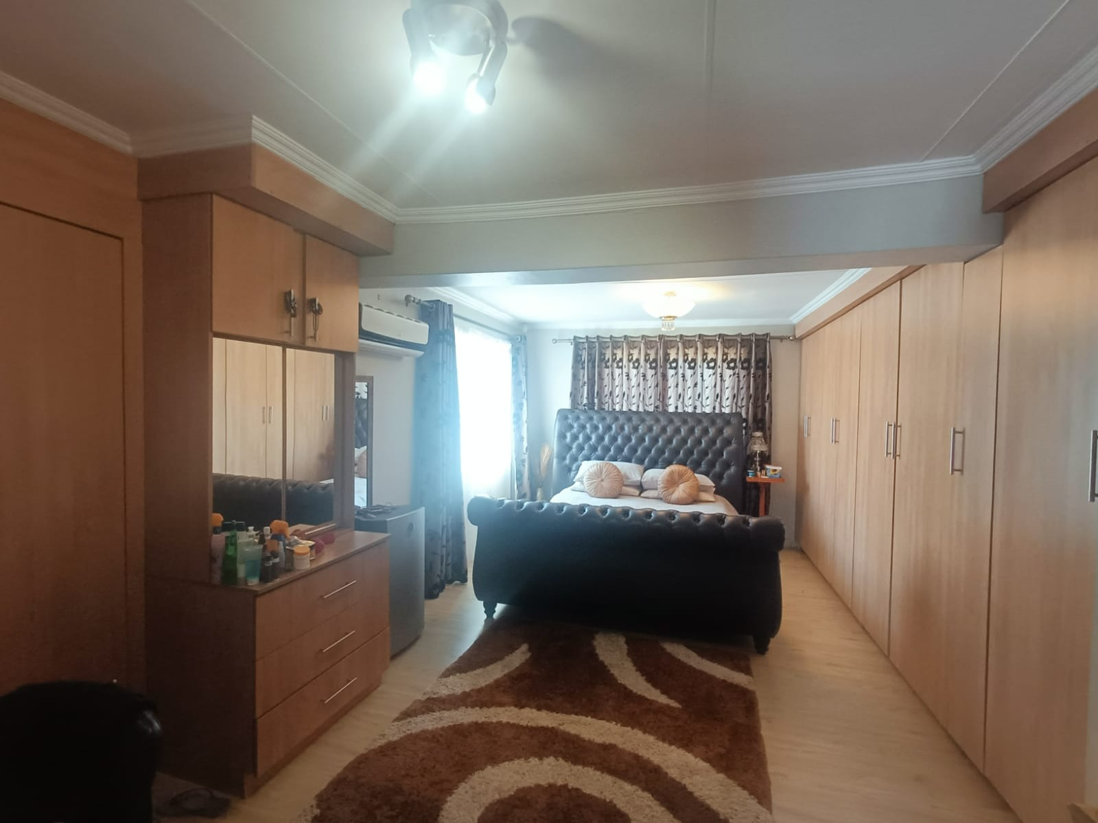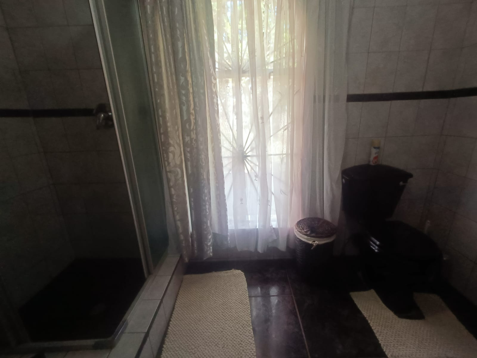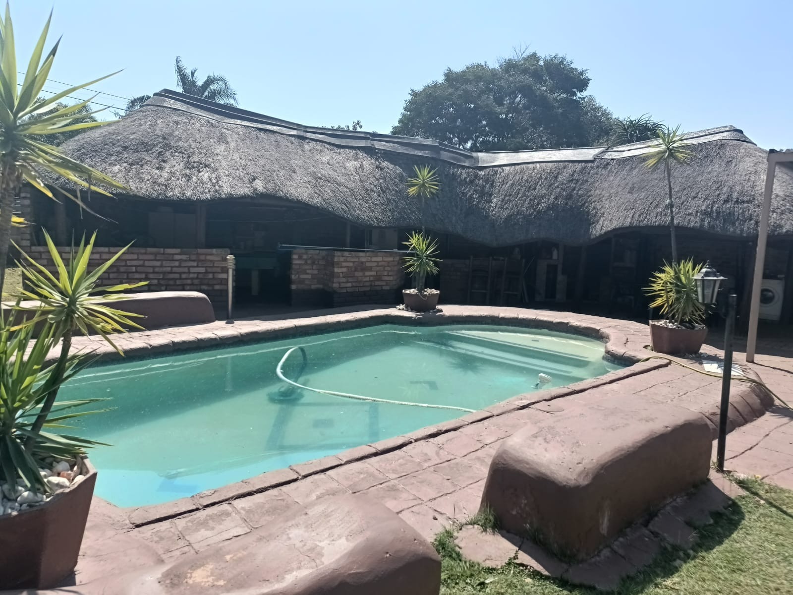 Modern-looking kitchen with ample cupboards and a breakfast nook. Open-plan living areas from where you can walk through to an entertainment area with a sparkling pool and lapa.