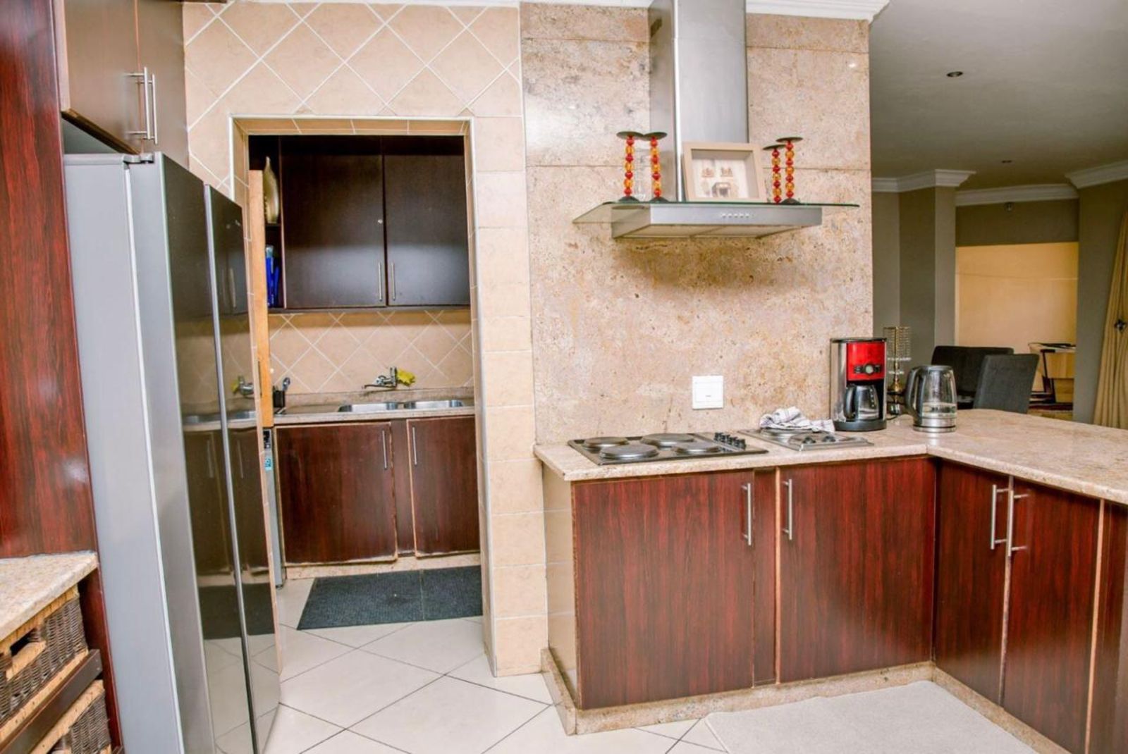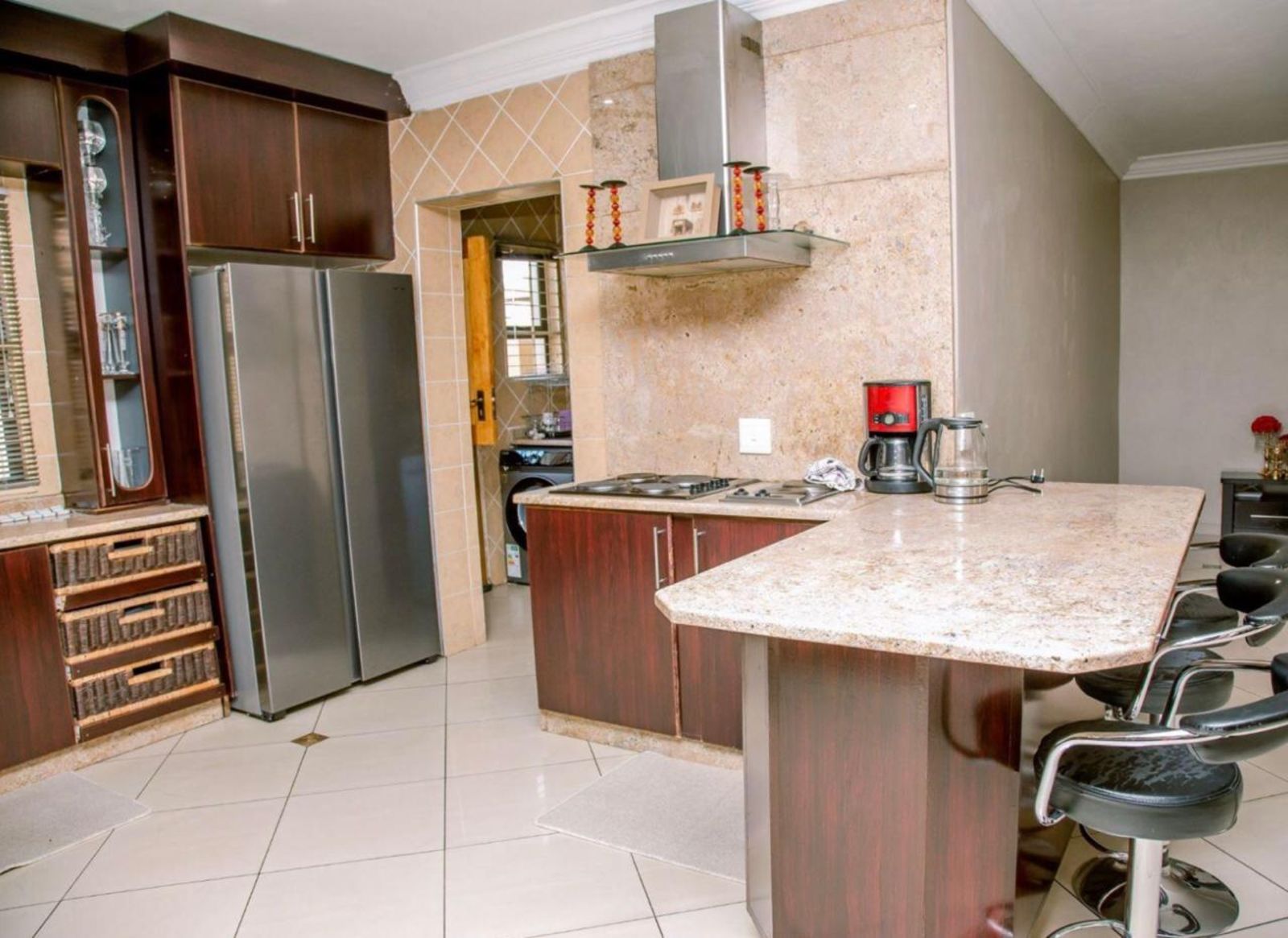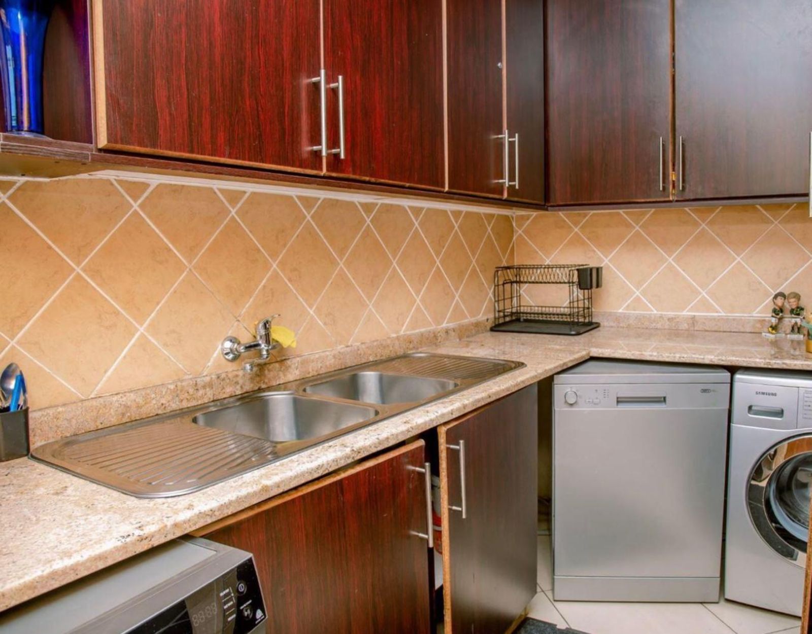 The contemporary kitchen is both stylish and functional, featuring granite countertops, a pantry, gas hob, eye-level oven, and space for a double-door refrigerator.